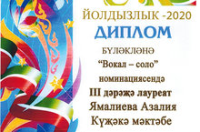 "Йолдызлык 2020" конкурсында "Вокал - соло" номинациясендә Ямалиева Азалия 3 дәрәҗә лауреат булды һәм диплом белән бүләкләнде