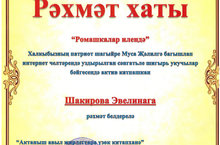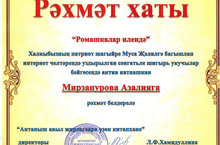 Халкыбызның патриот шагыйре Муса Җәлилгә багышлангап интернет челтәрендә уздырылган "Ромашкалар илендә" сәнгатьле шигырь укучылар бәйгесендә актив катнашкан укучыбыз Мирзанурова Азалия Рәхмәт хаты белән бүләкләнде.