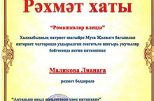 Благодарственным письмом была награждена Маликова Лиана, принимавшая активное участие в конкурсе чтецов художественной поэзии "В стране ромашек", посвященном патриотическому поэту нашего народа Мусе Джалилю, проводимом в сети интернет.