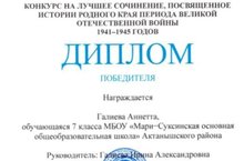 Поздравляем ученицу 7 класса Галиеву Аннетту,которая стала победителем в конкурсе на лучшее сочинение ,посвященное истории родного края периода Великой Отечественной Войны 1941-1945 годов.