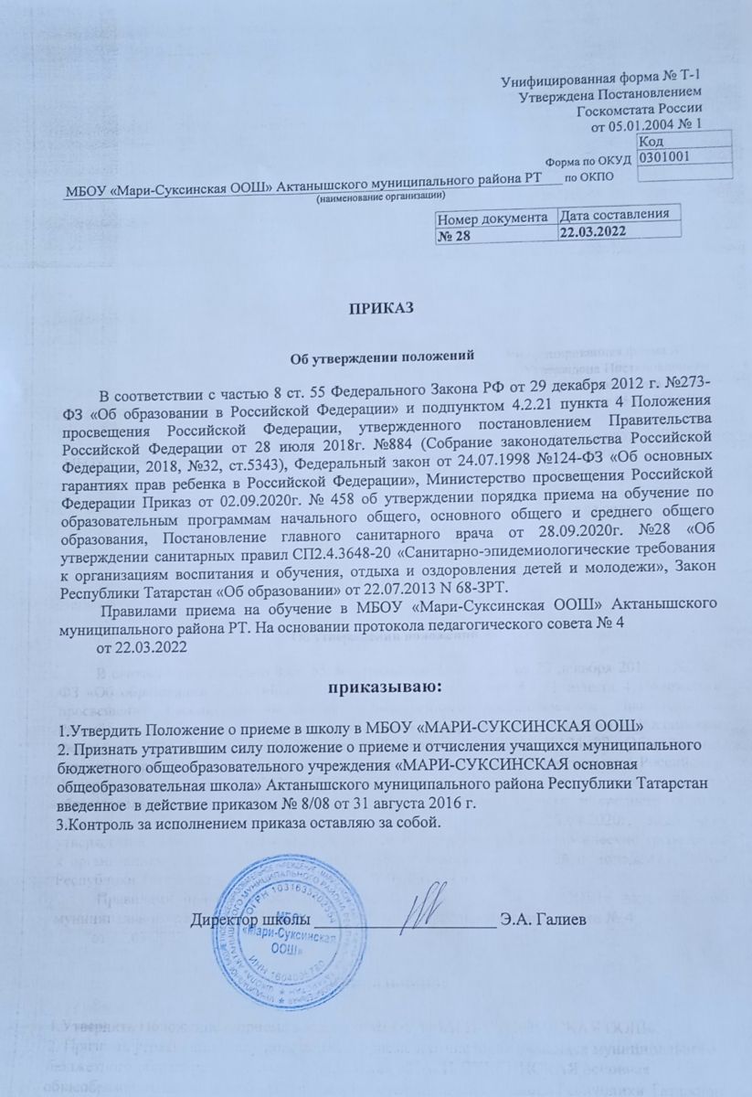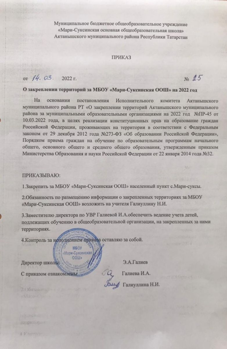 Приказ о закреплении территорий за МБОУ "Мари-Суксинская ООШ" на 2022 год