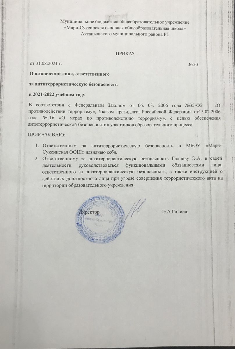 Приказ о назначении ответственного лица за антитеррористическую безопасность