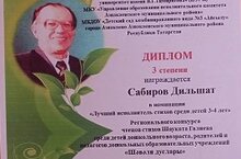 Бакчабызда йөрүче Сабиров Дильшат, Миргаязова Нурия, Сахаутдинова Амалия "Шәвәли дуслары" дип аталган региональ конкурсның "Лучший исполнитель стихов" номинациясендә 3 урынга ия булдылар.