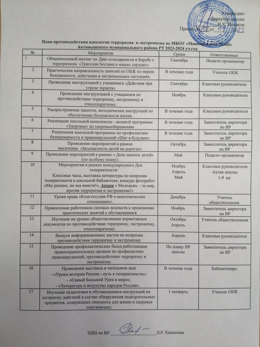 План противодействия идеологии терроризма и экстремизма по МБОУ "Минняровская ООШ" на 2023-24 уч.год