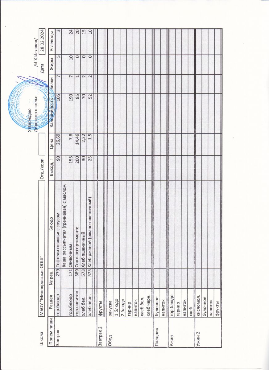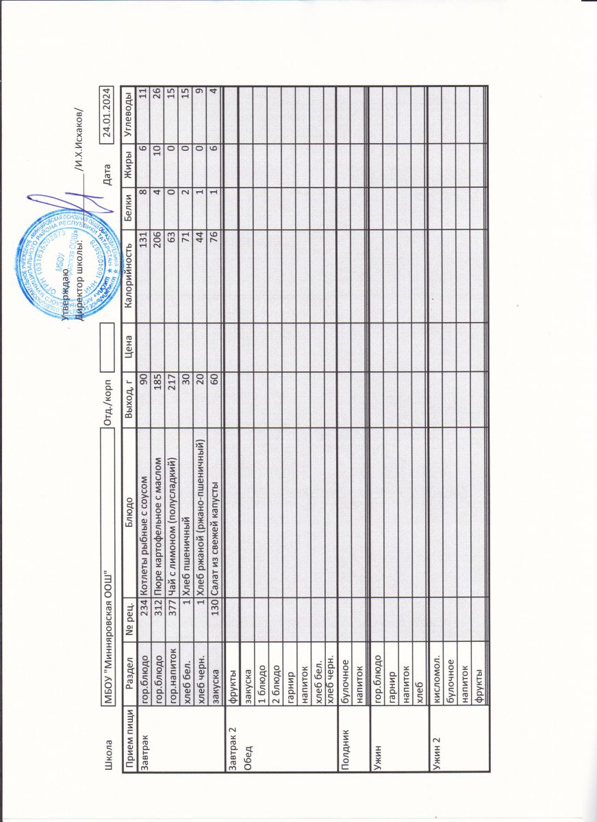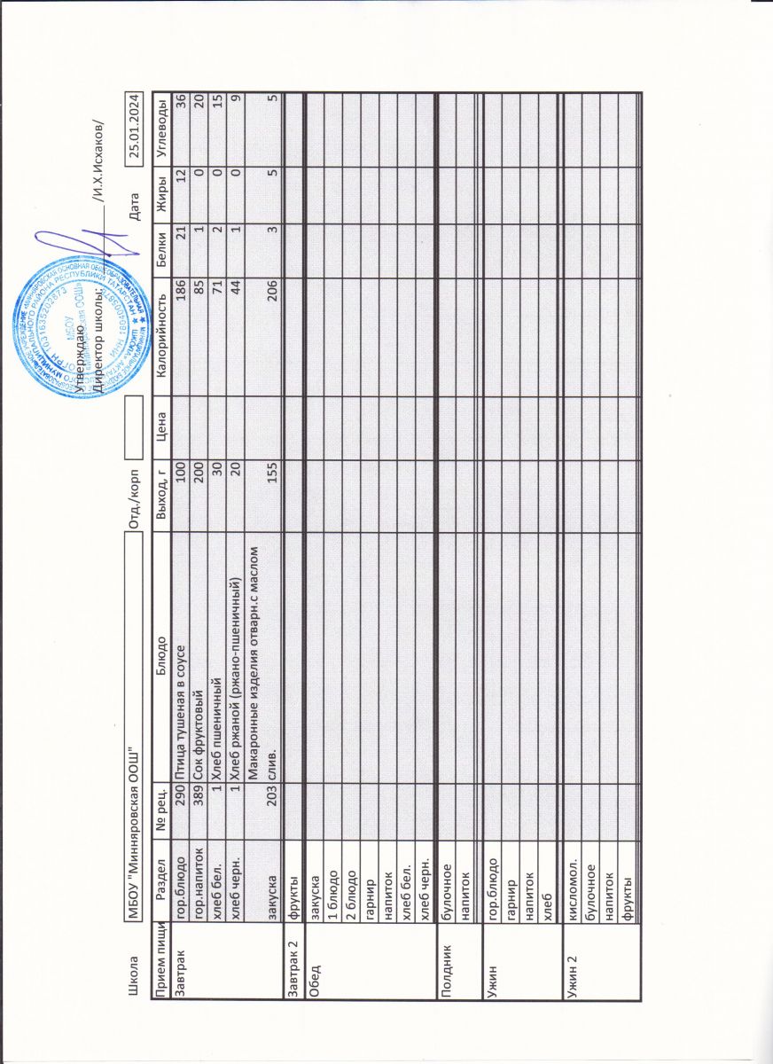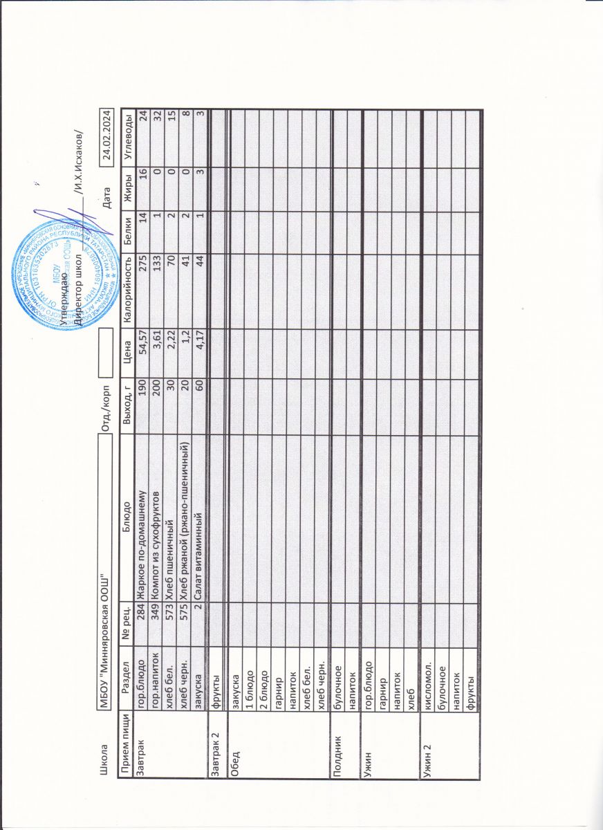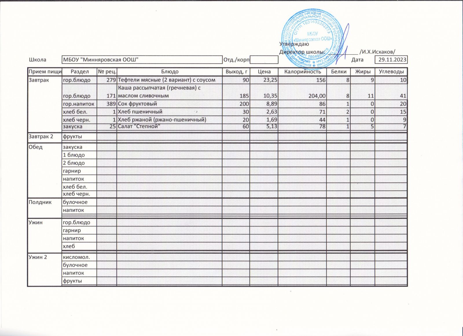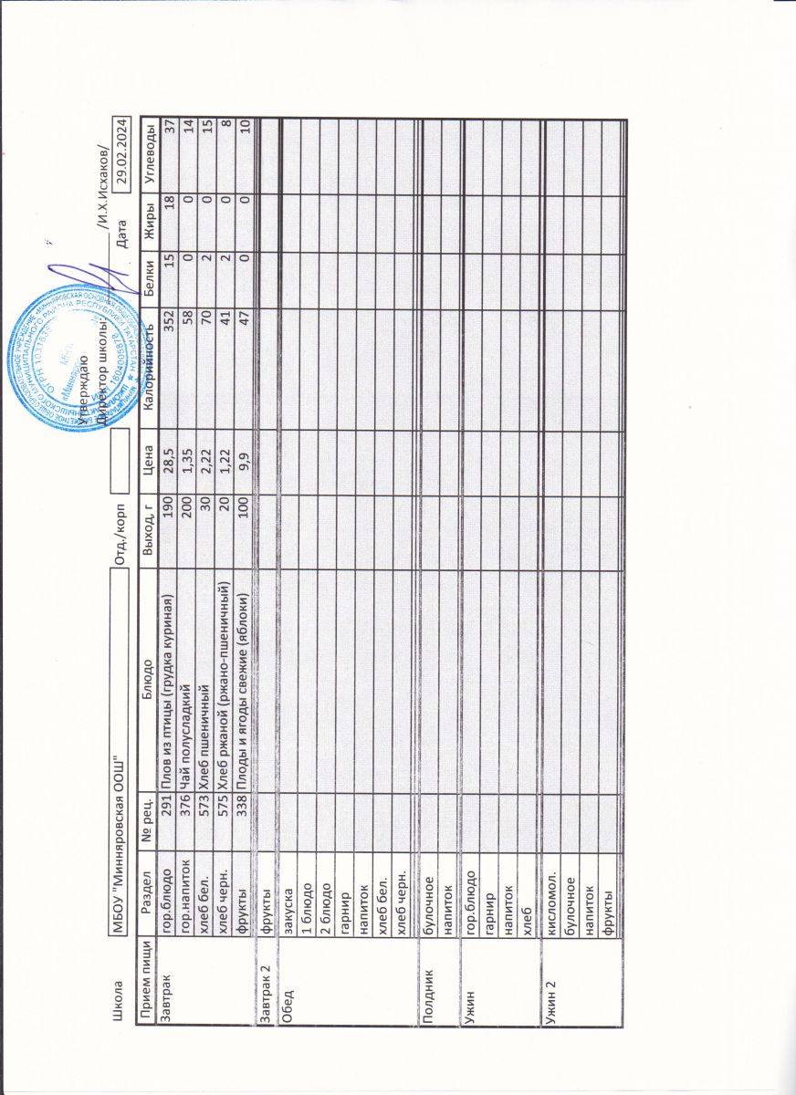 Меню МБОУ "Минняровская ООШ" на 24.11.2020г