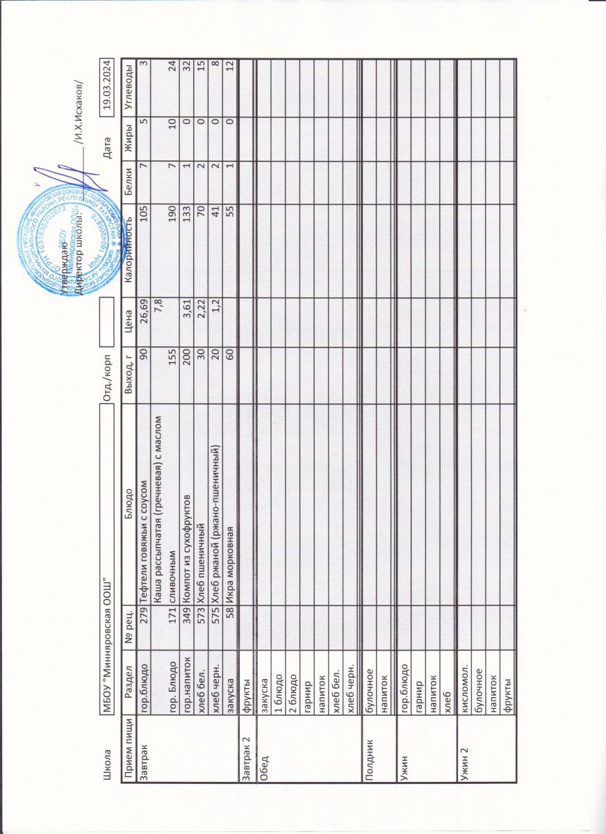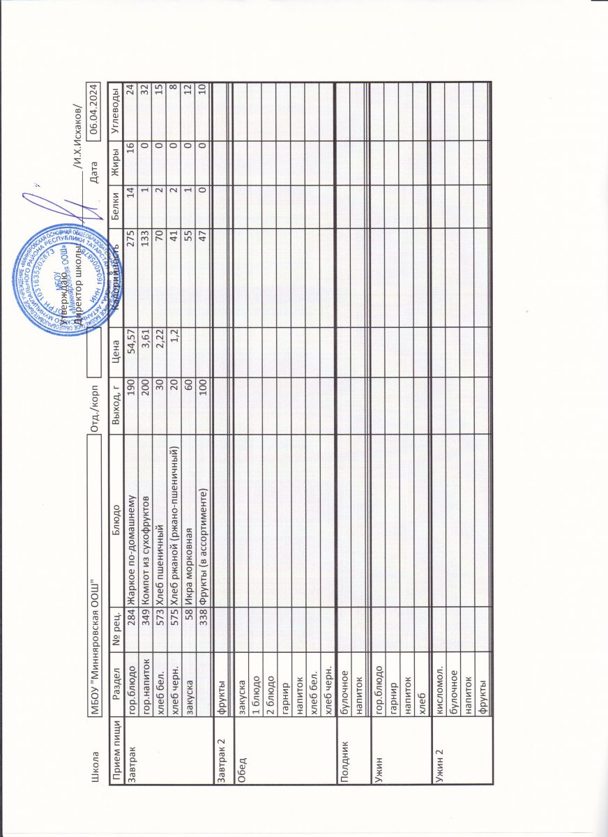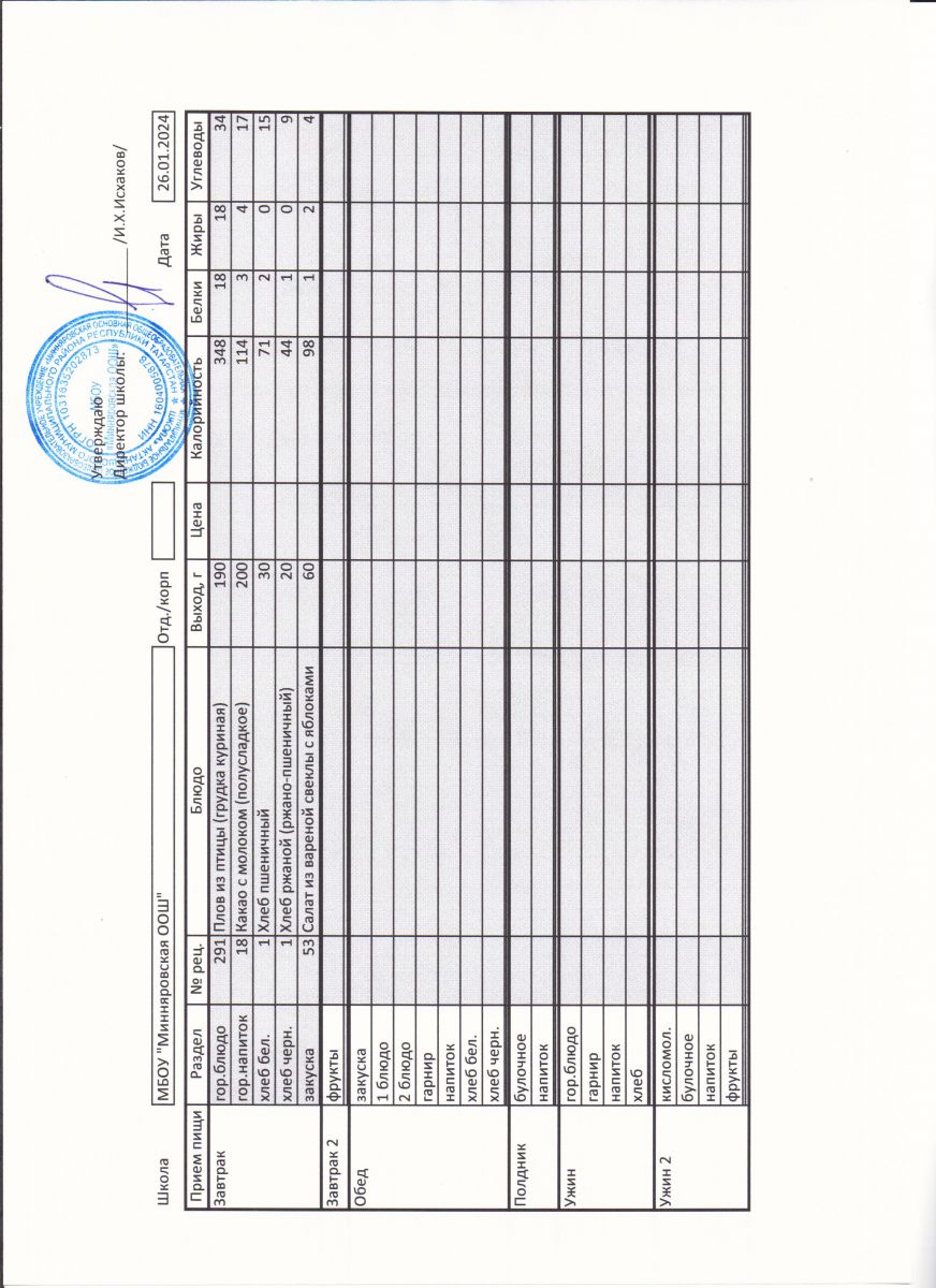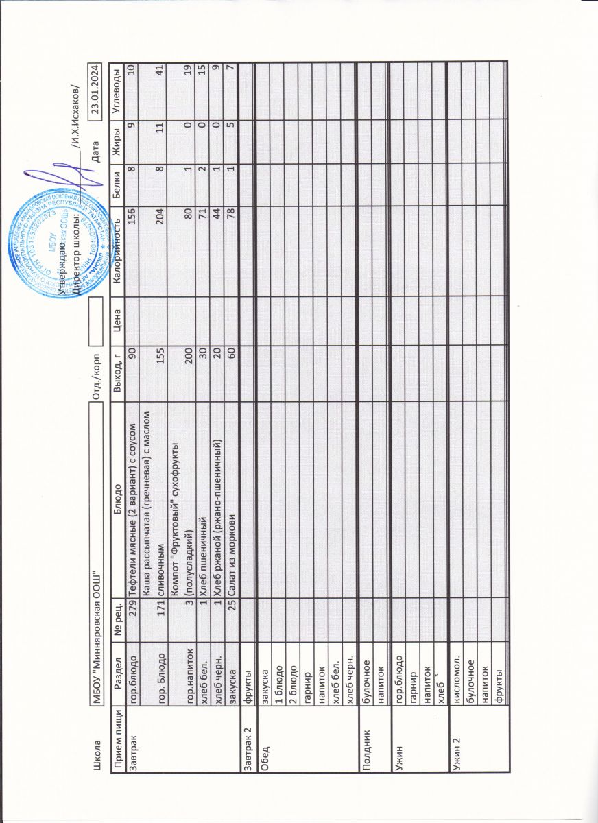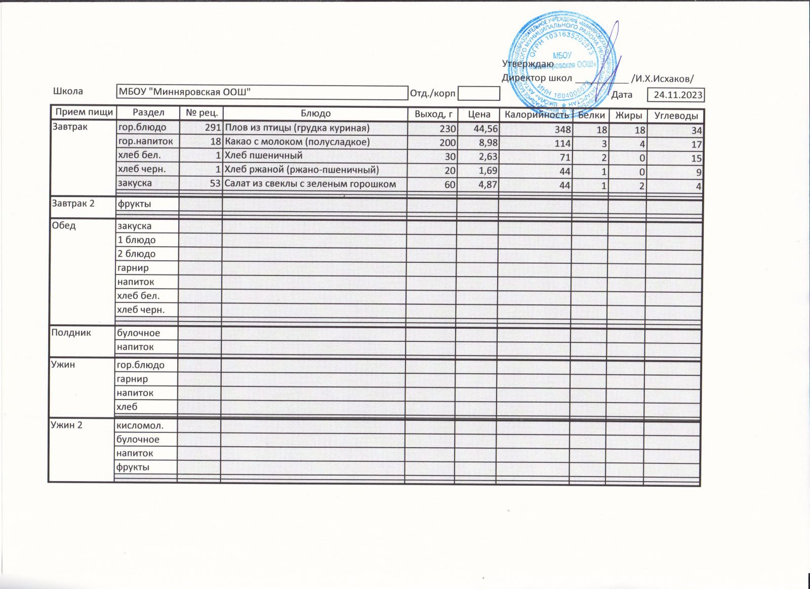 Меню МБОУ "Минняровская ООШ" на 24.11.2020г