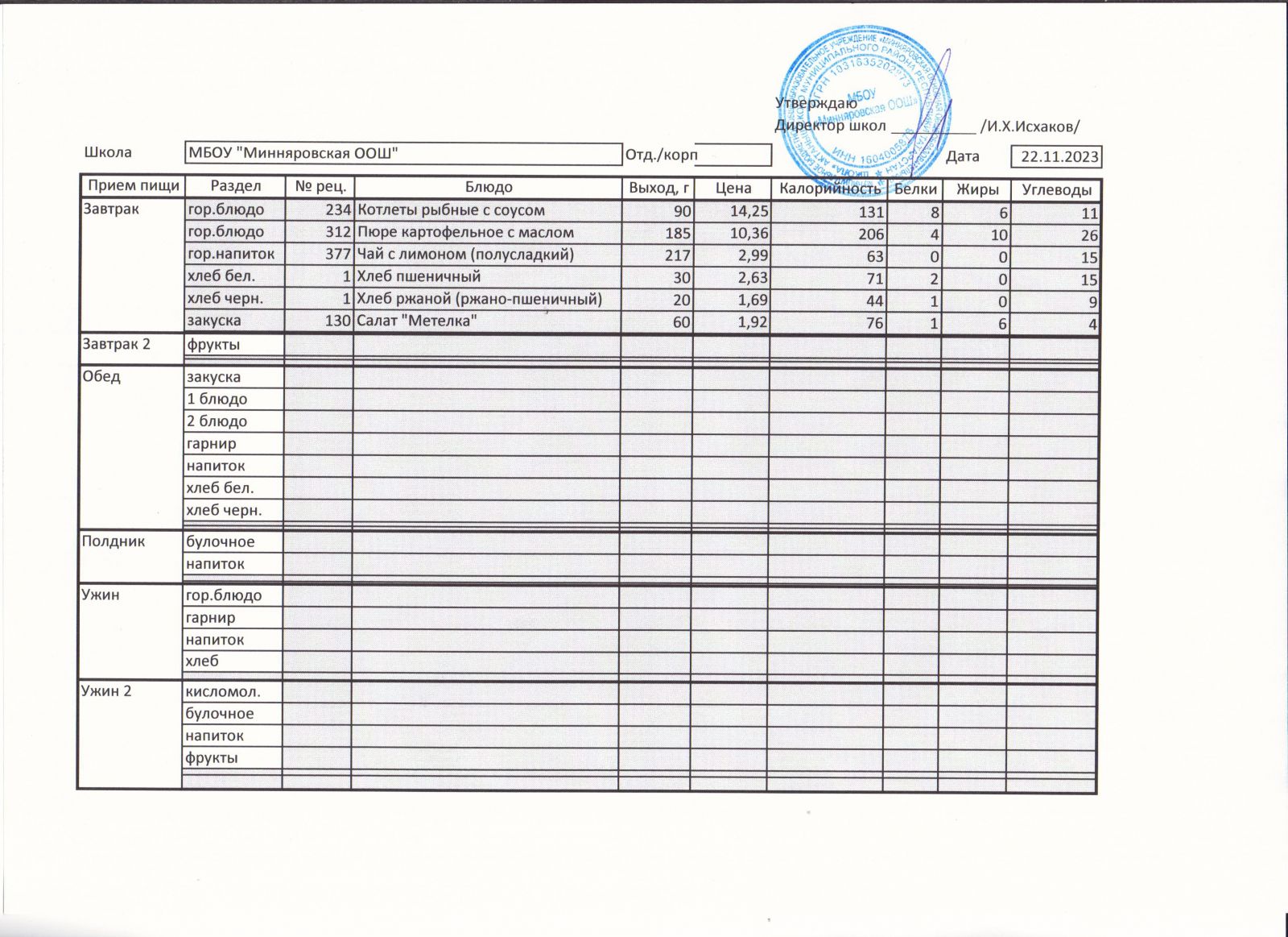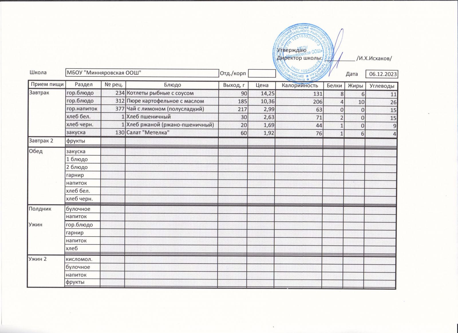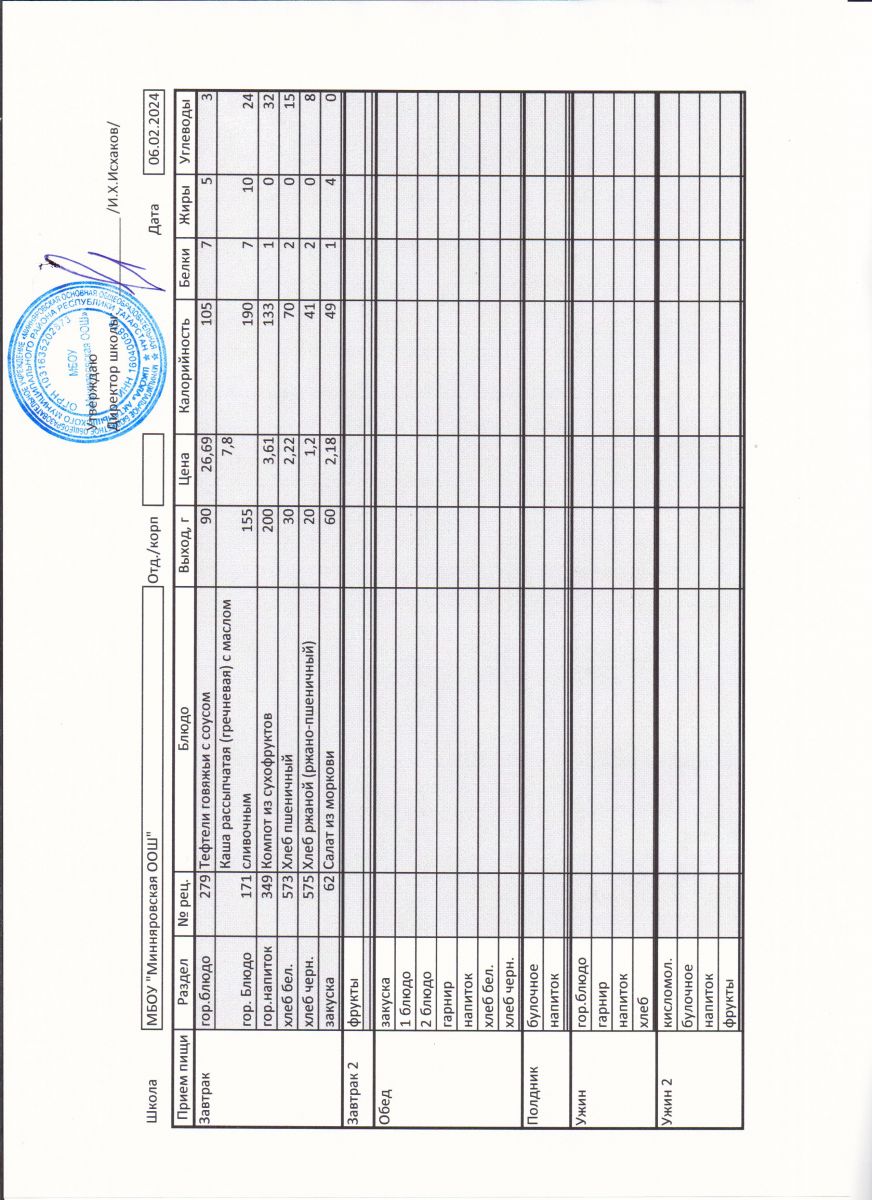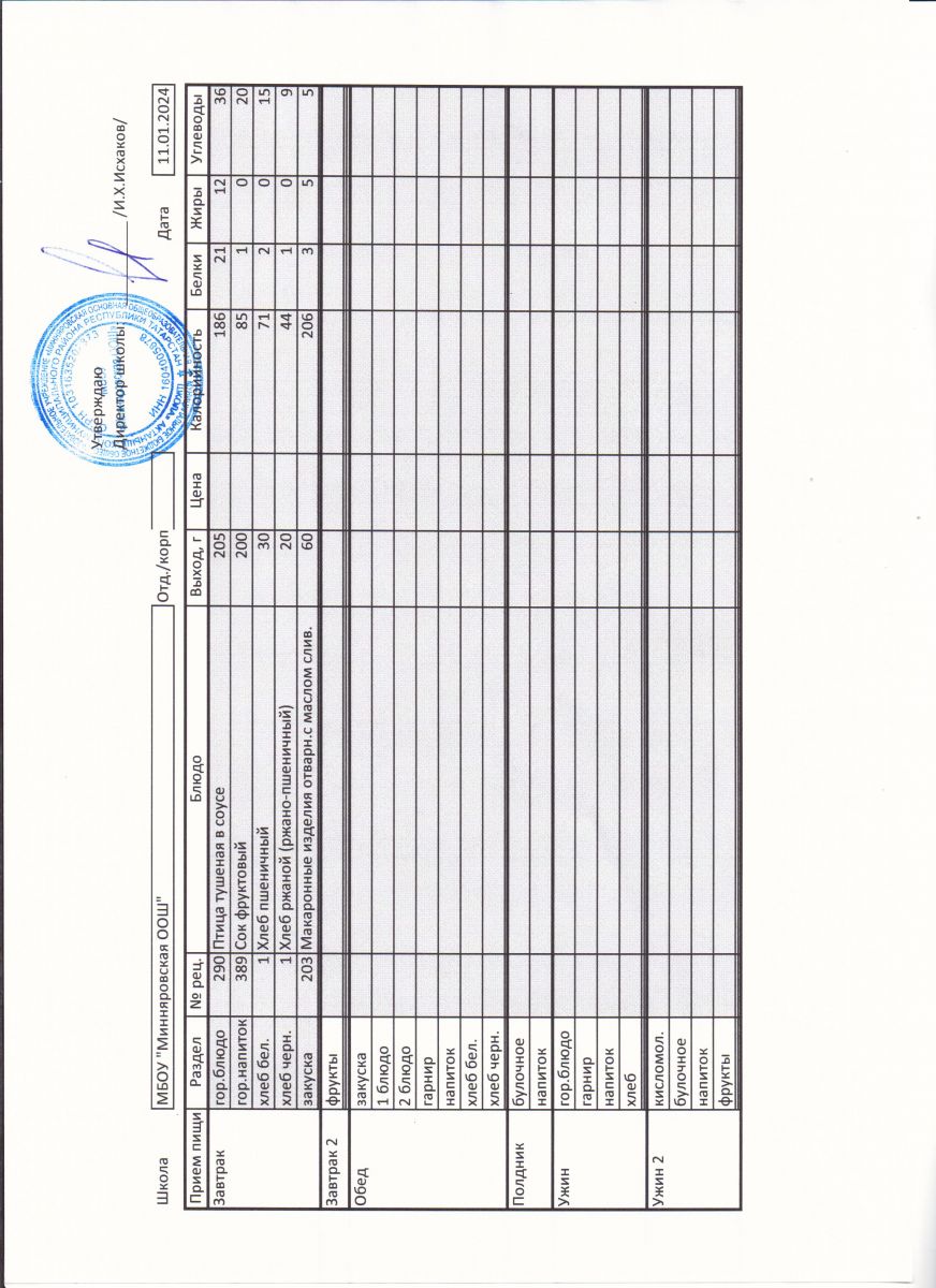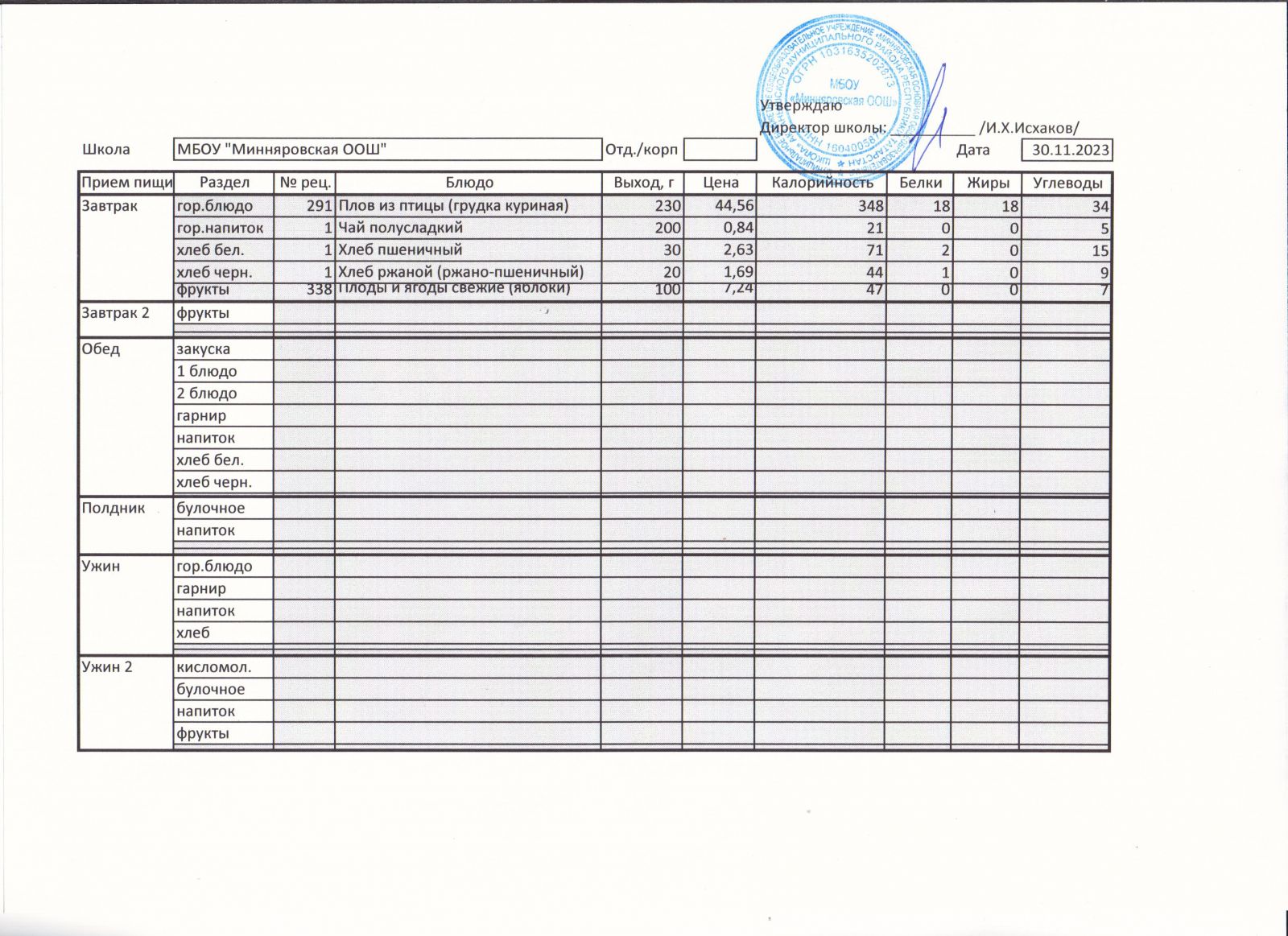 Меню МБОУ "Минняровская ООШ" на 24.11.2020г