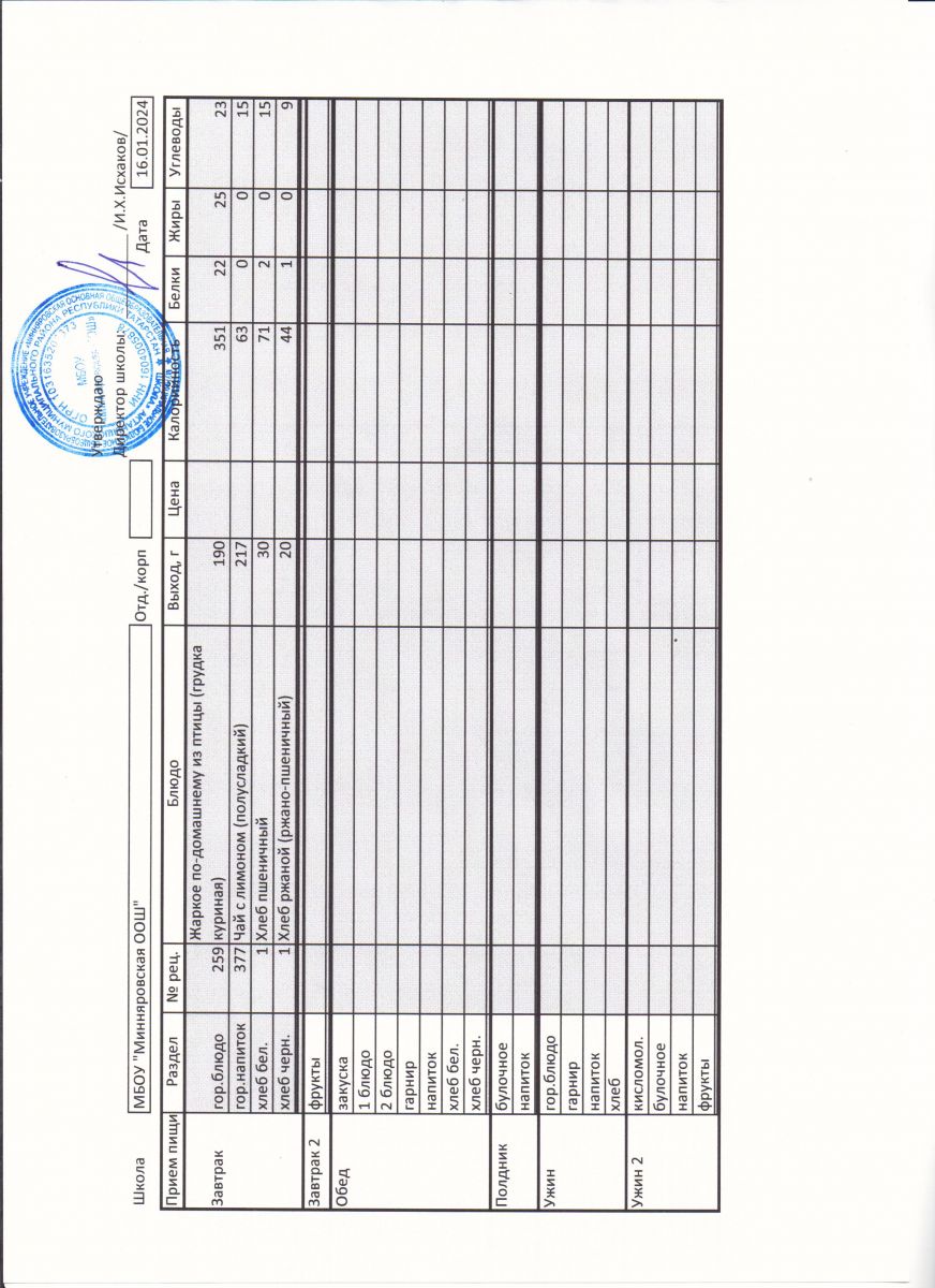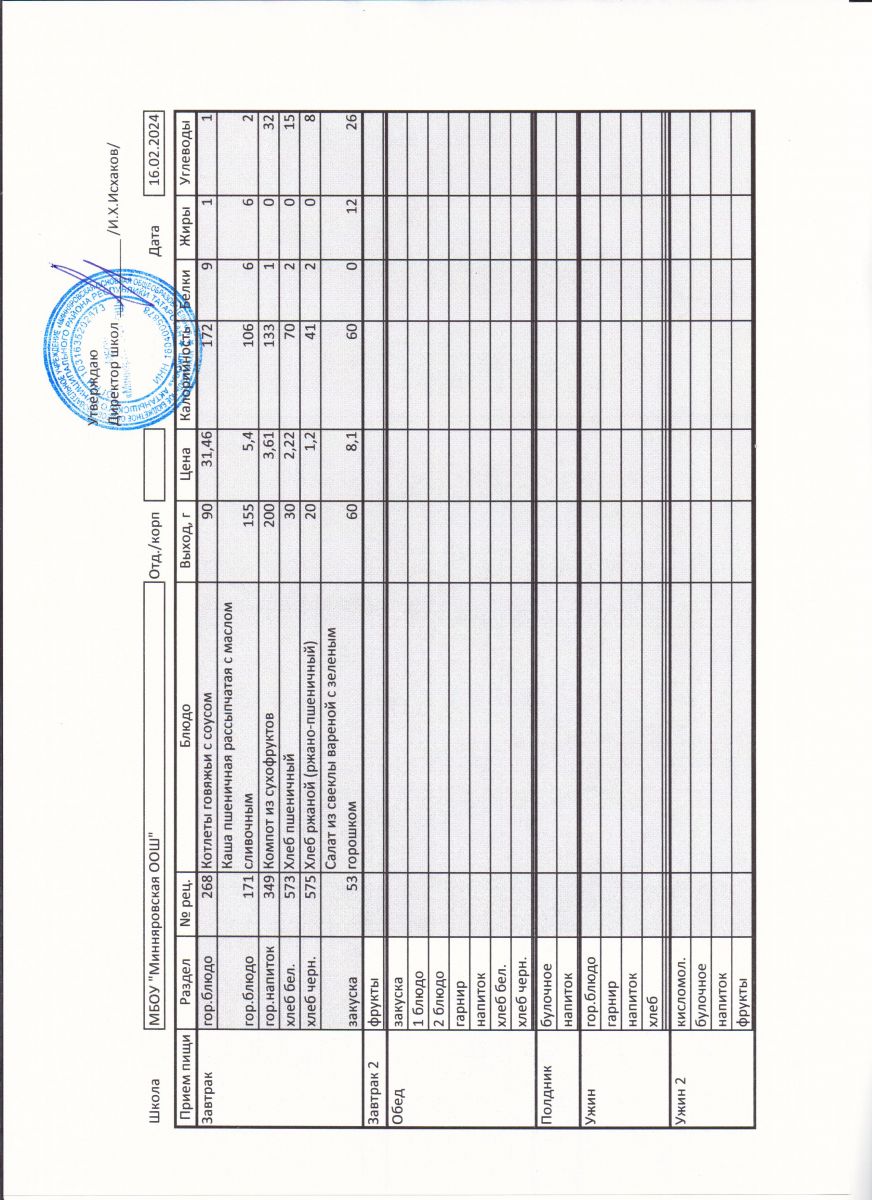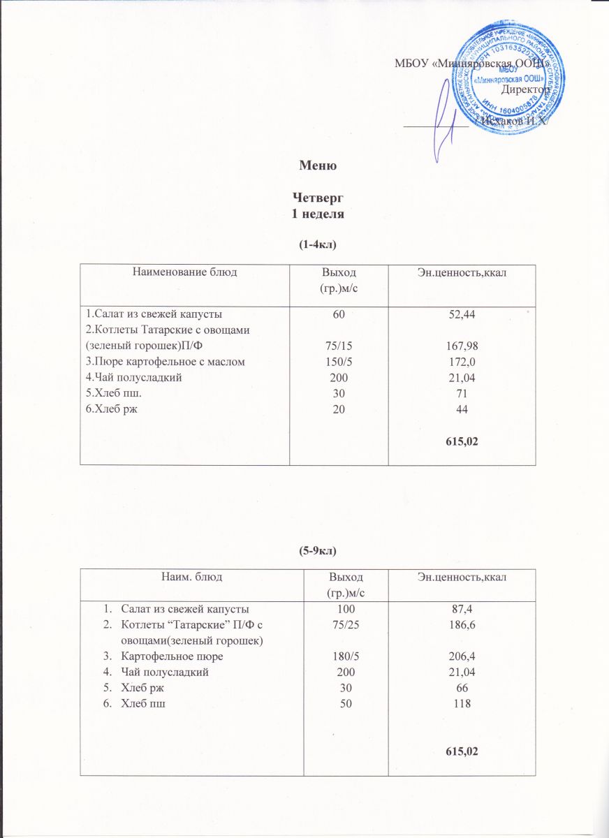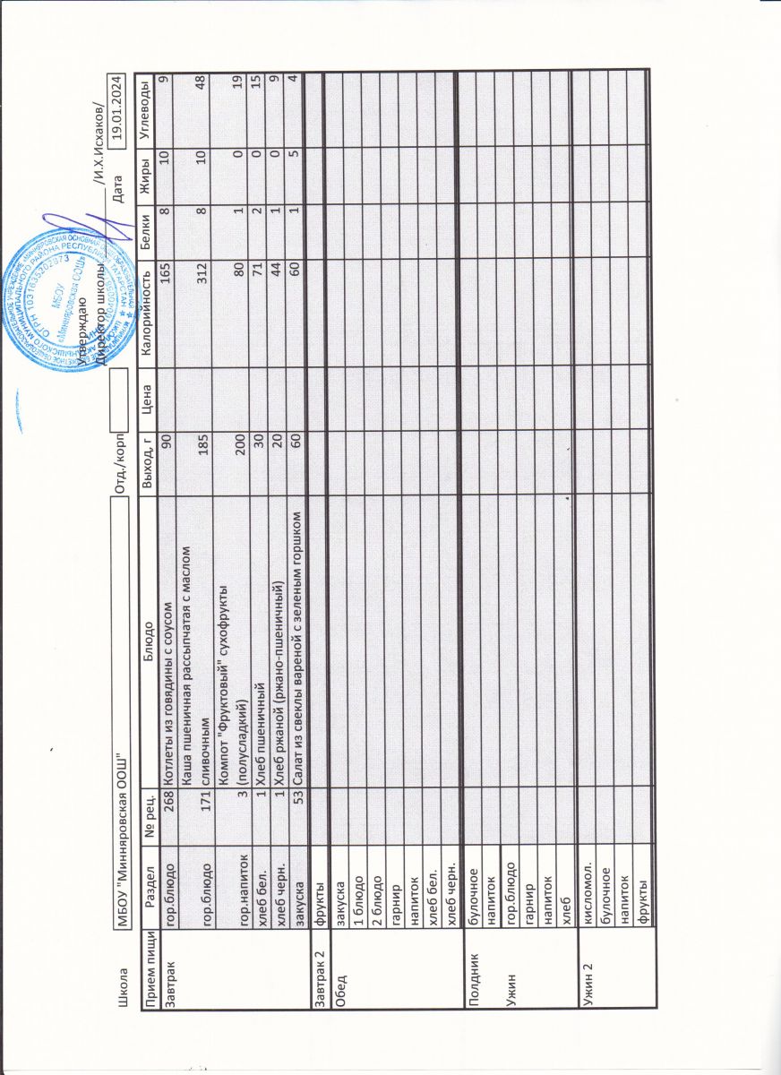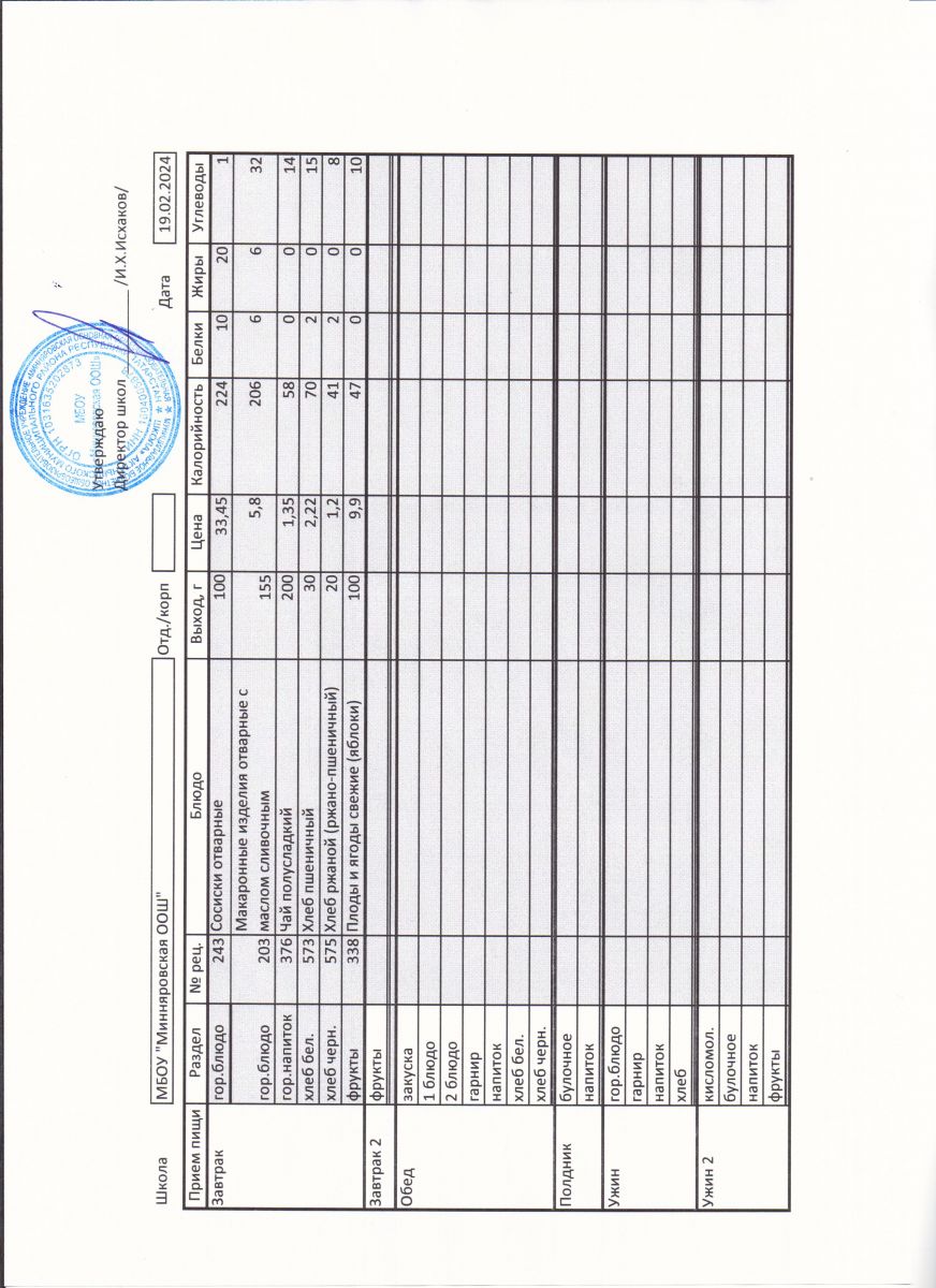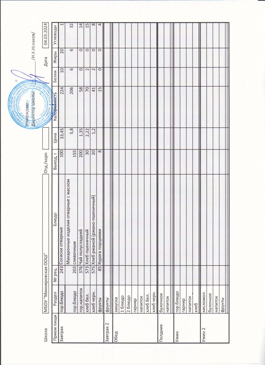 Меню МБОУ "Минняровская ООШ" на 24.11.2020г