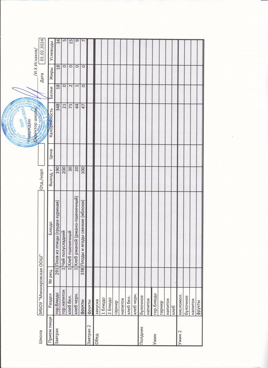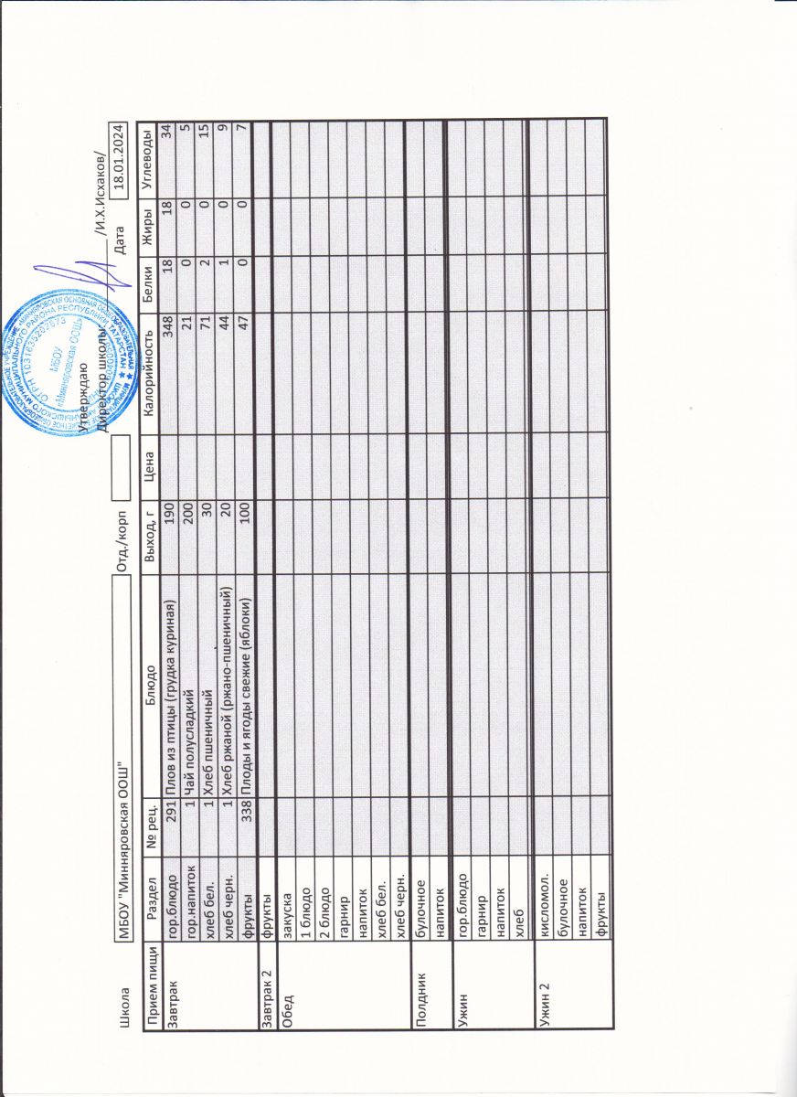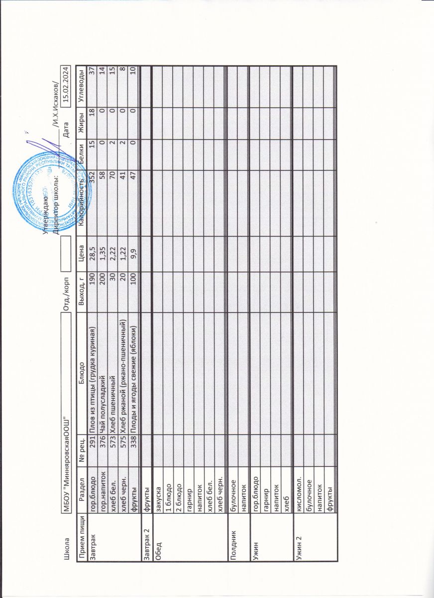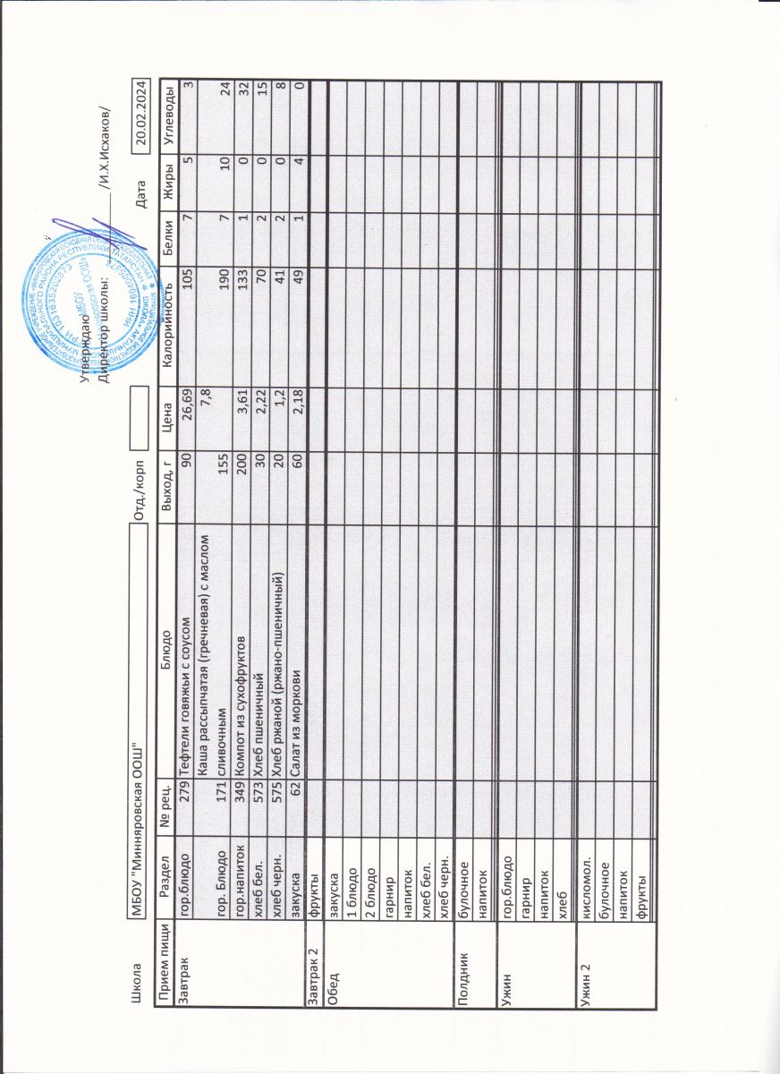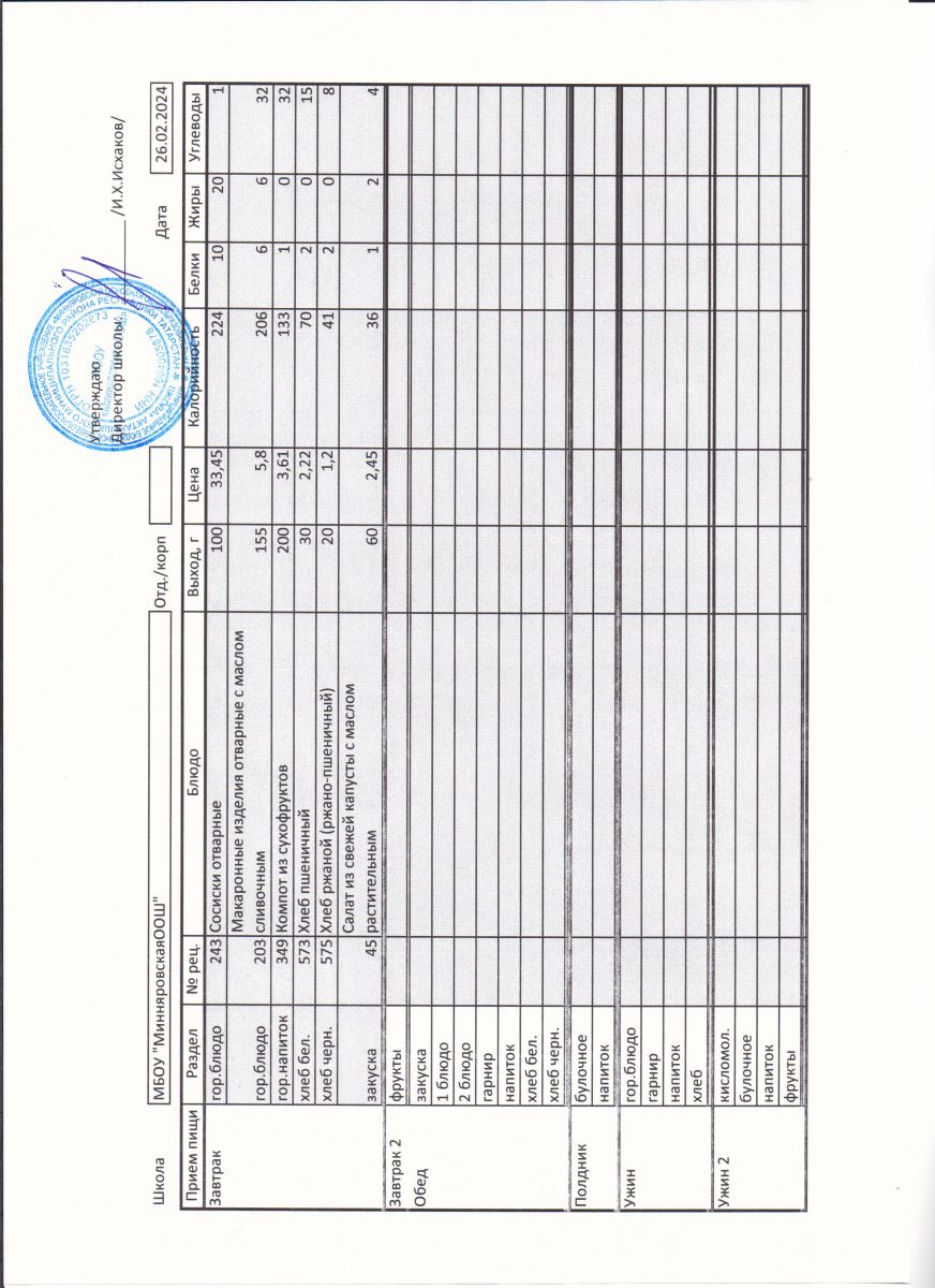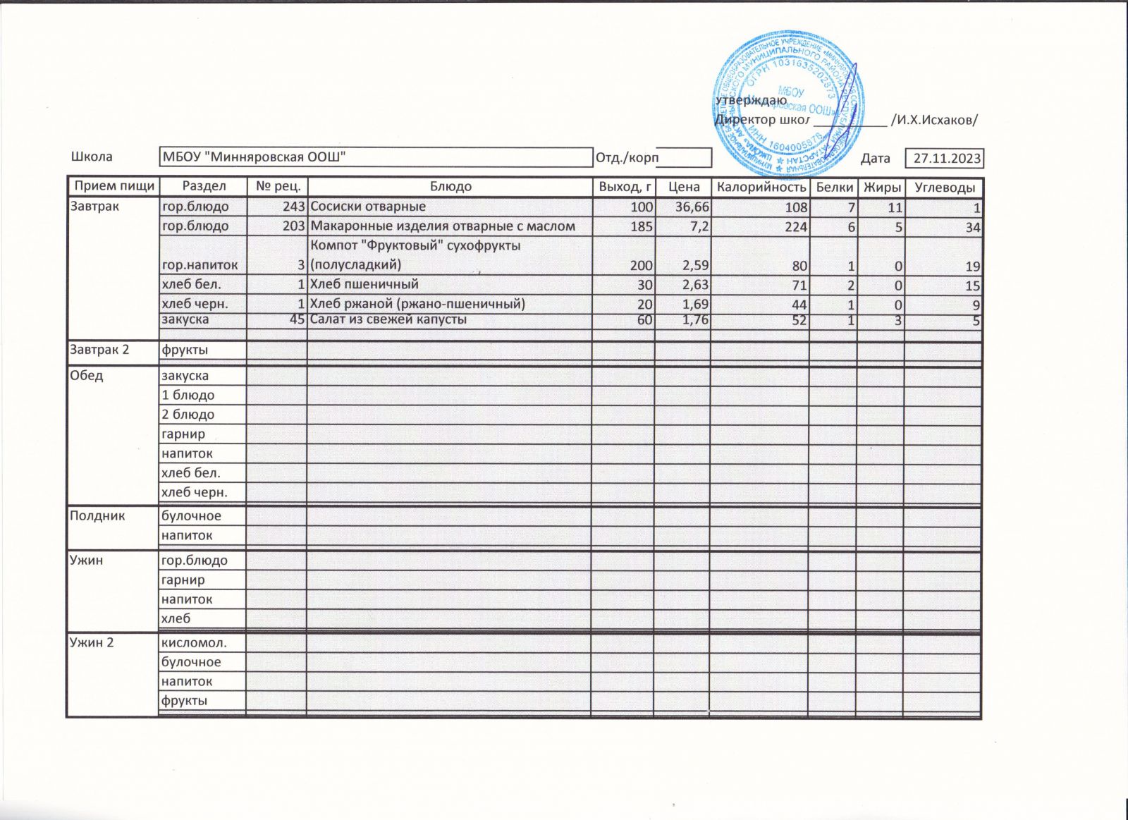 Меню МБОУ "Минняровская ООШ" на 24.11.2020г
