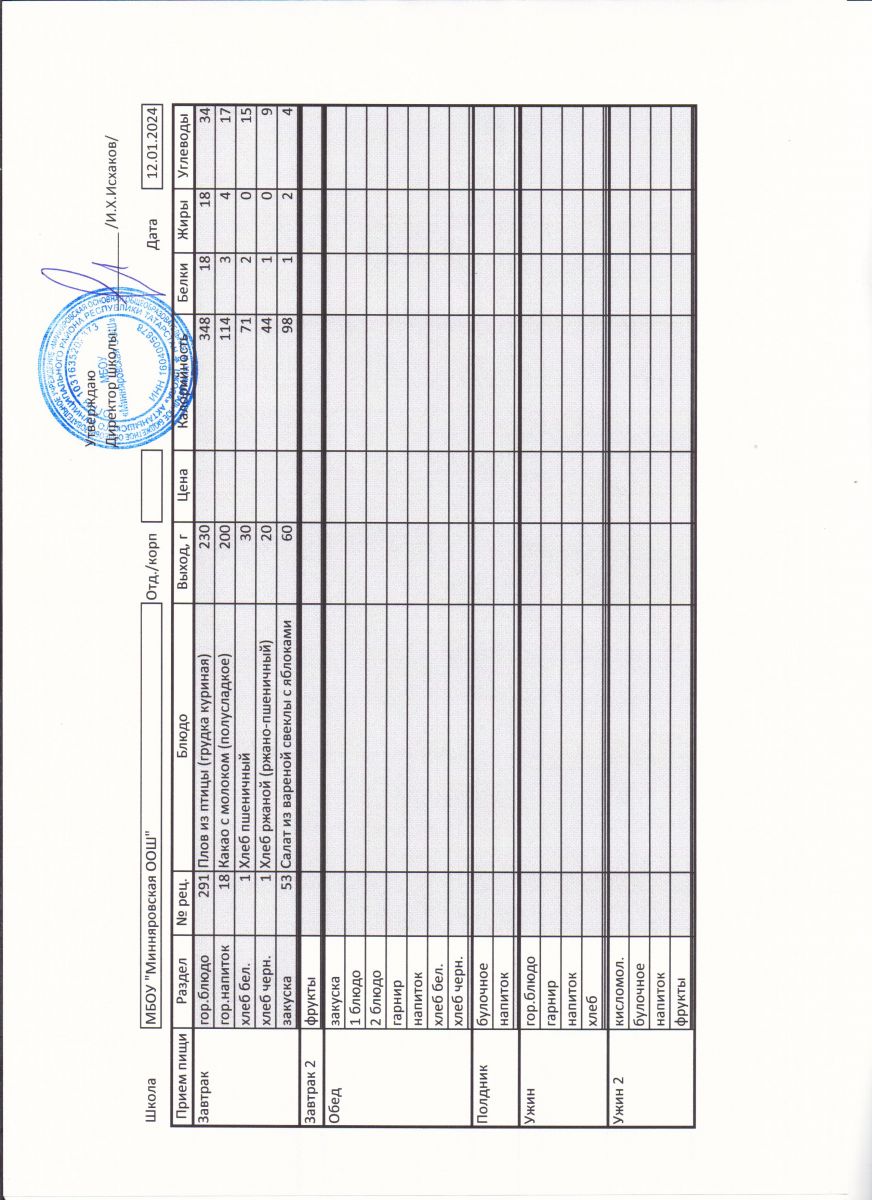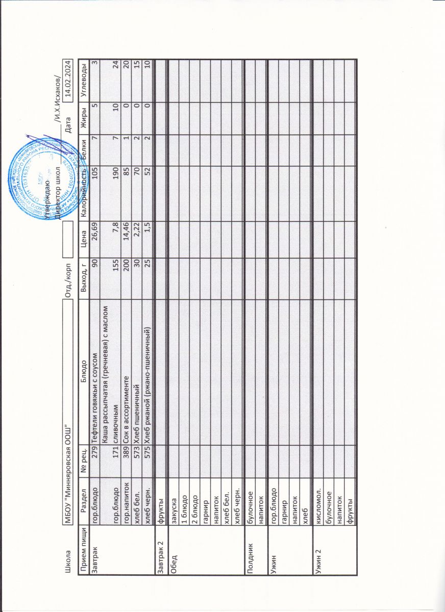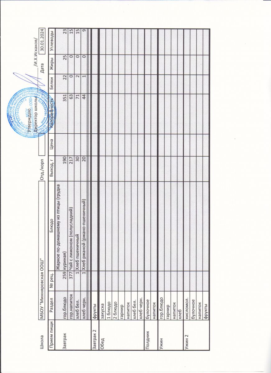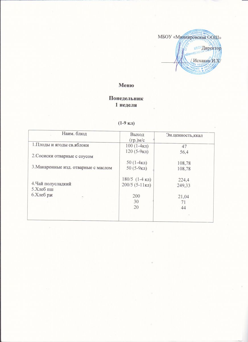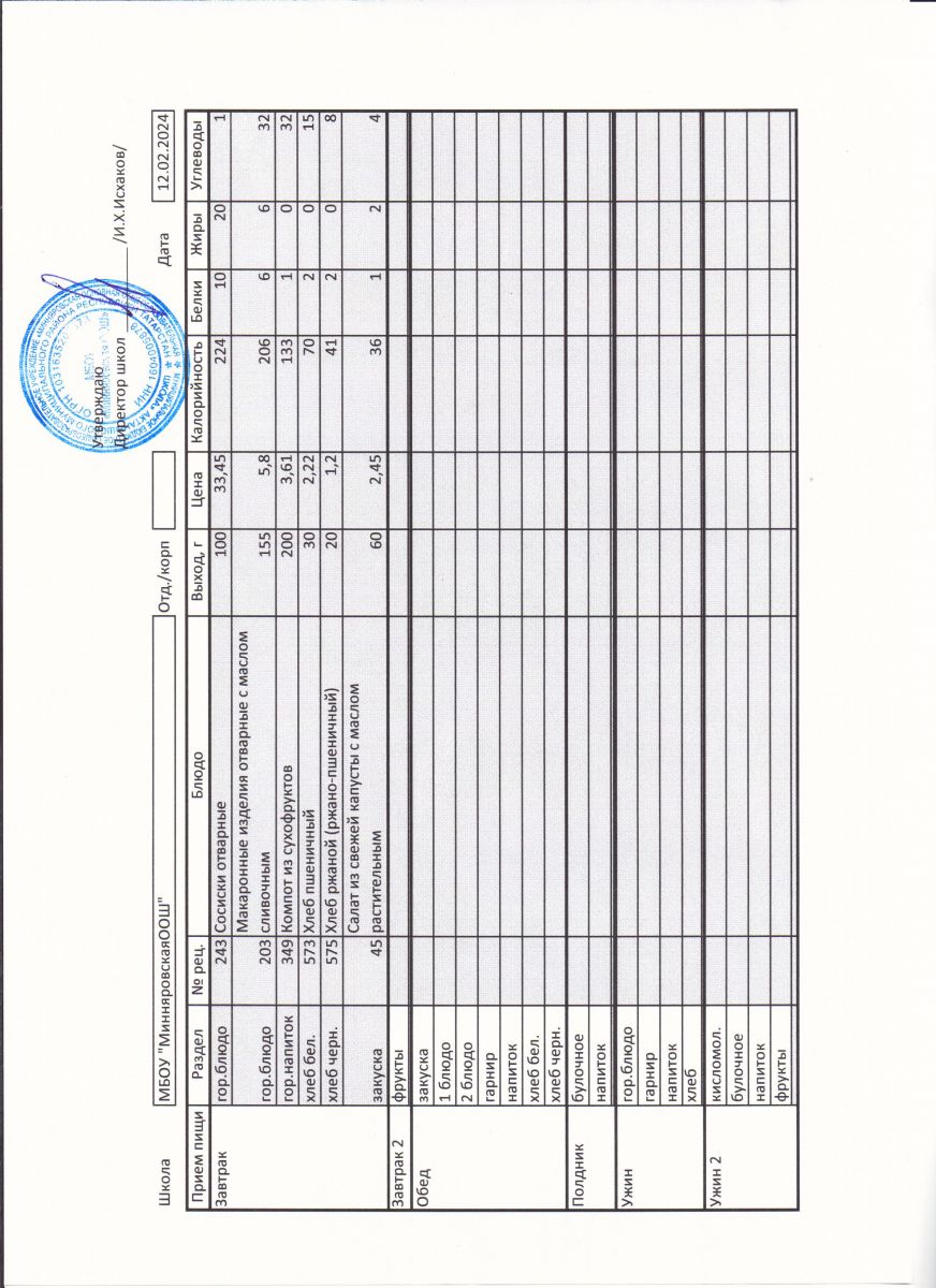 Меню МБОУ "Минняровская ООШ" на 24.11.2020г