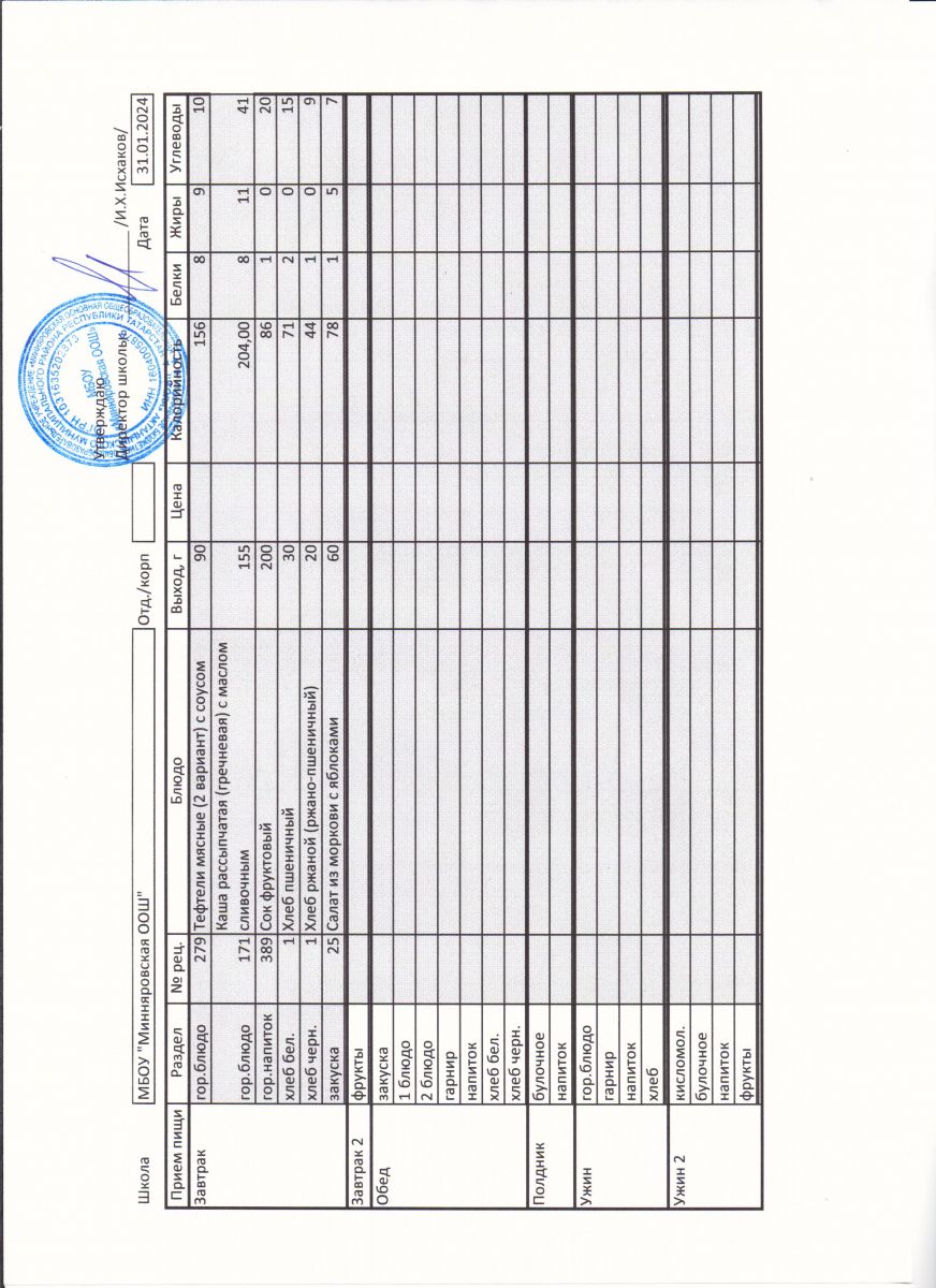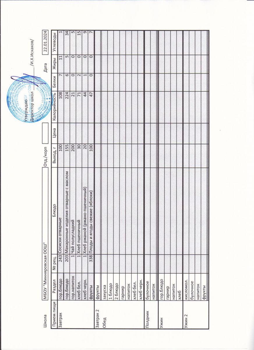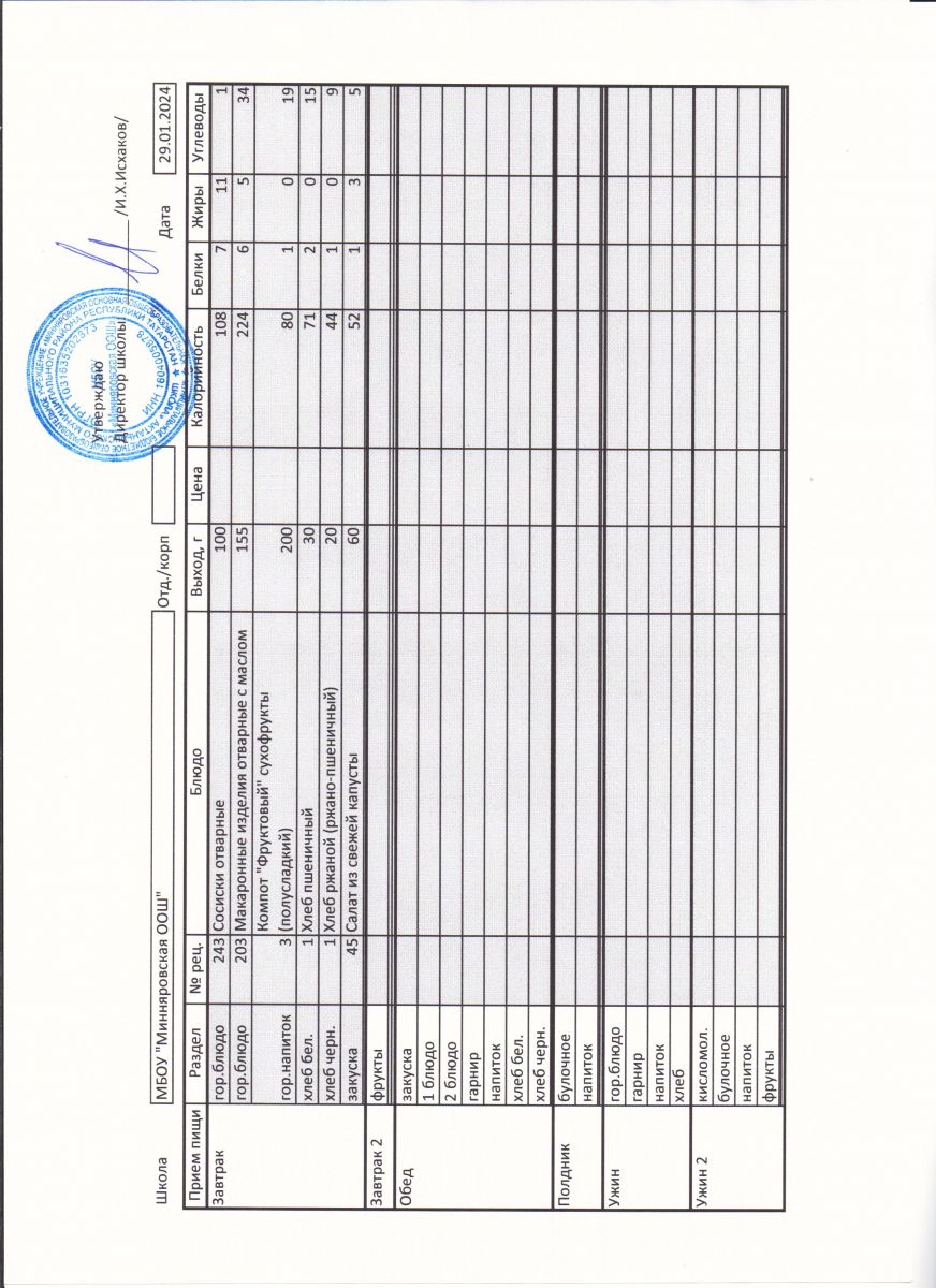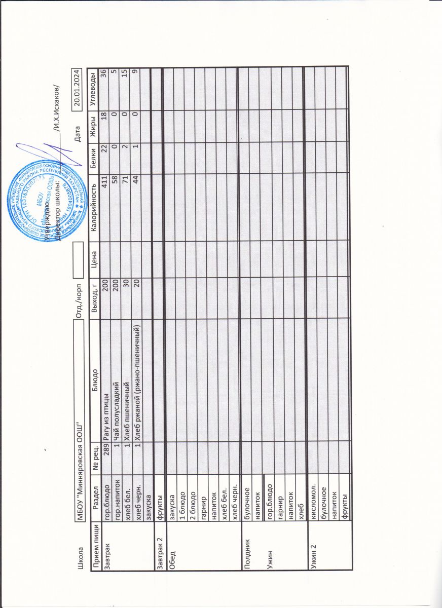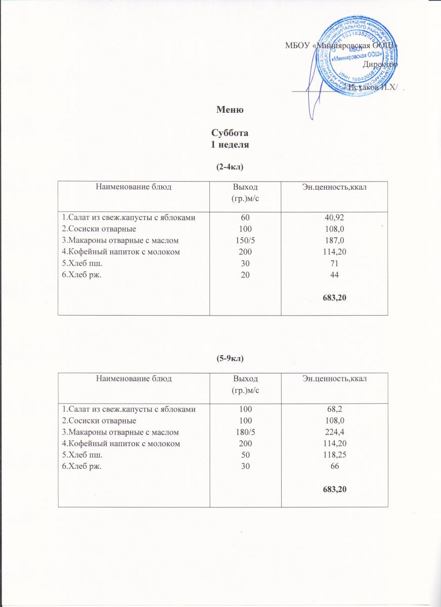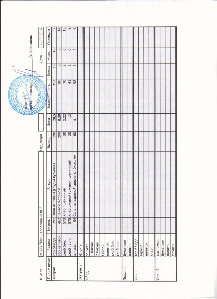 Меню МБОУ "Минняровская ООШ" на 24.11.2020г