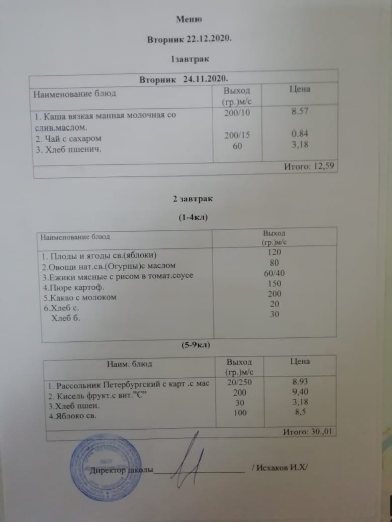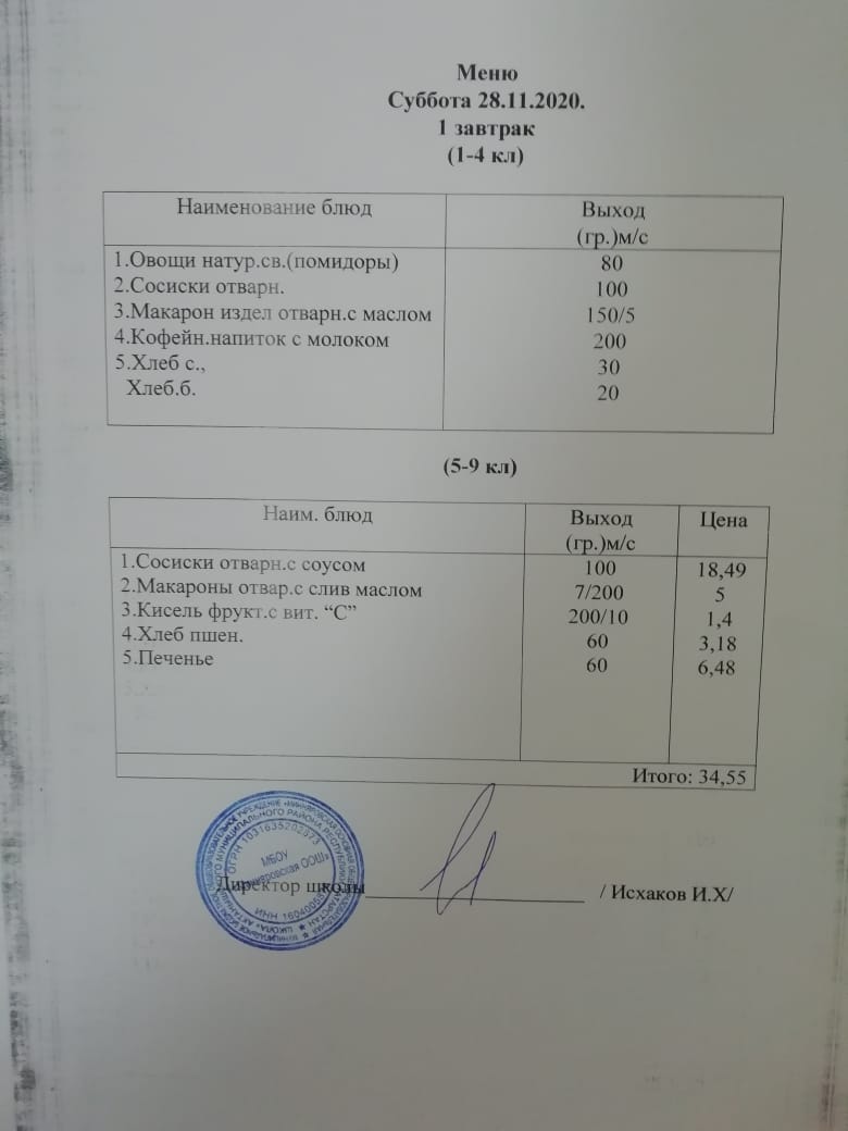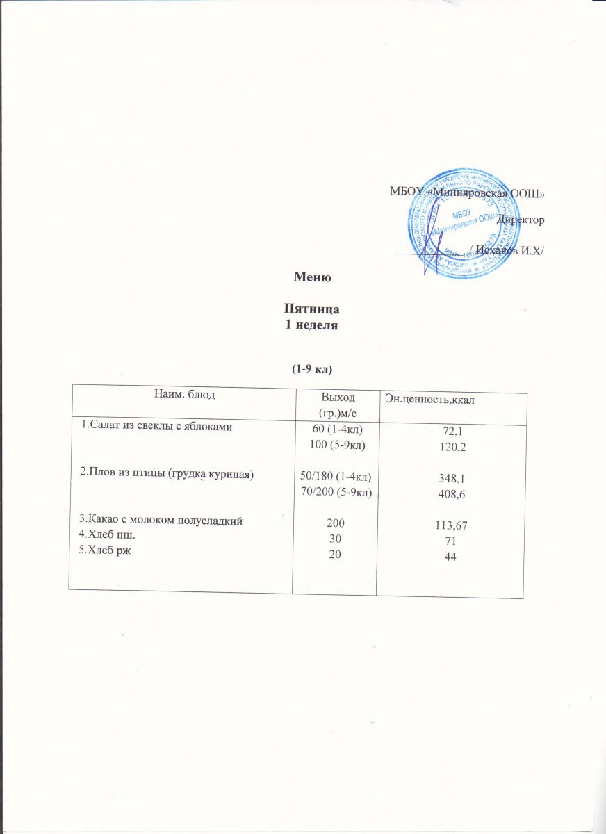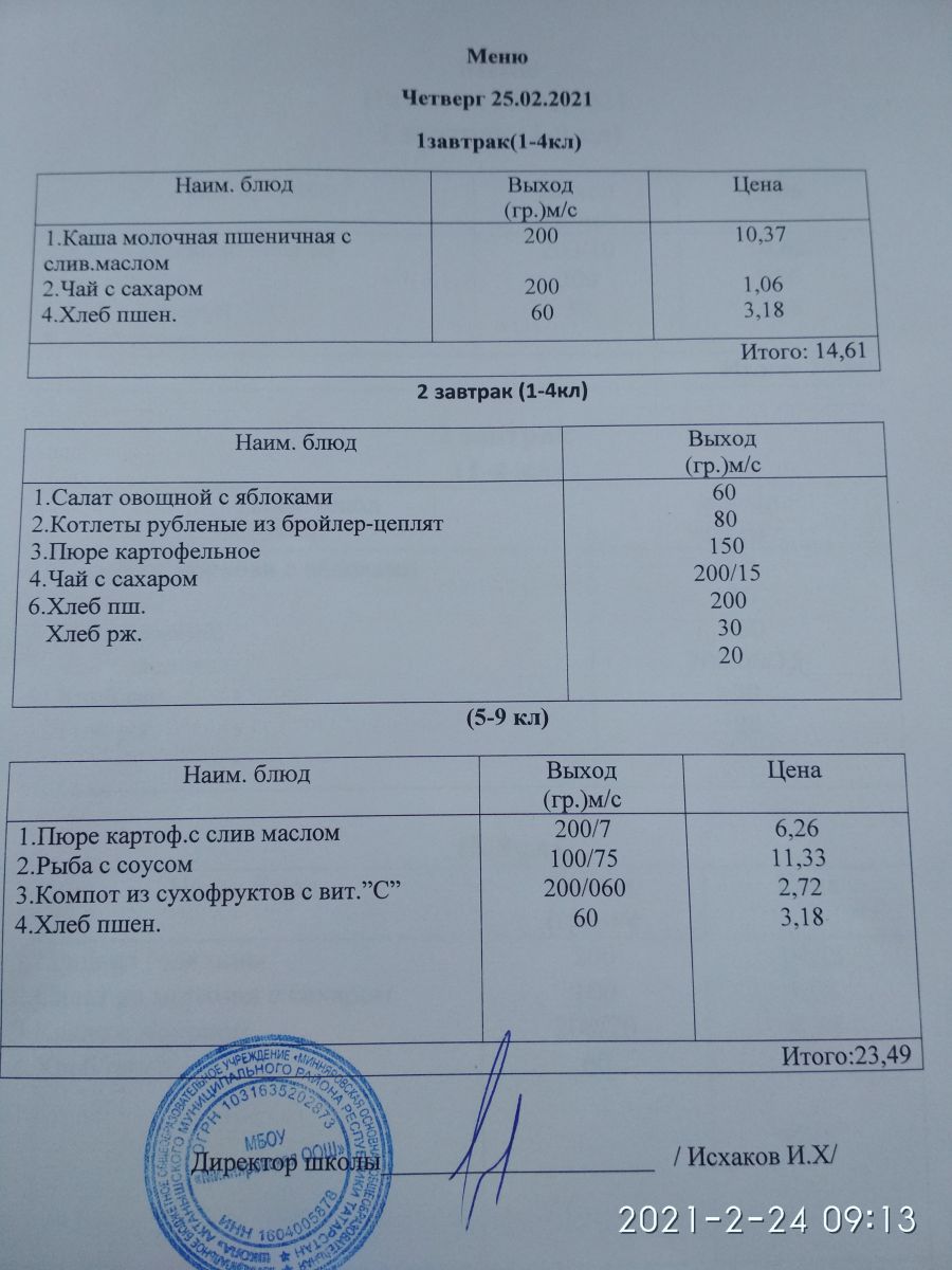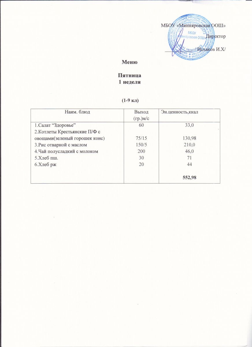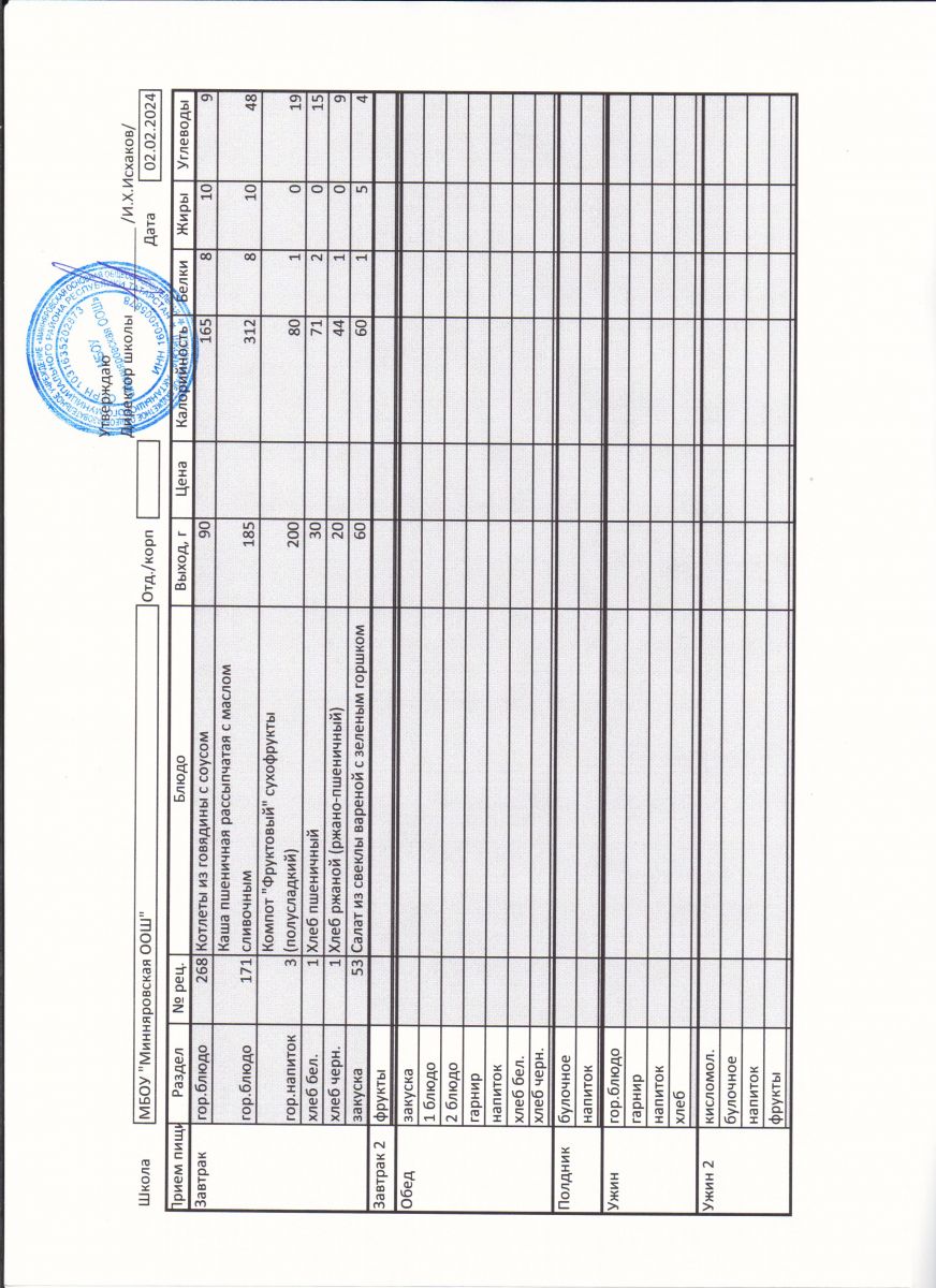 Меню МБОУ "Минняровская ООШ" на 24.11.2020г