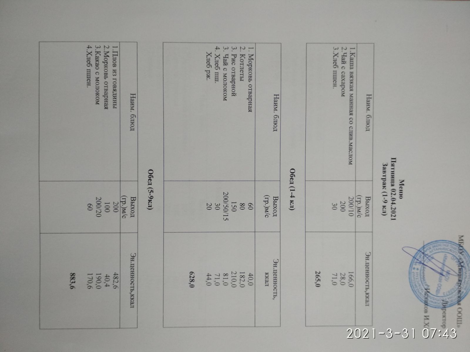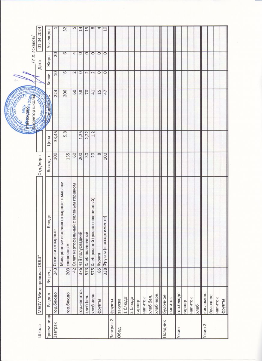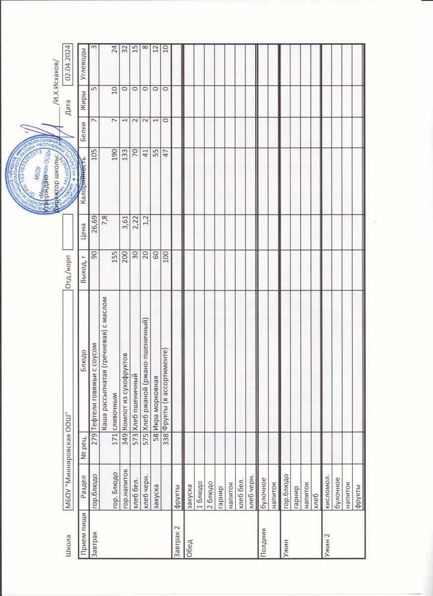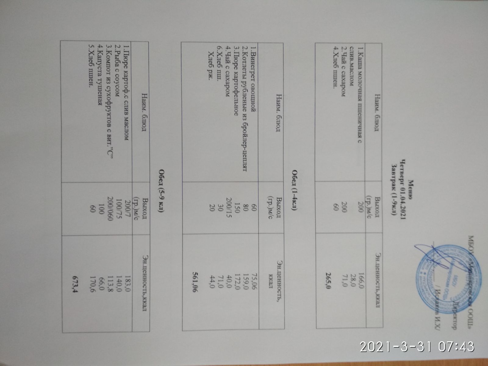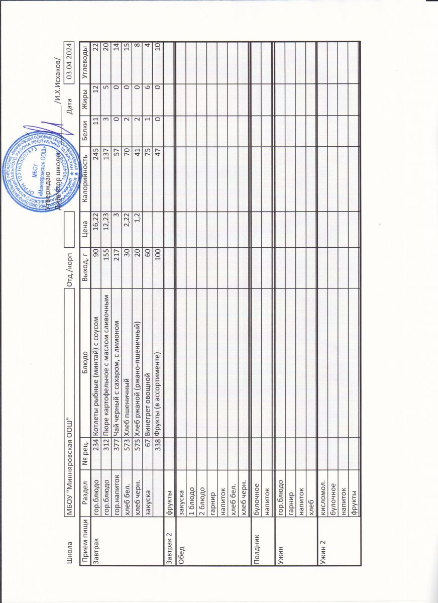 Меню МБОУ "Минняровская ООШ" на 31.03, на 01.04, на 02.04, на 03.04.2021г.