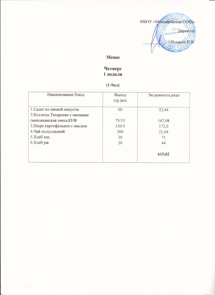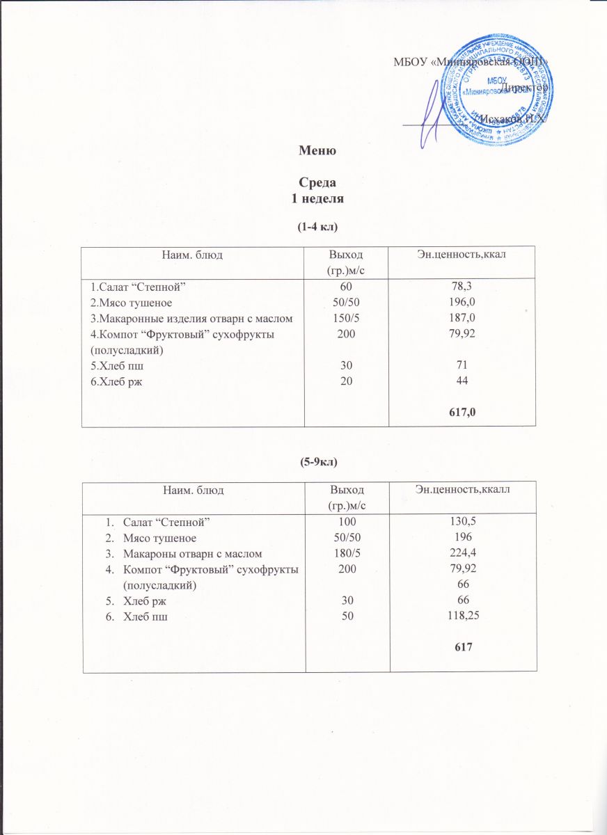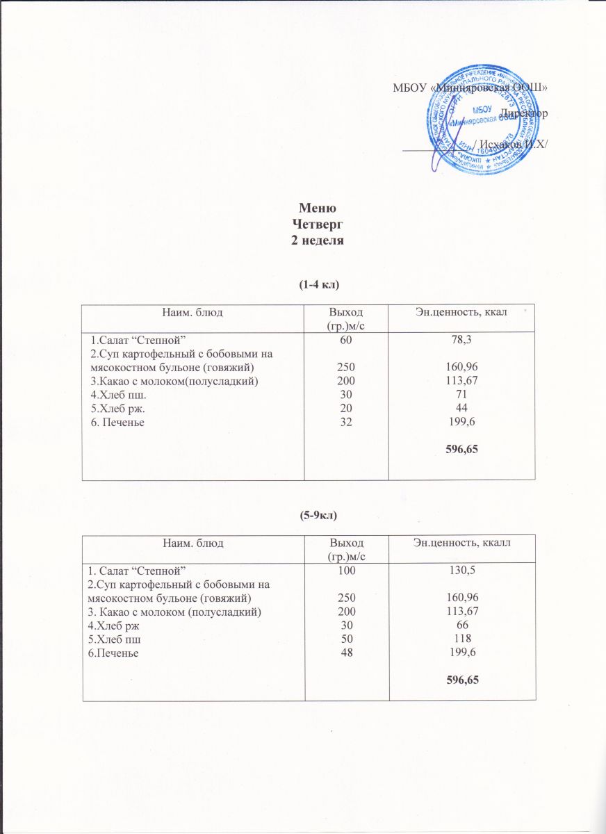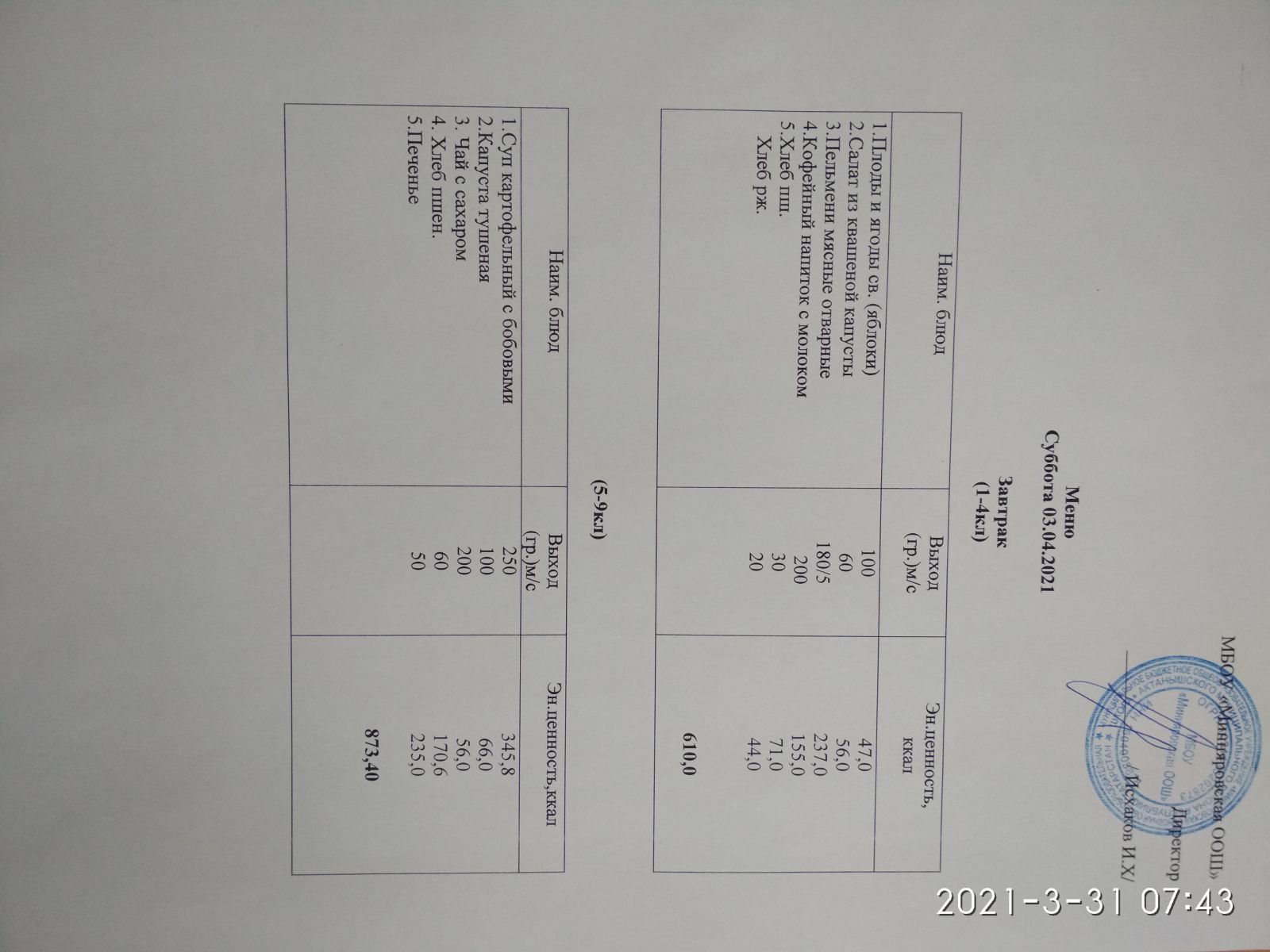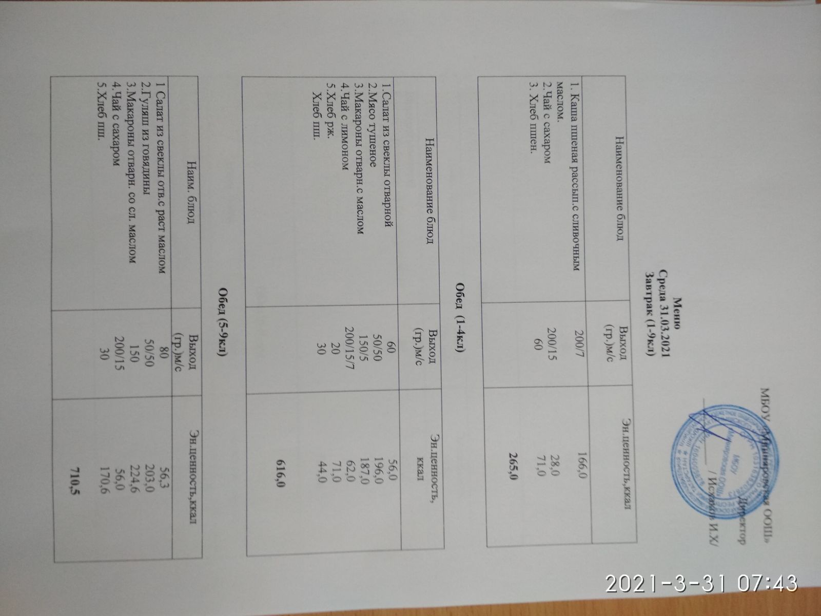 Меню МБОУ "Минняровская ООШ" на 31.03, на 01.04, на 02.04, на 03.04.2021г.