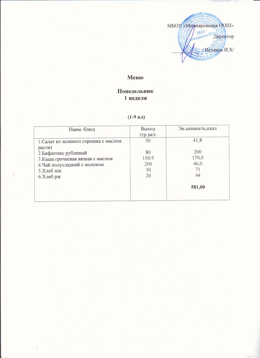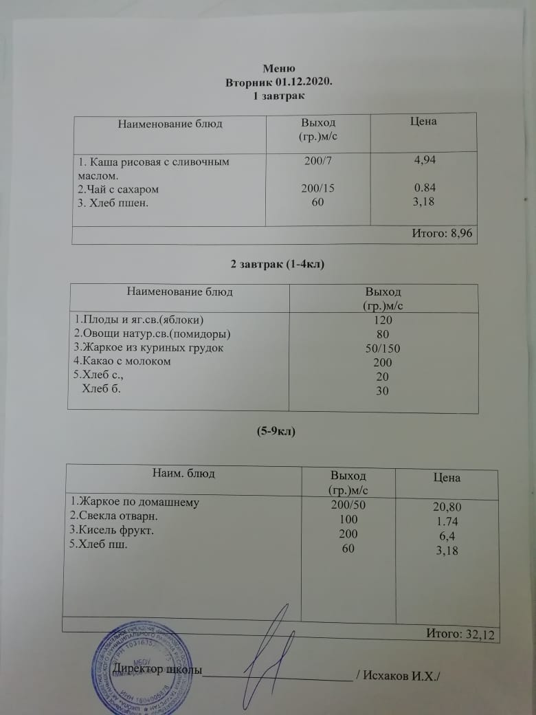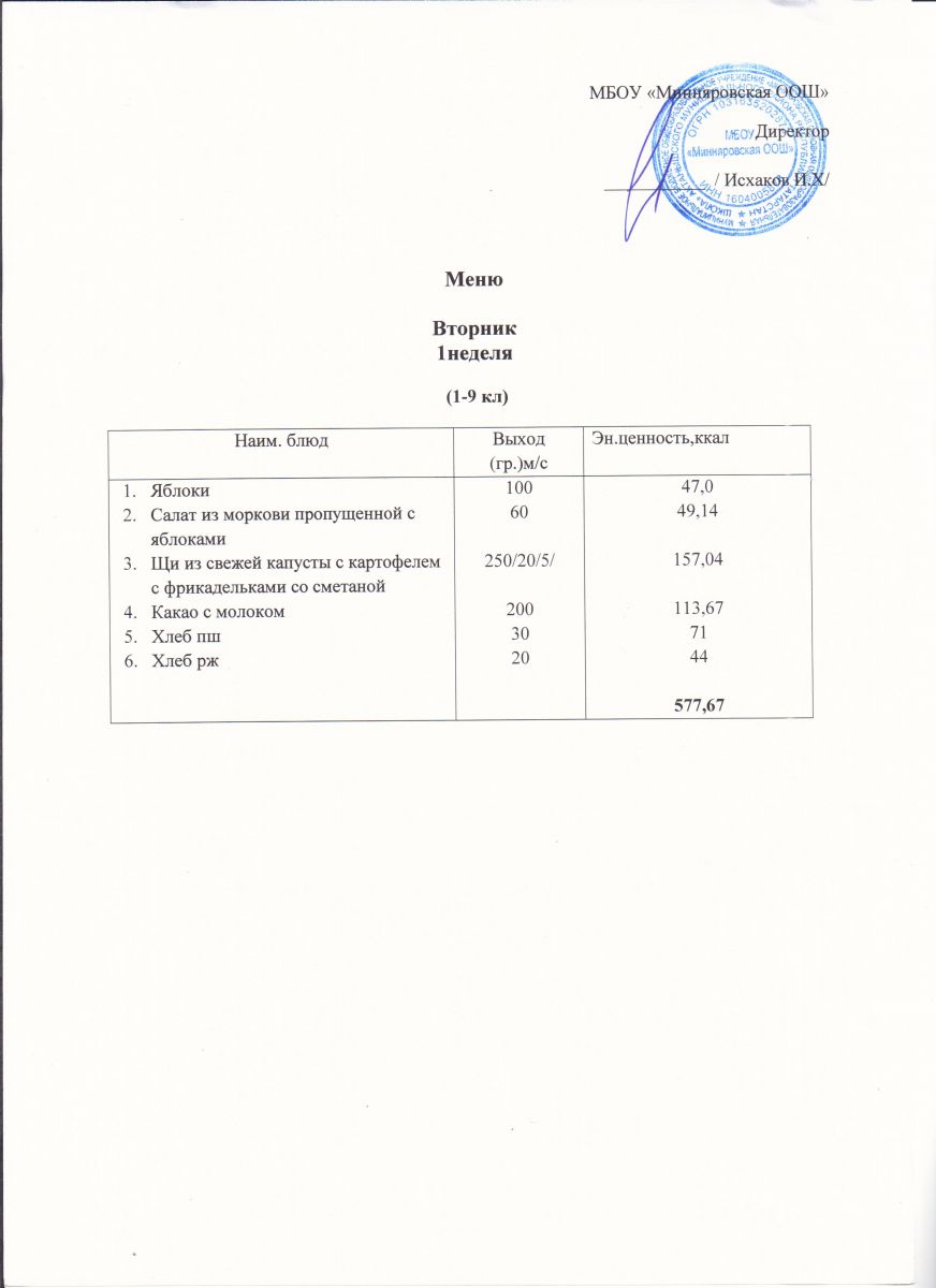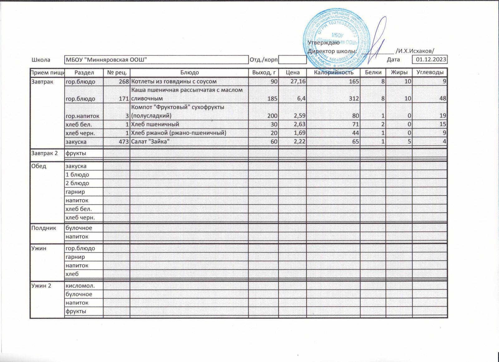 Меню МБОУ "Минняровская ООШ" на 1.12.2020