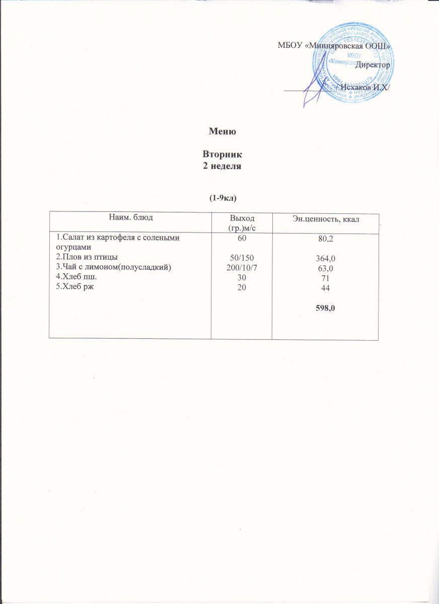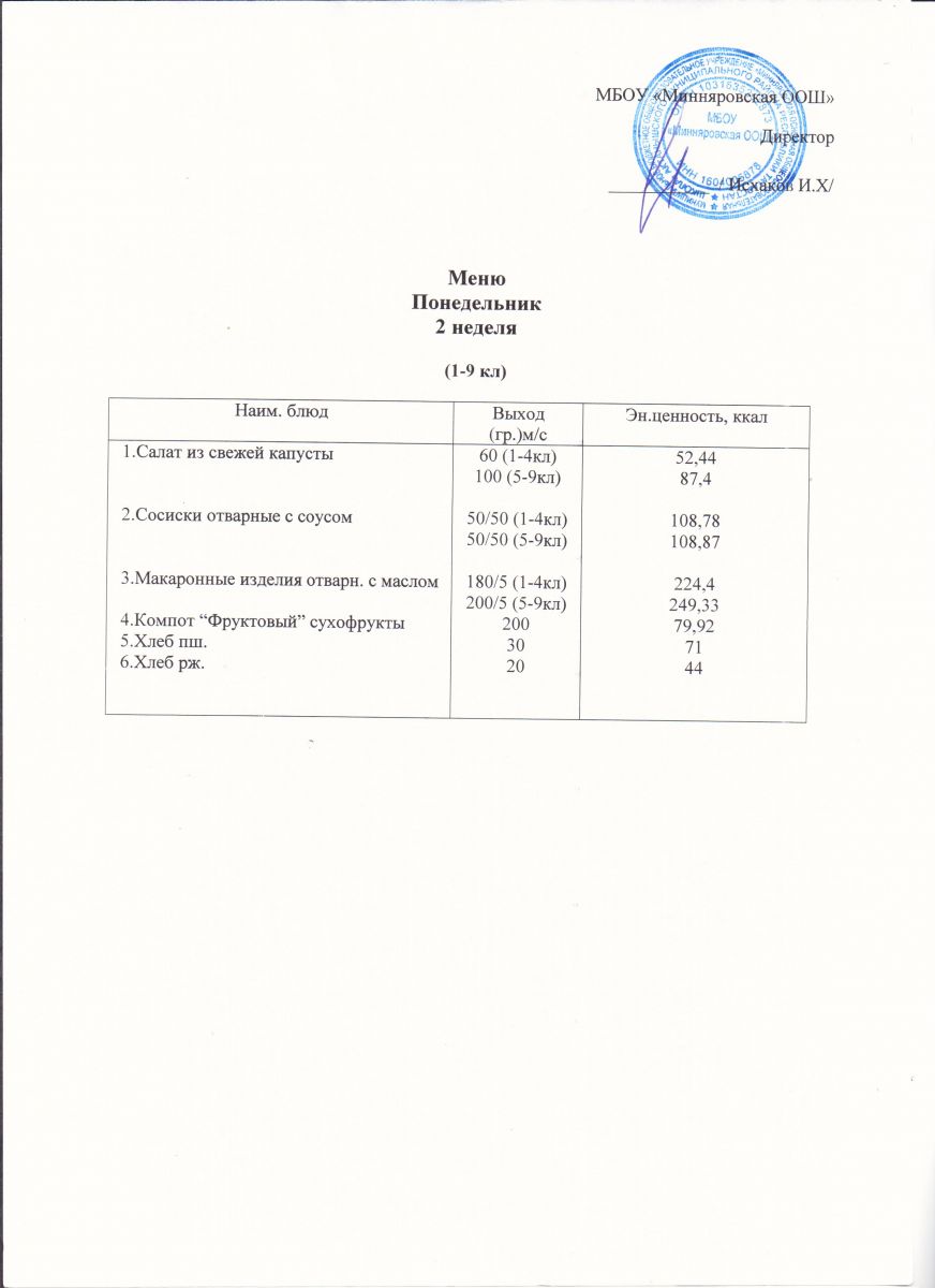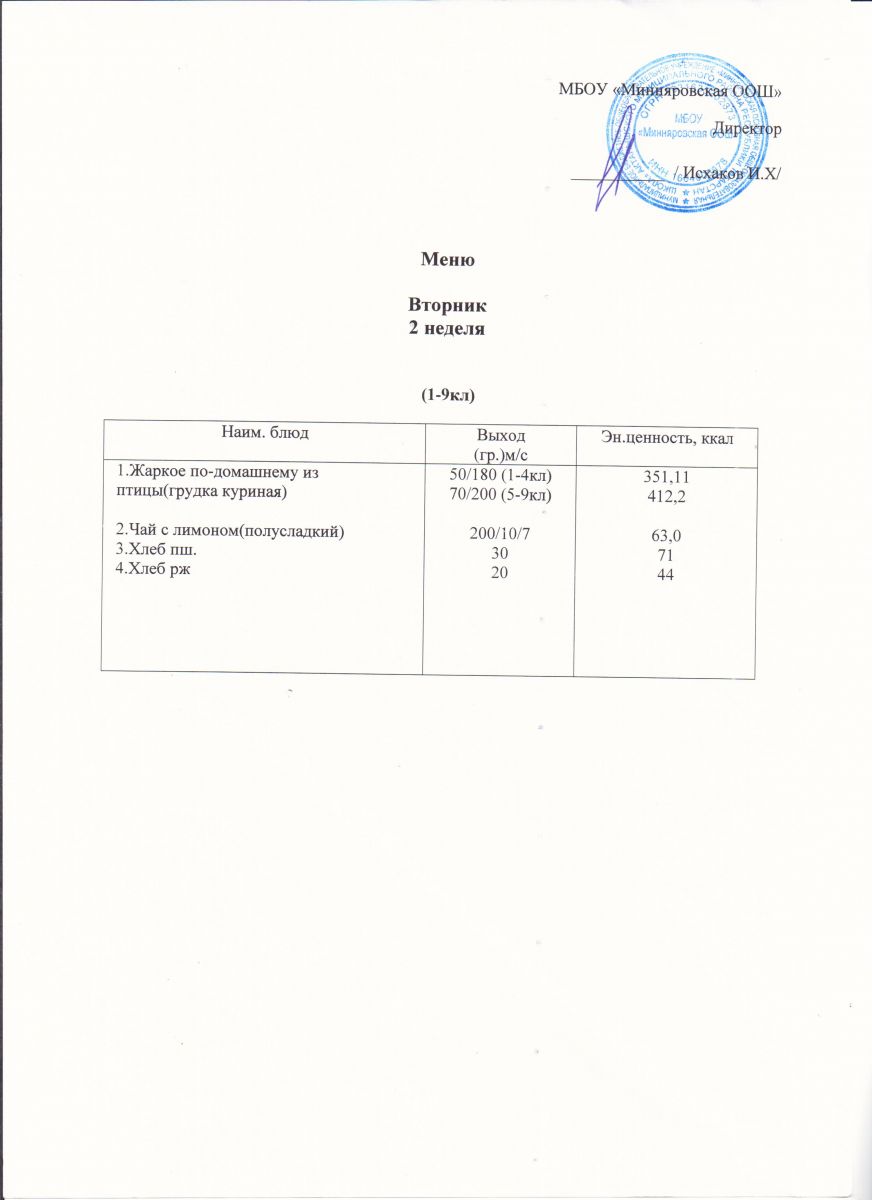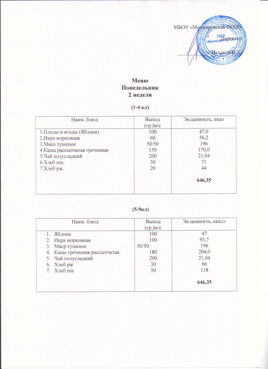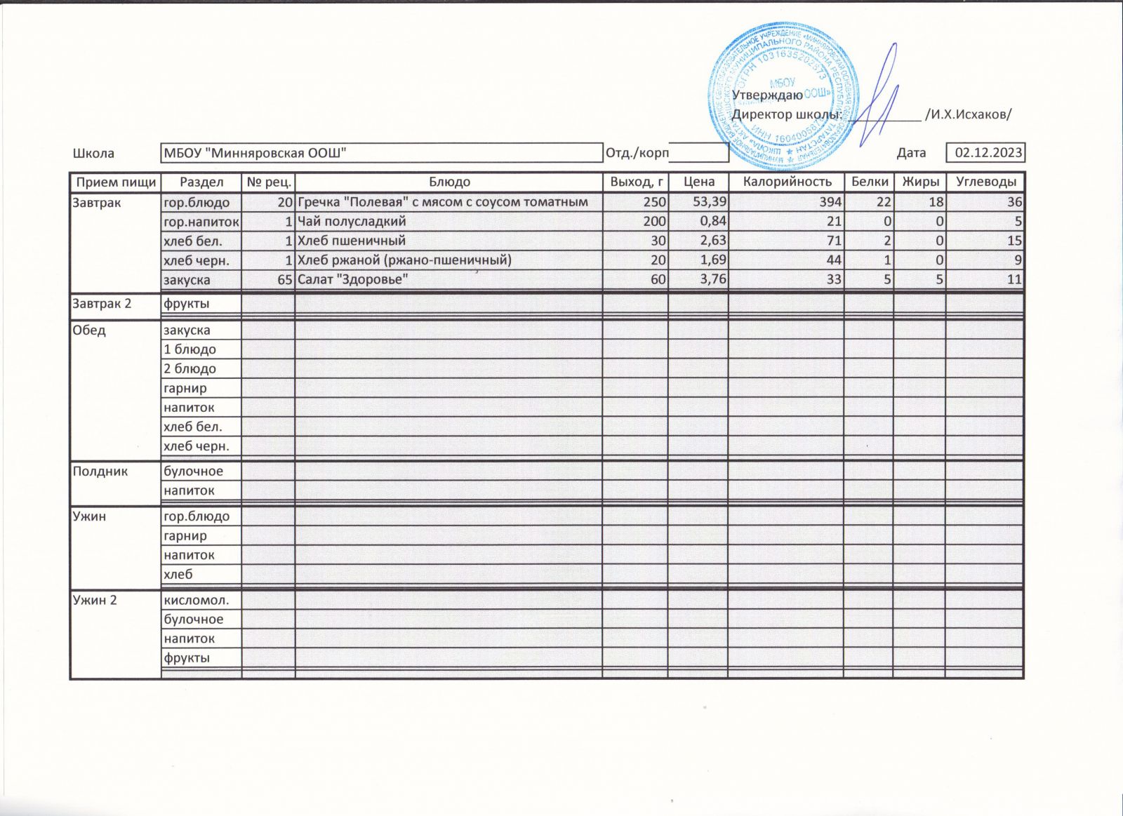 Меню МБОУ "Минняровская ООШ" на 2.12.2020
