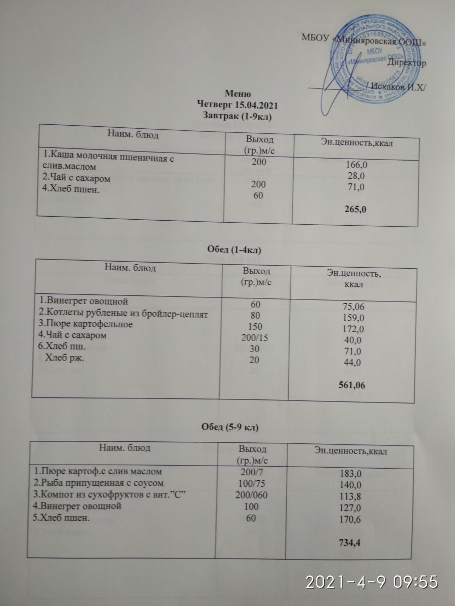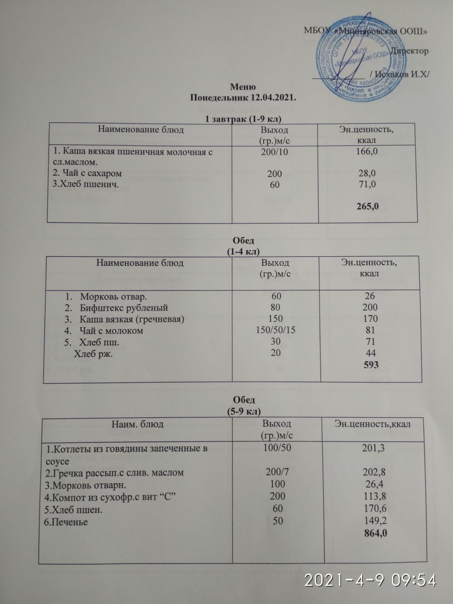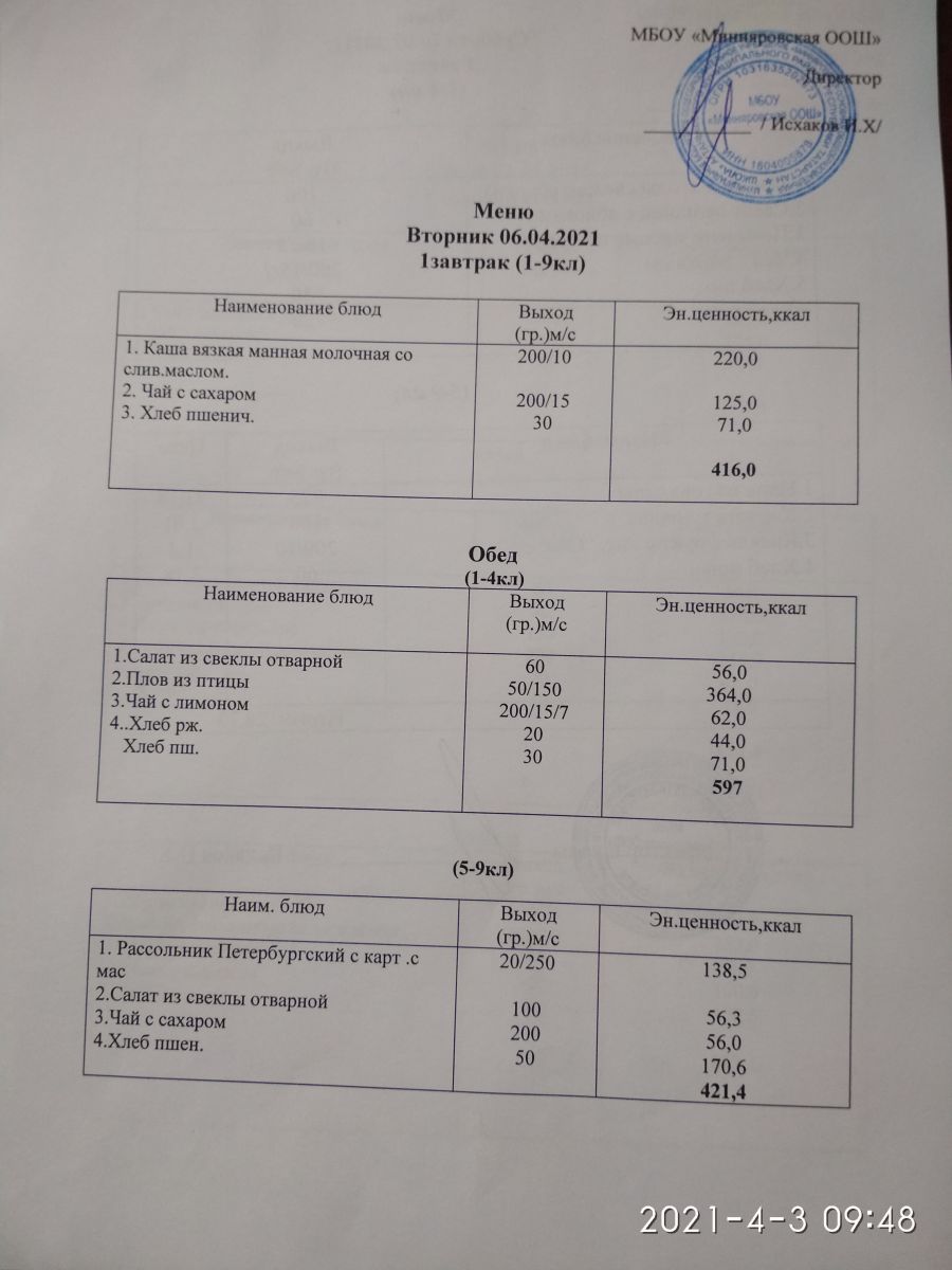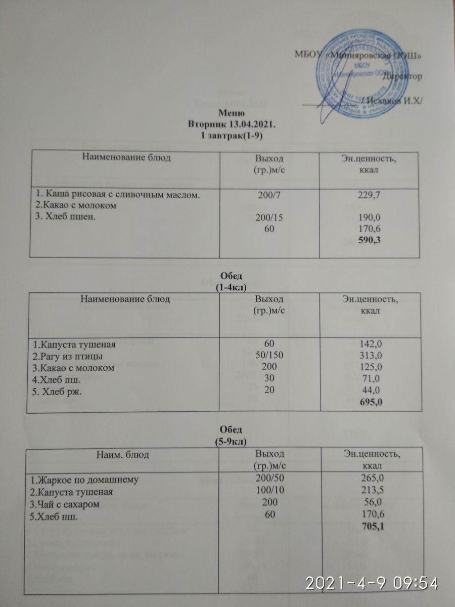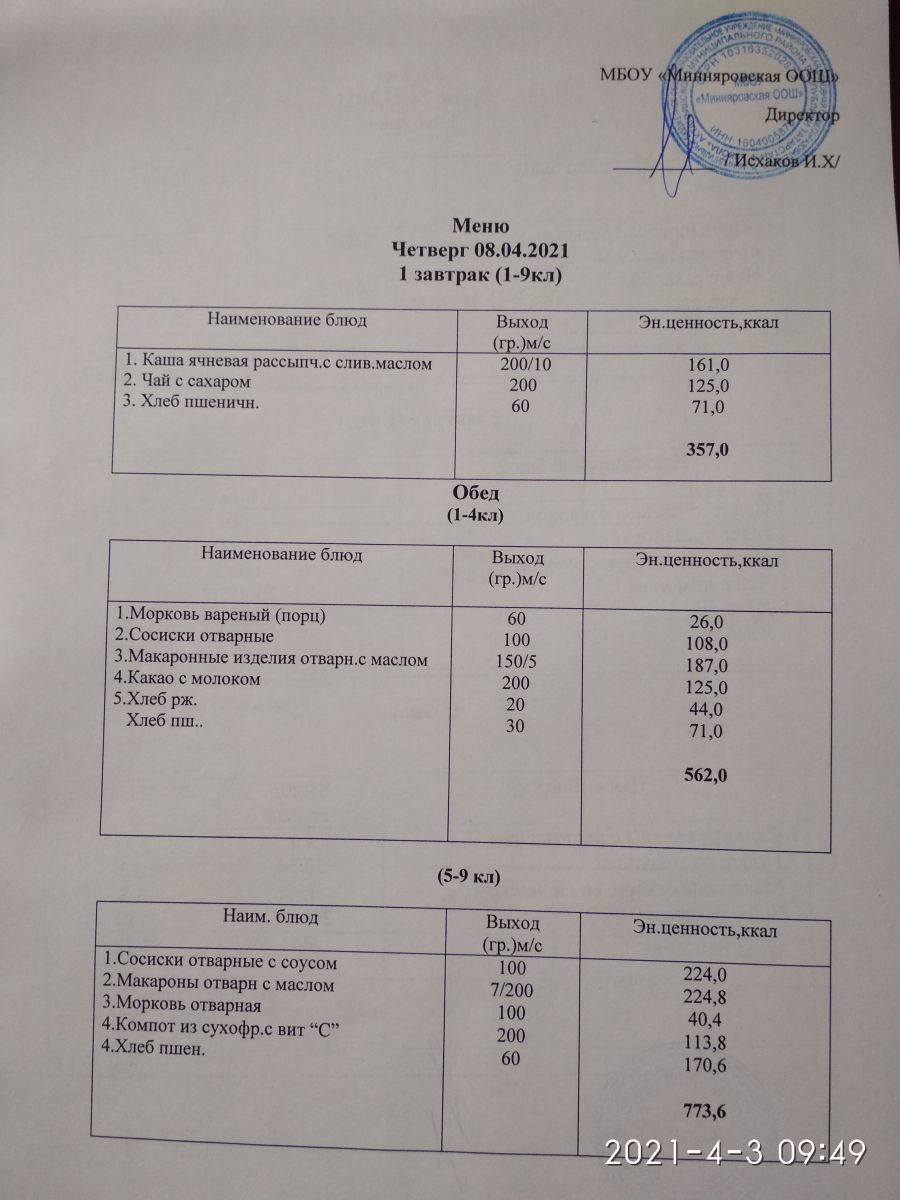Меню МБОУ "Минняровская ООШ" на 05.04, на 06.04, на 07.04, на 08.04, на 09.04, на 10.04.2021 г.