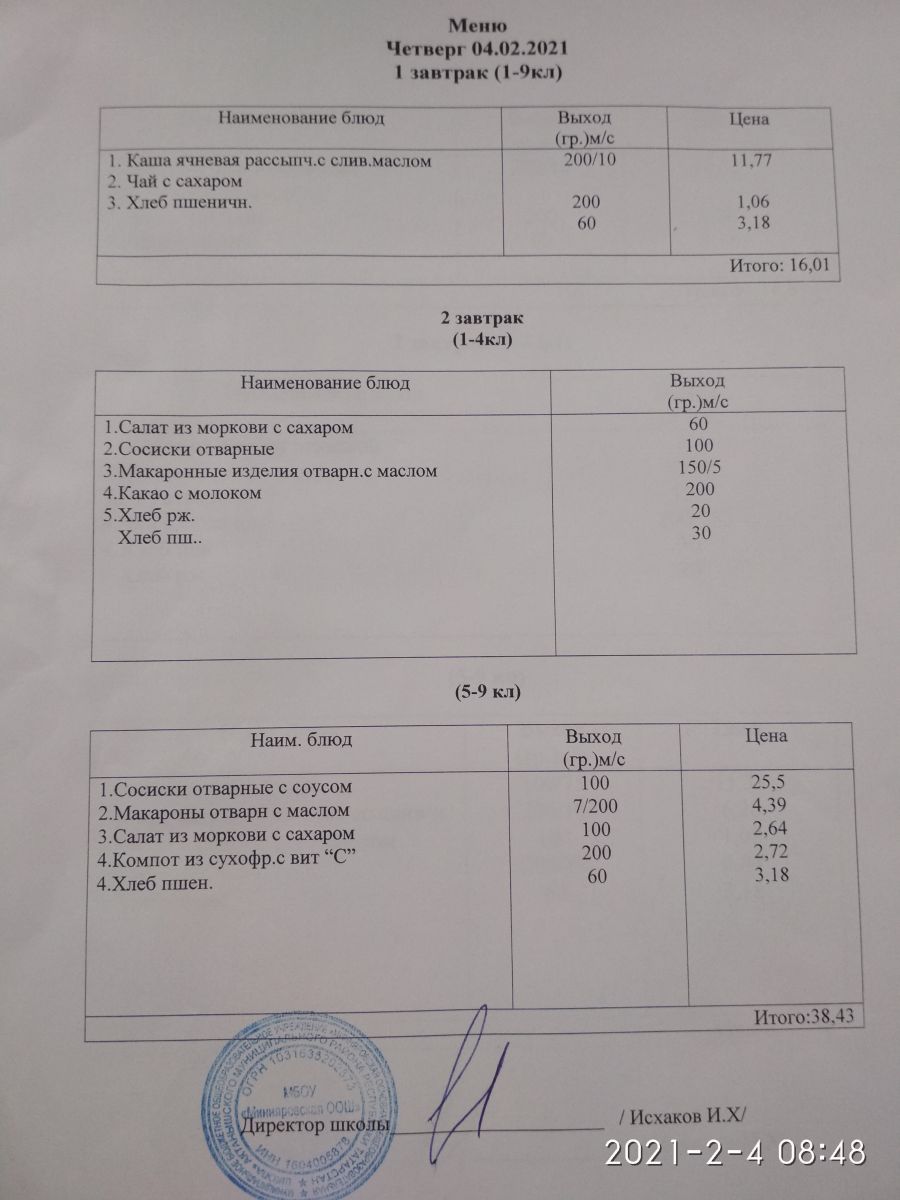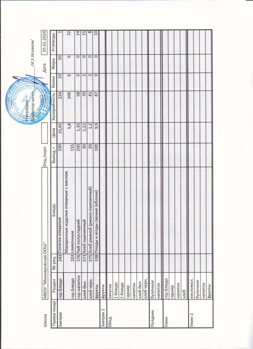 Меню МБОУ "Минняровская ООШ" на 01.02.2021, на 02.02.2021, на 03.02.2021, на 04.02.2021, на 05.02.2021, на 06.02.2021.