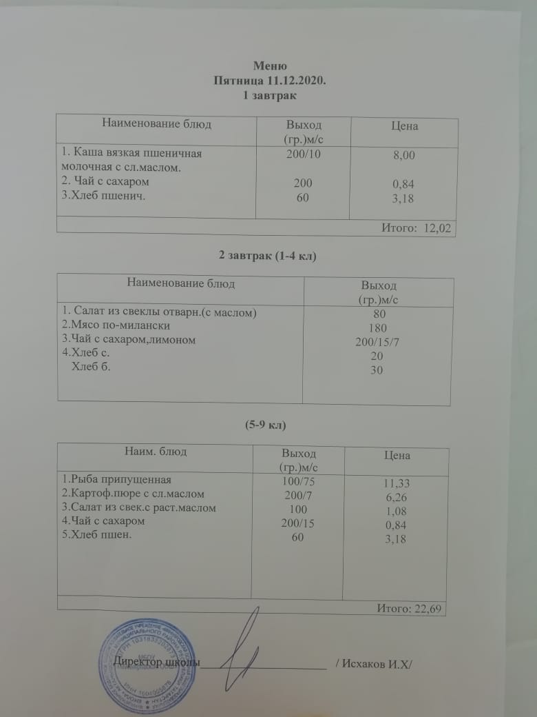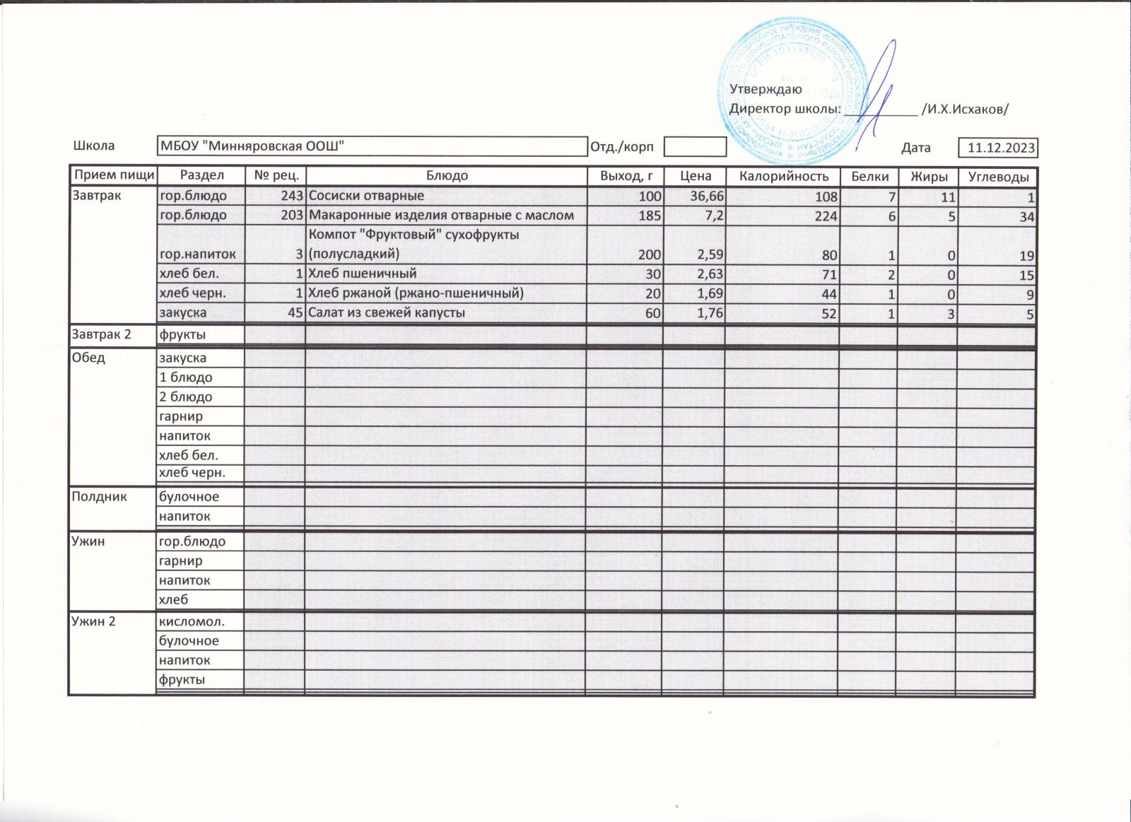 Меню МБОУ "Минняровская ООШ" на 11.12.2020