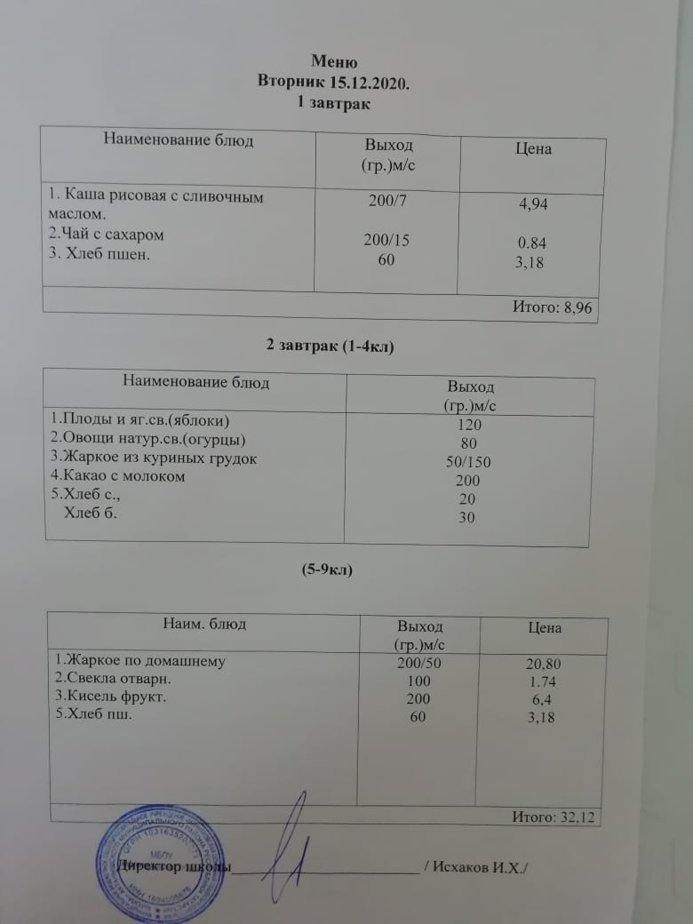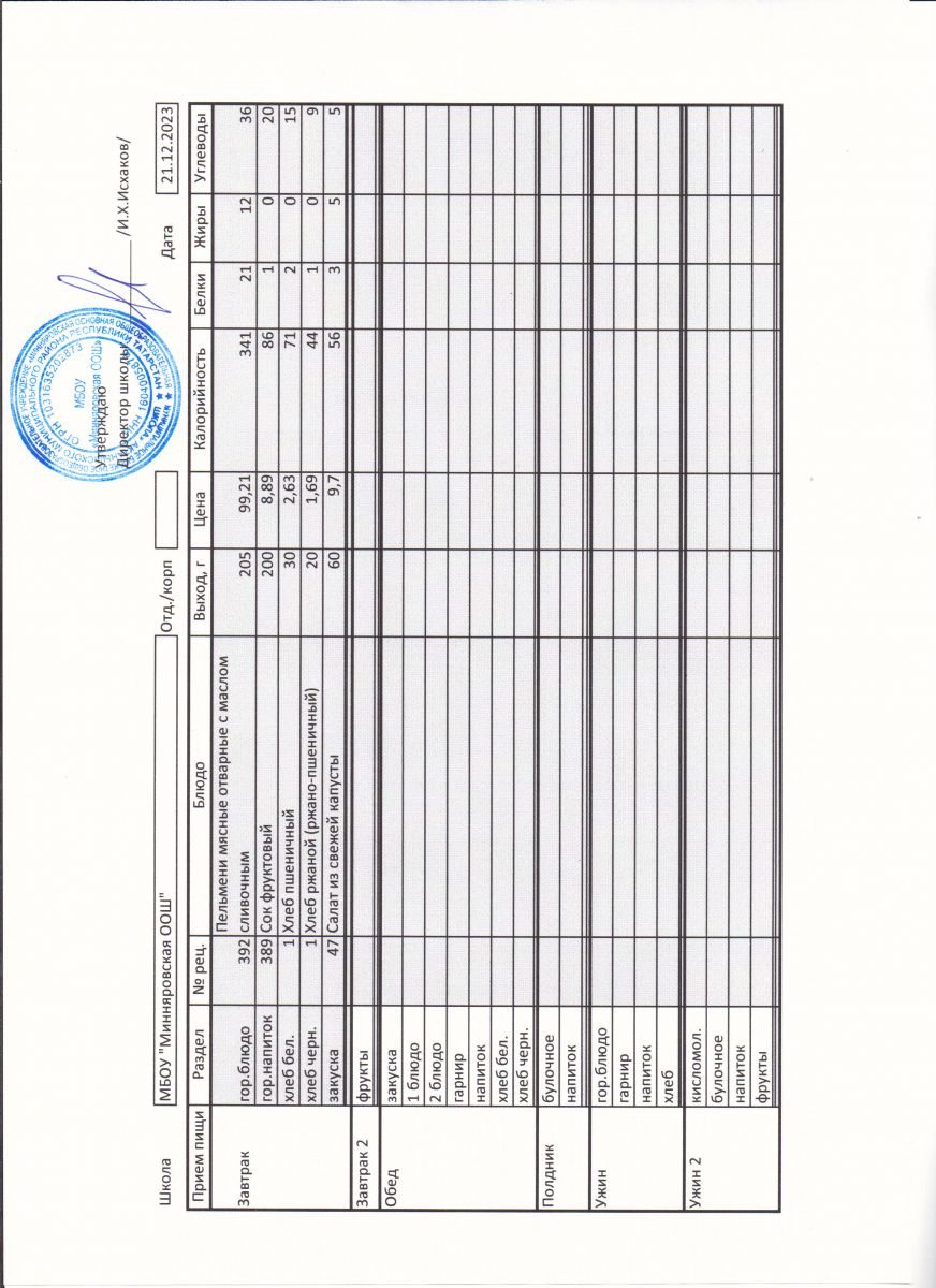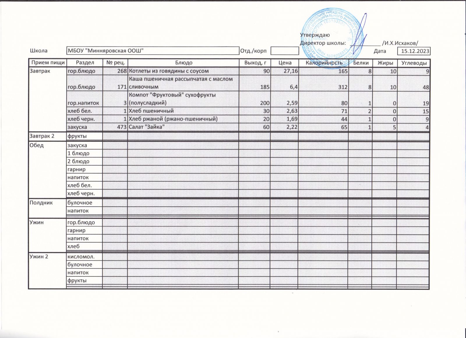 Меню МБОУ "Минняровская ООШ" на 15.12.2020