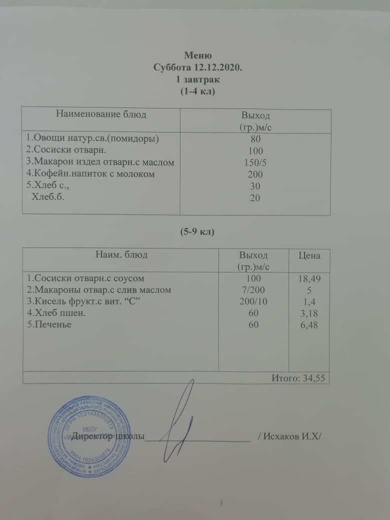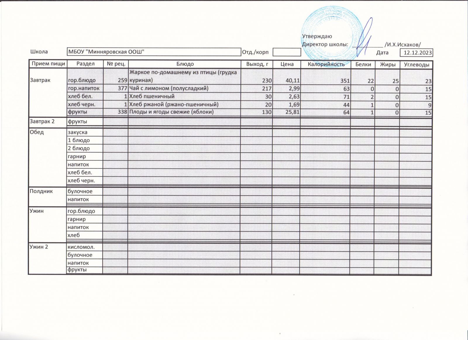 Меню МБОУ "Минняровская ООШ" на 12.12.2020