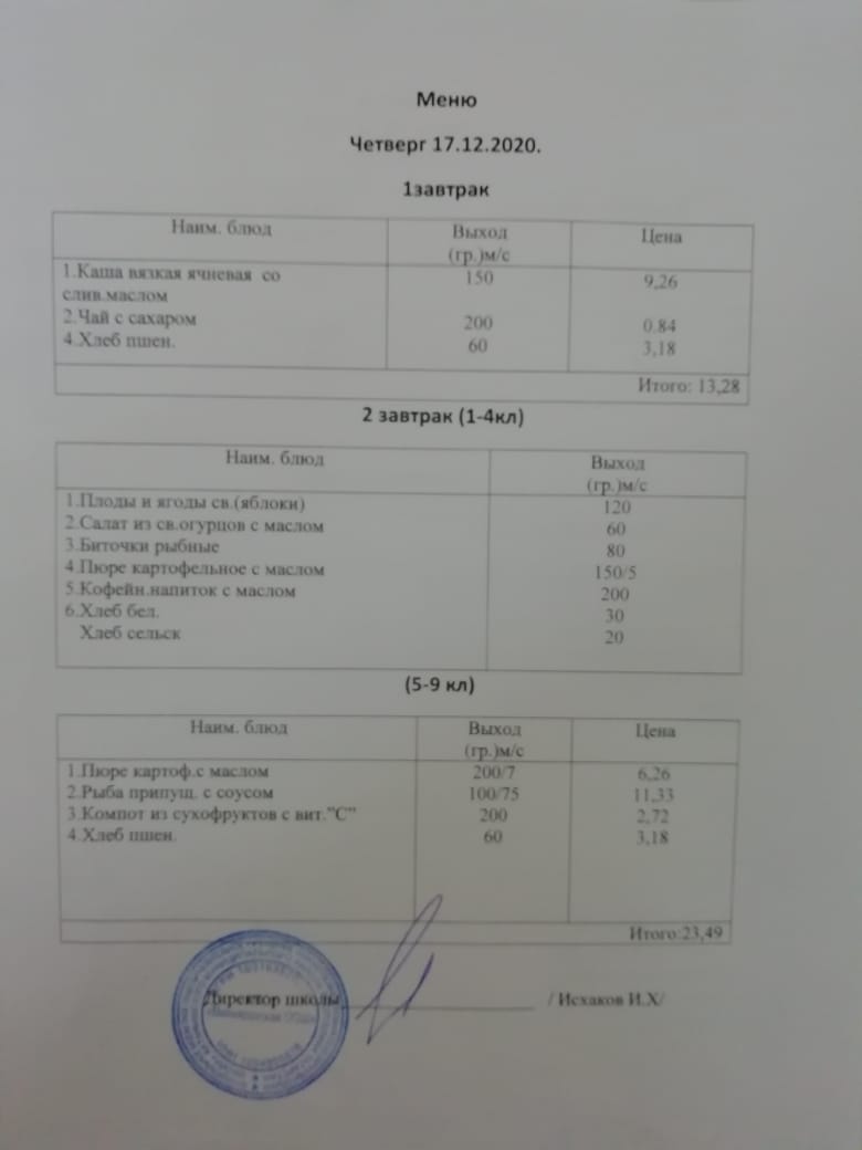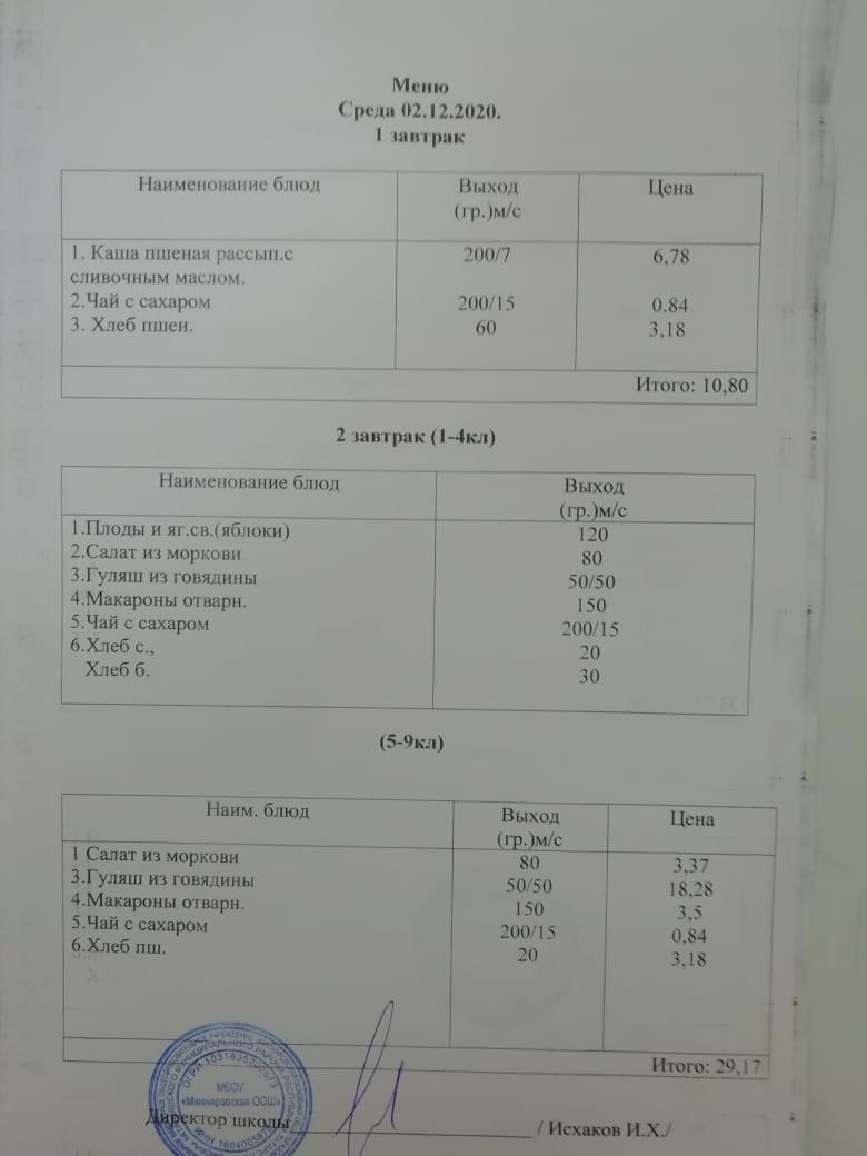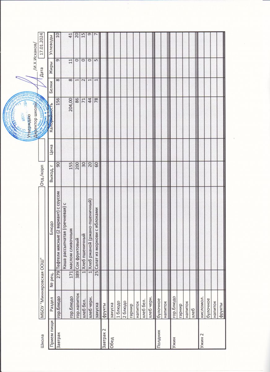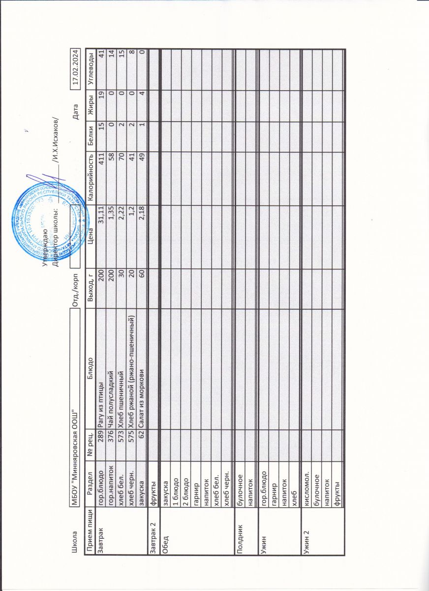 Меню МБОУ "Минняровская ООШ" на 17.12.2020