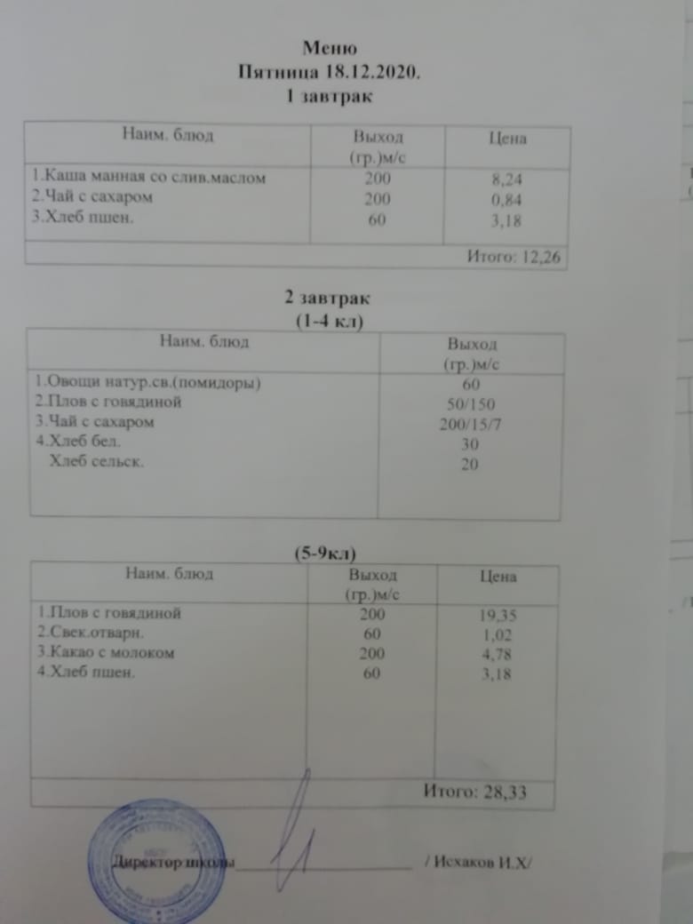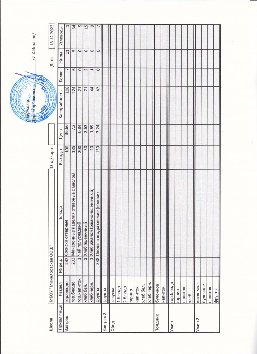 Меню МБОУ "Минняровская ООШ" на 18.12.2020