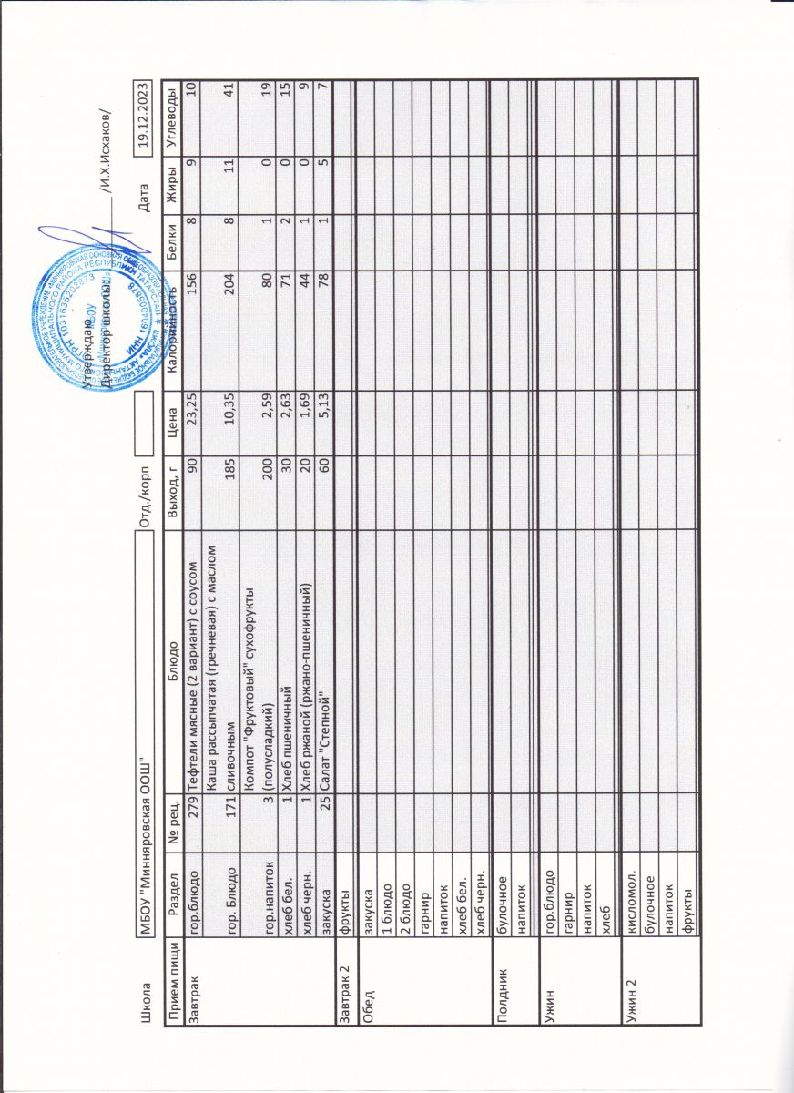 Меню МБОУ "Минняровская ООШ" на 19.12.2020