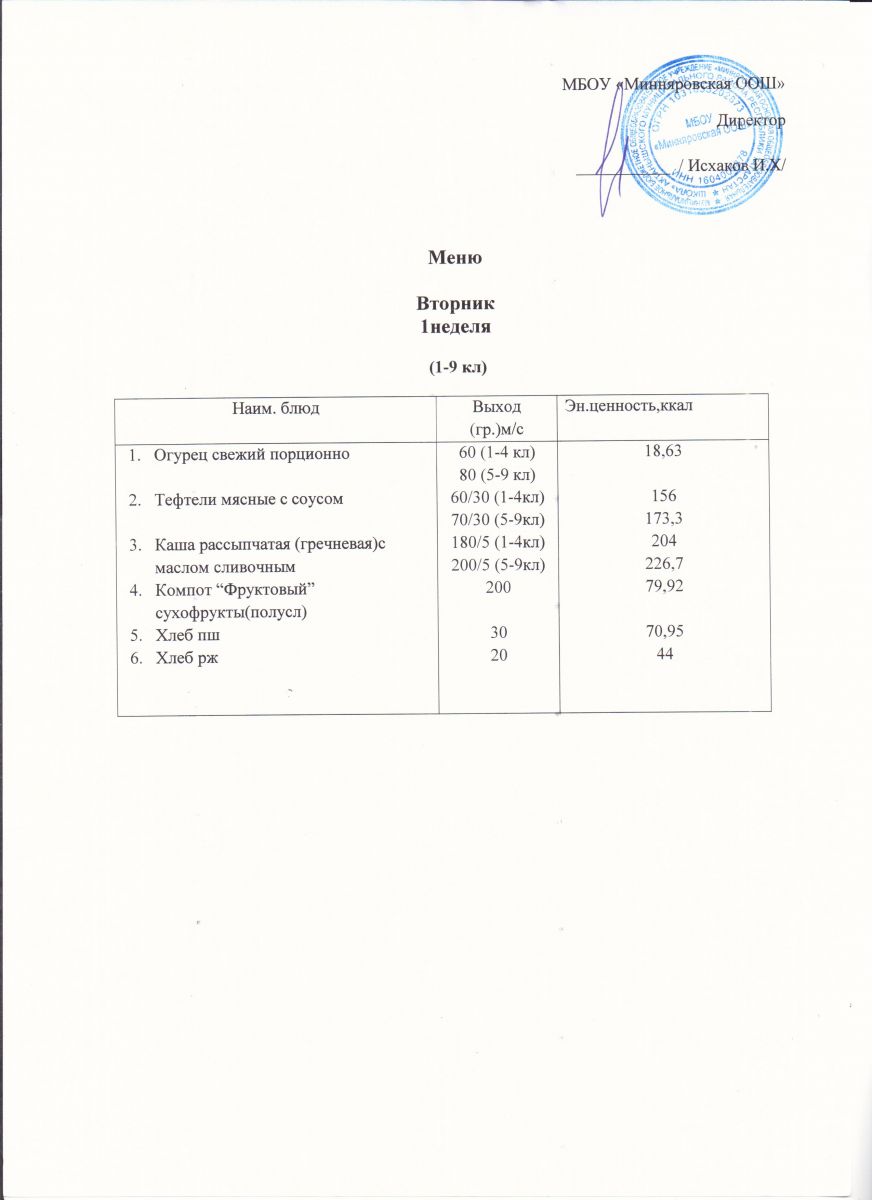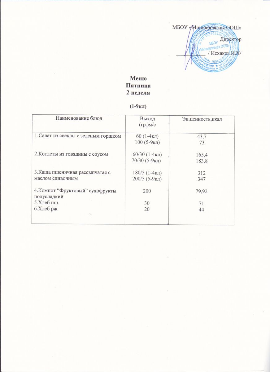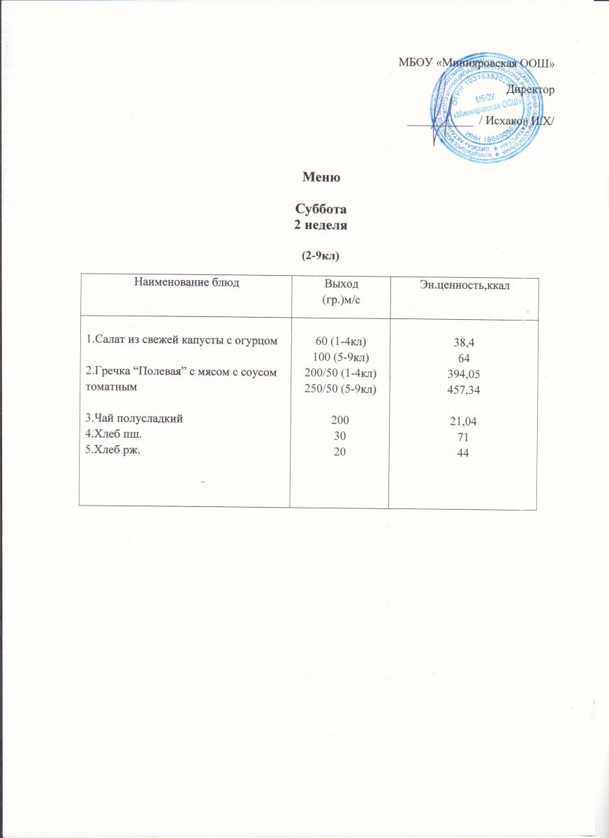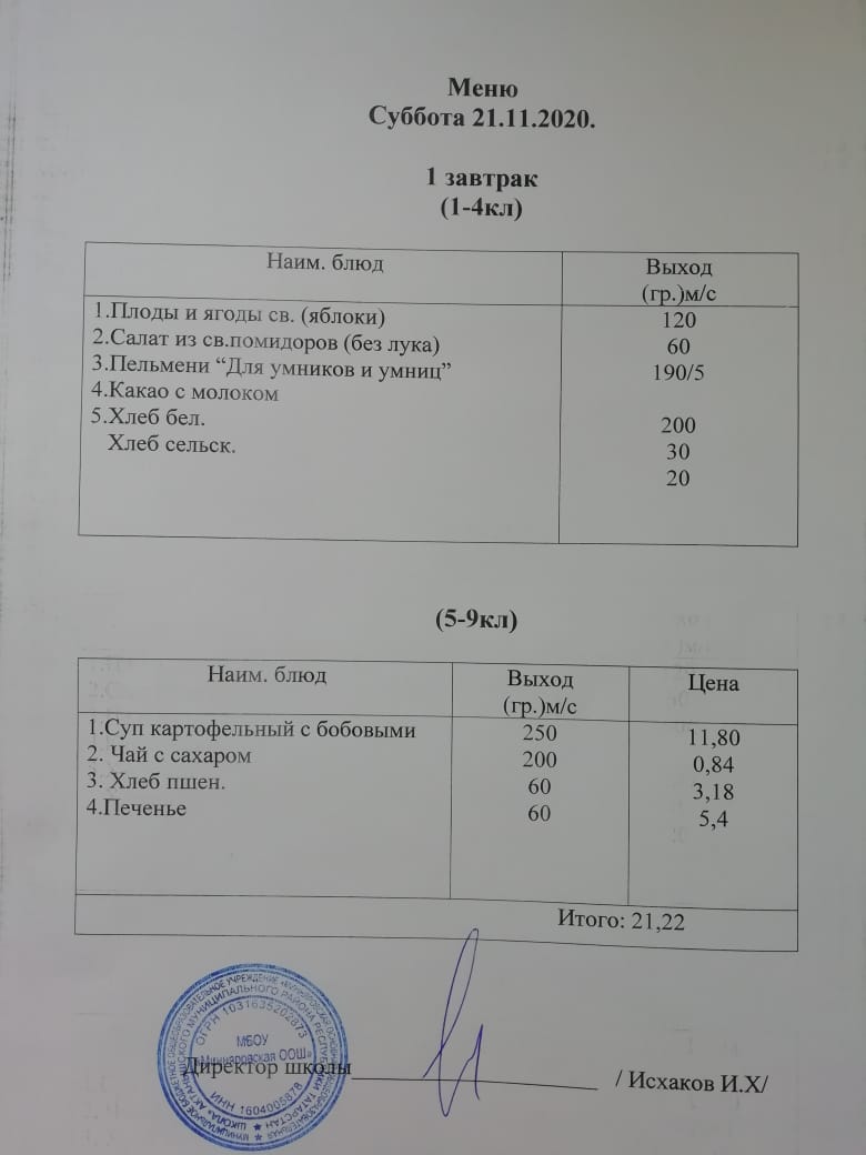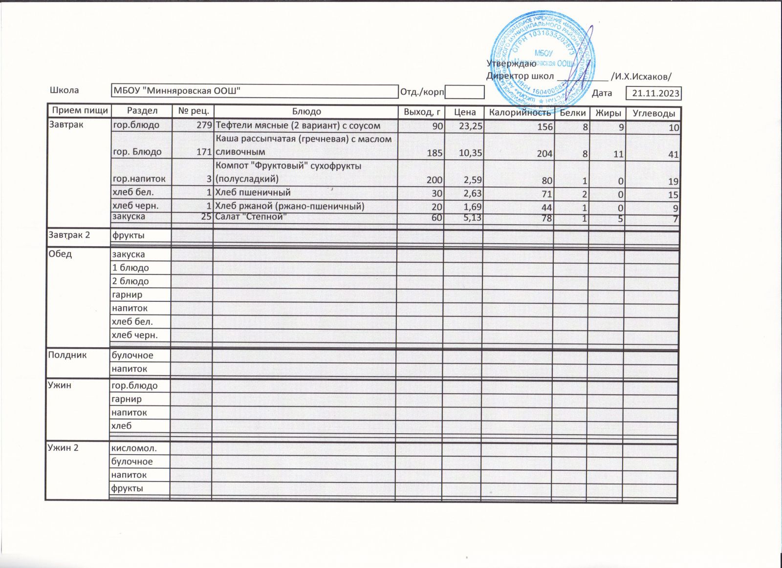 Меню МБОУ Минняровская ООШ на 21.11.2020
