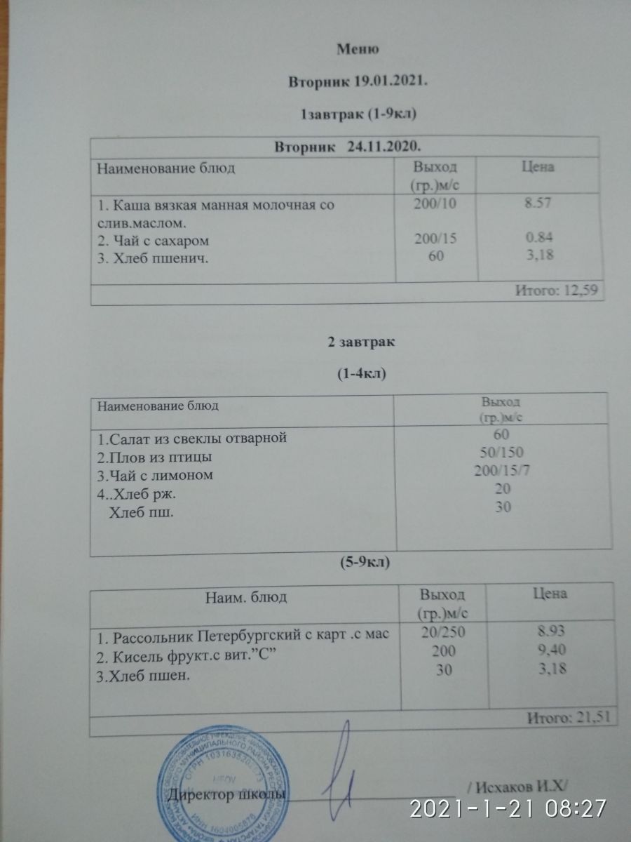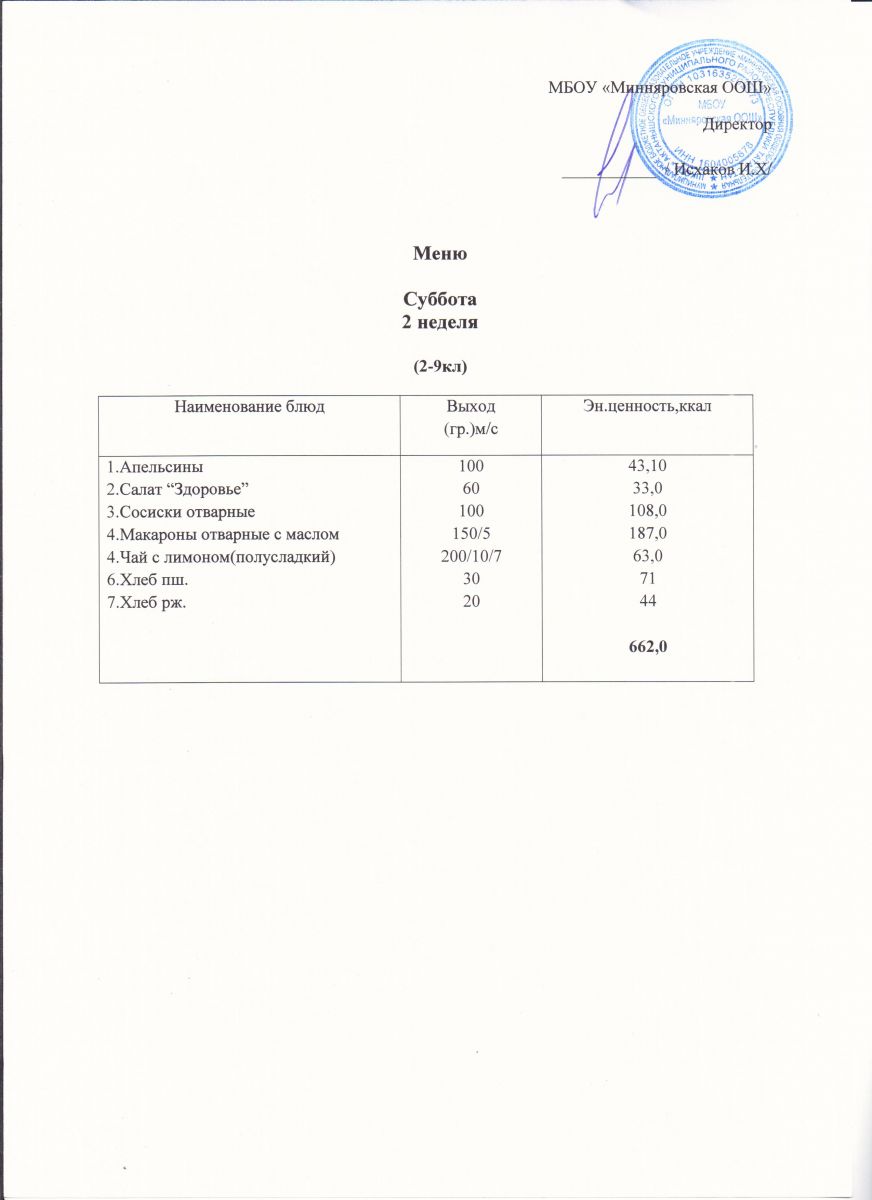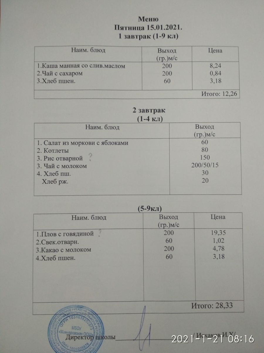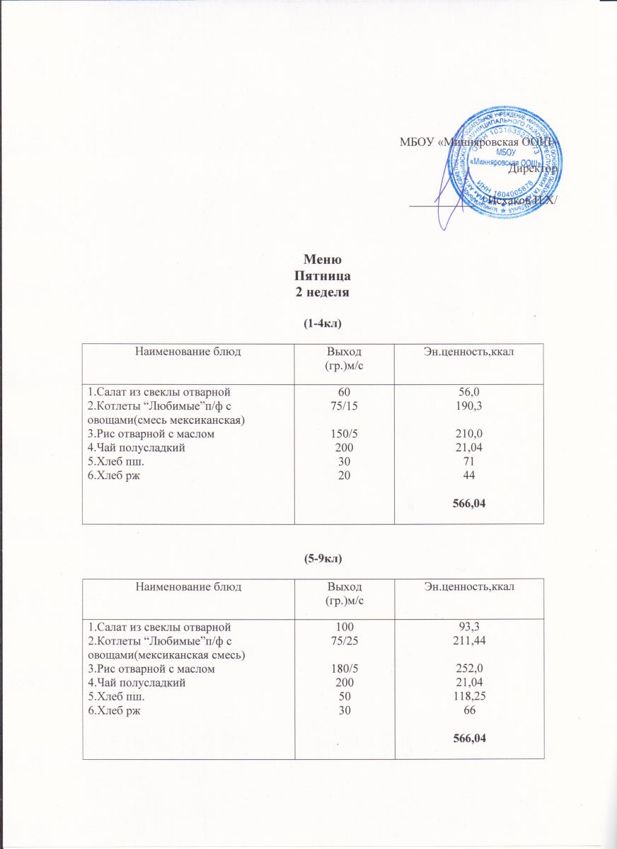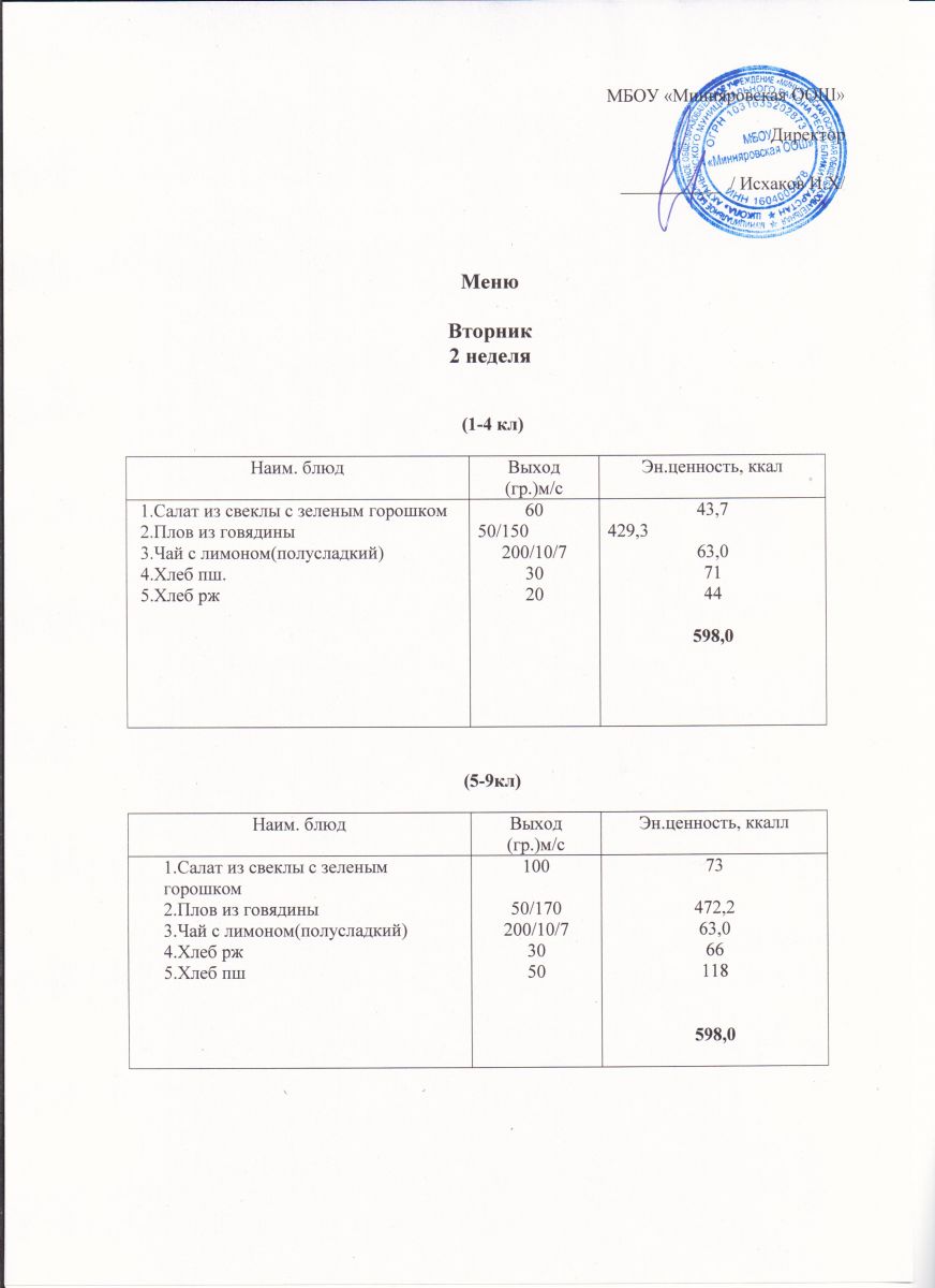 Меню МБОУ Минняровская ООШ на 21.11.2020