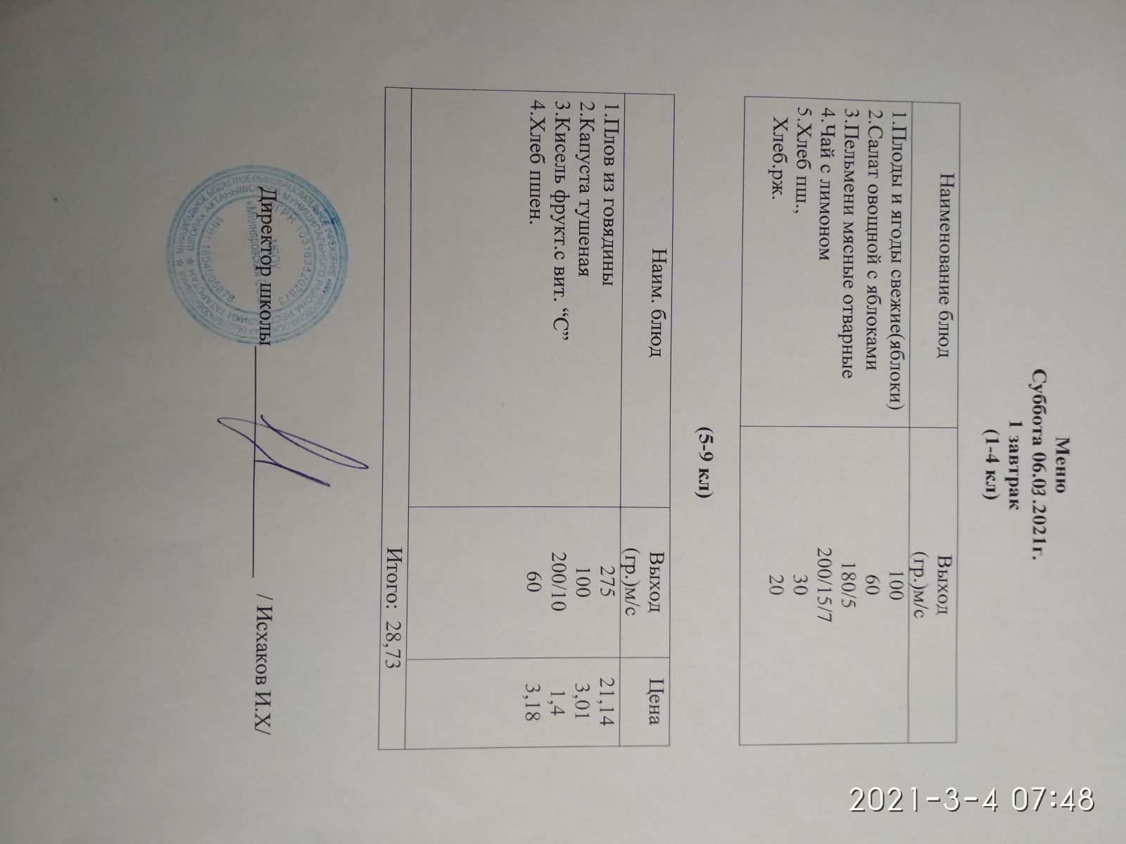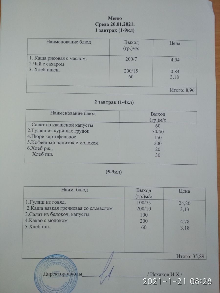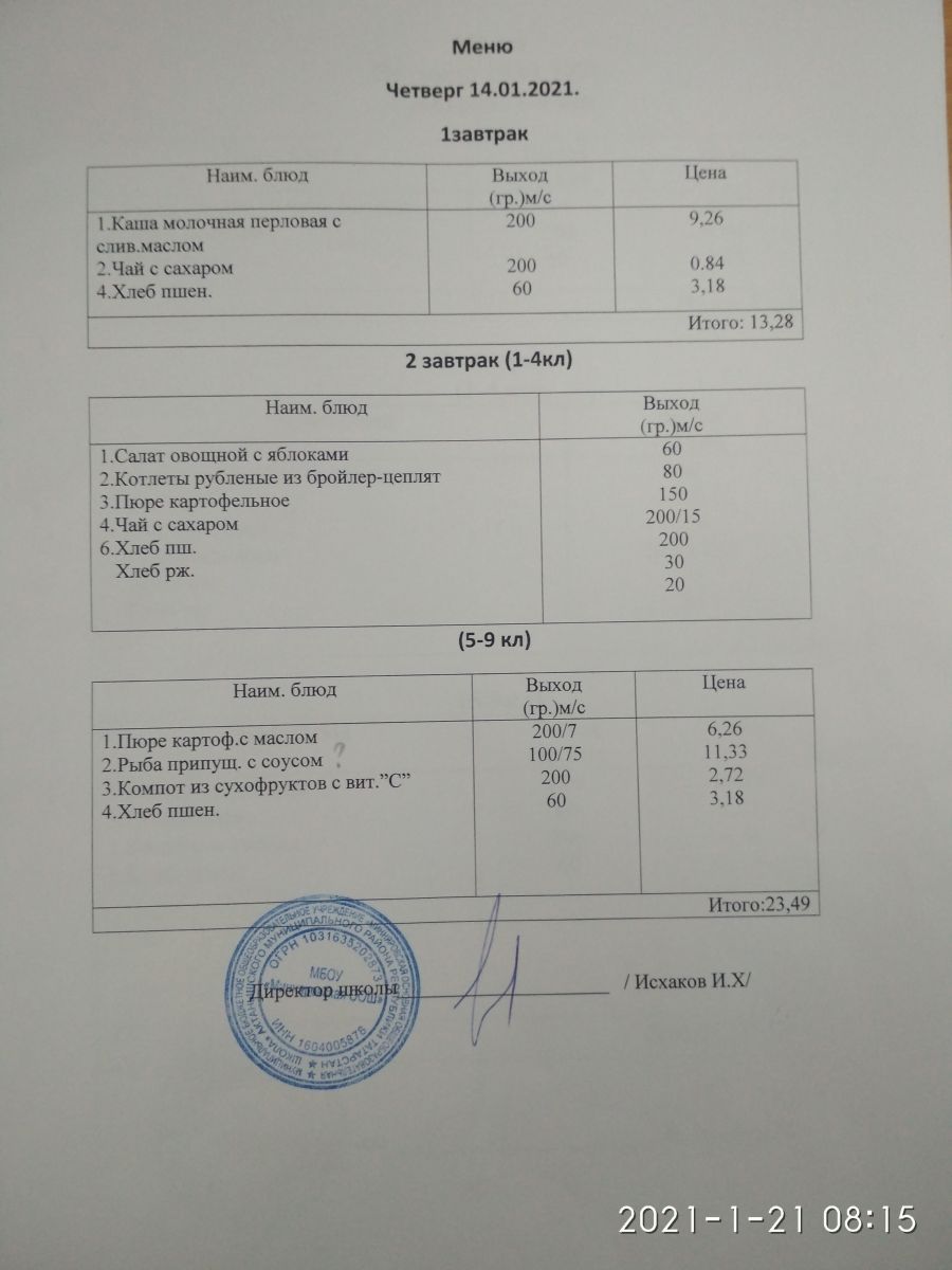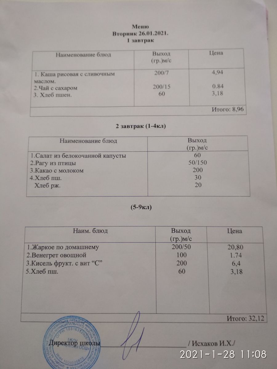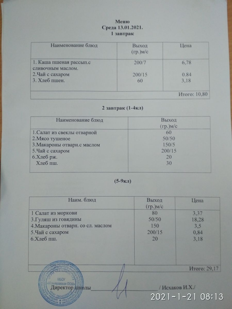 Меню МБОУ Минняровская ООШ на 21.11.2020