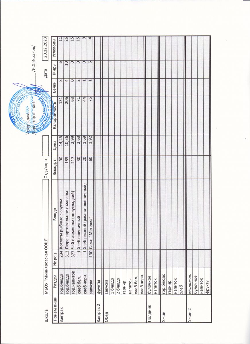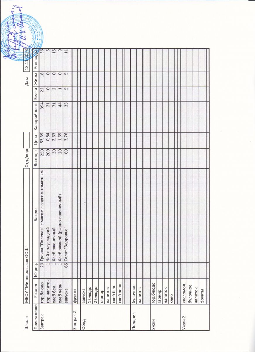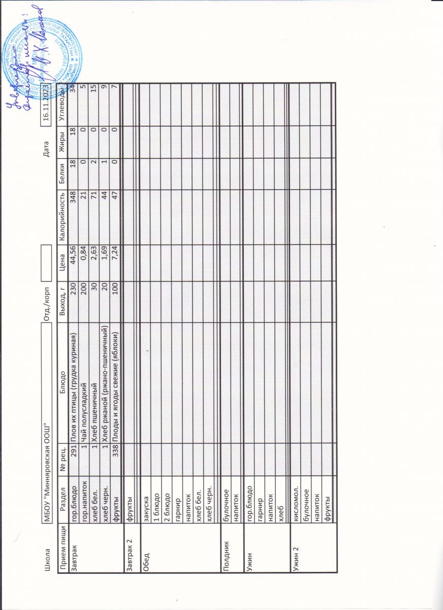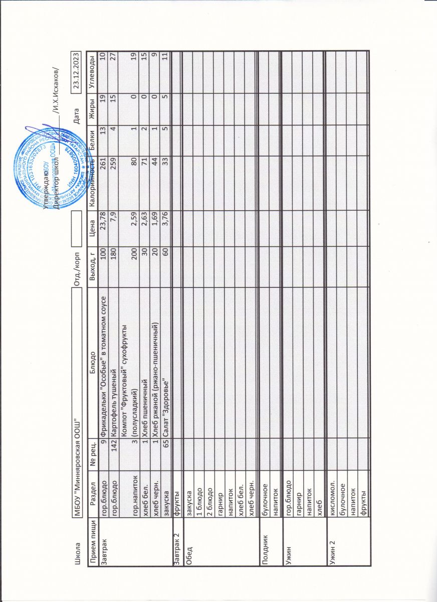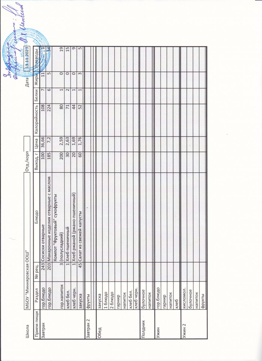 Меню МБОУ "Минняяровская ООШ" на 23.11.2020г.