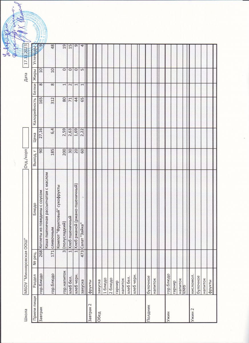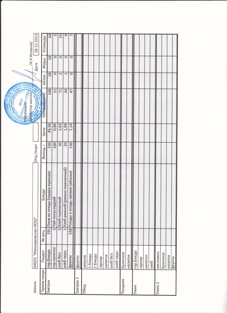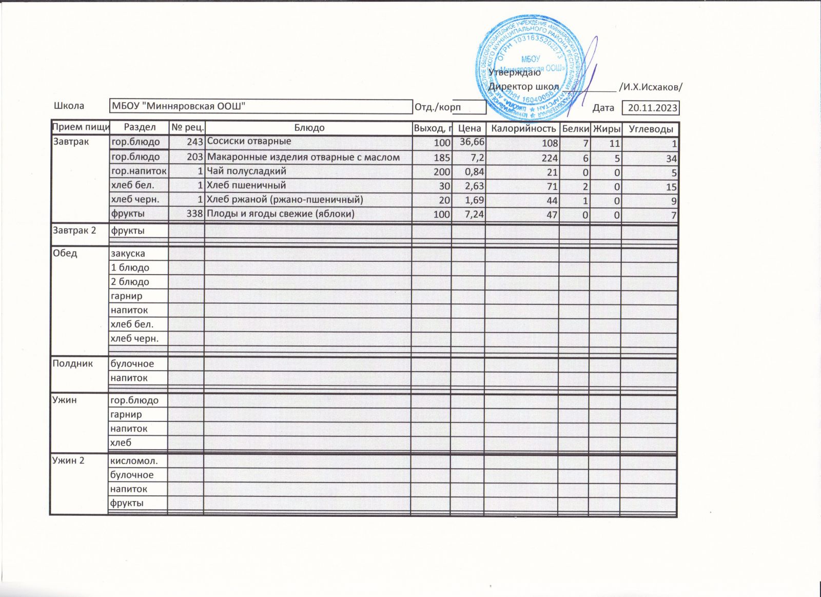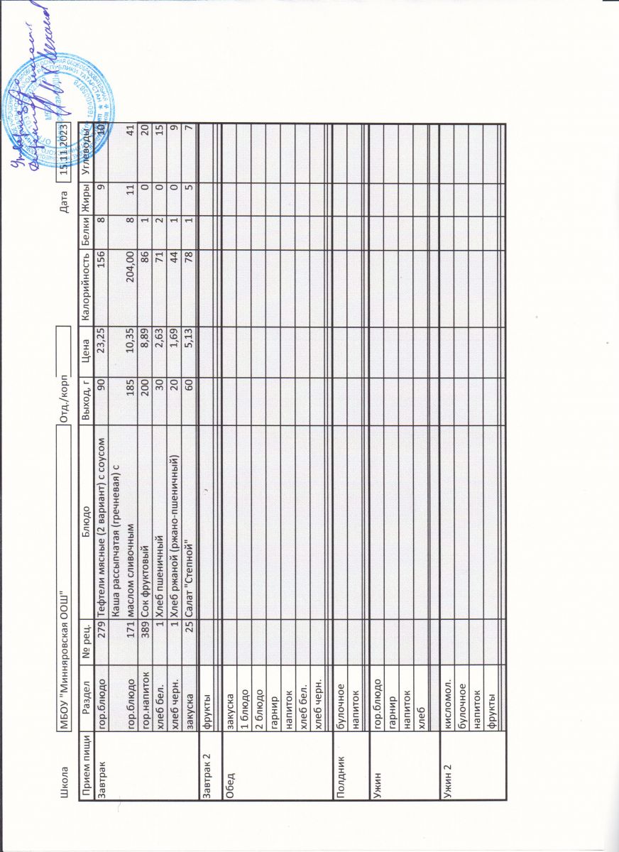 Меню МБОУ "Минняяровская ООШ" на 23.11.2020г.