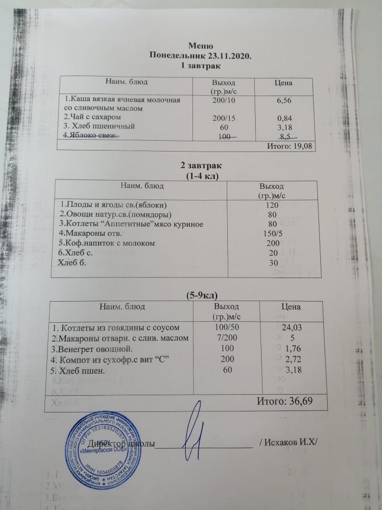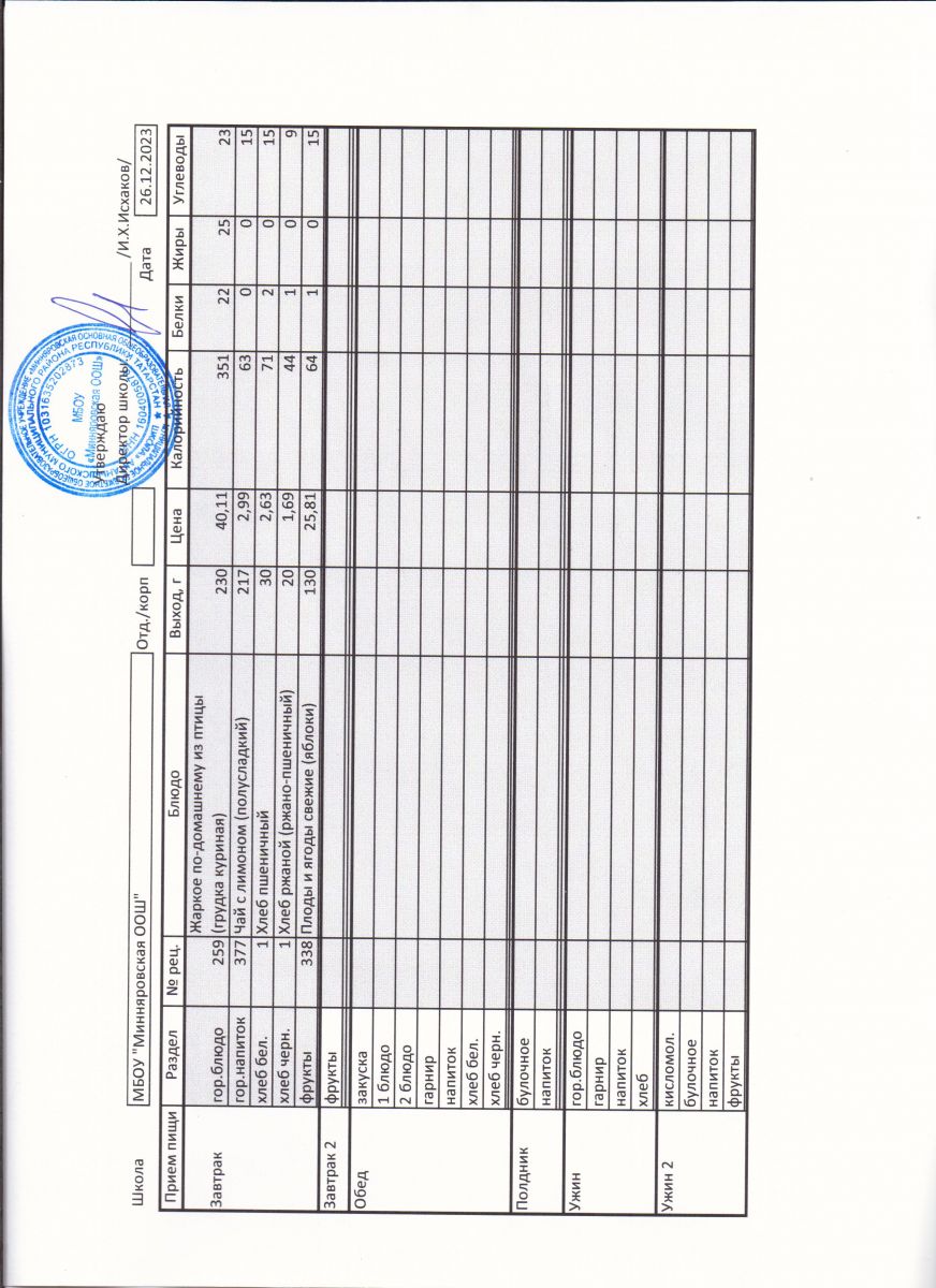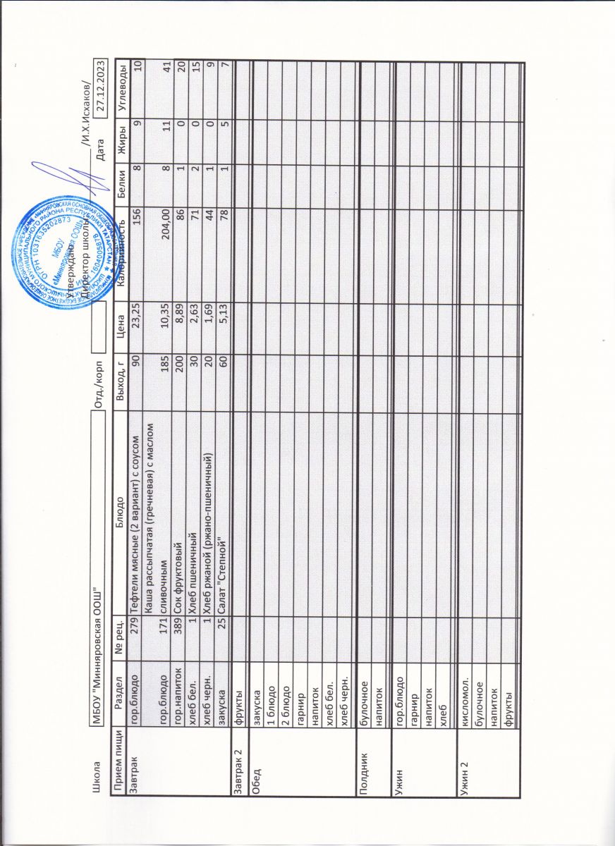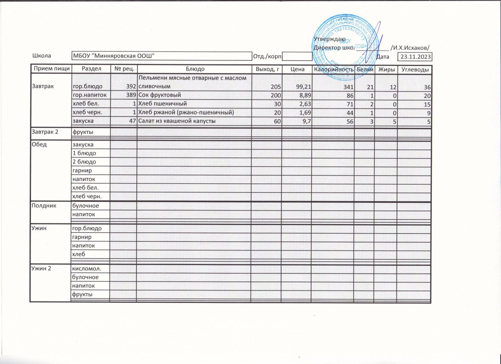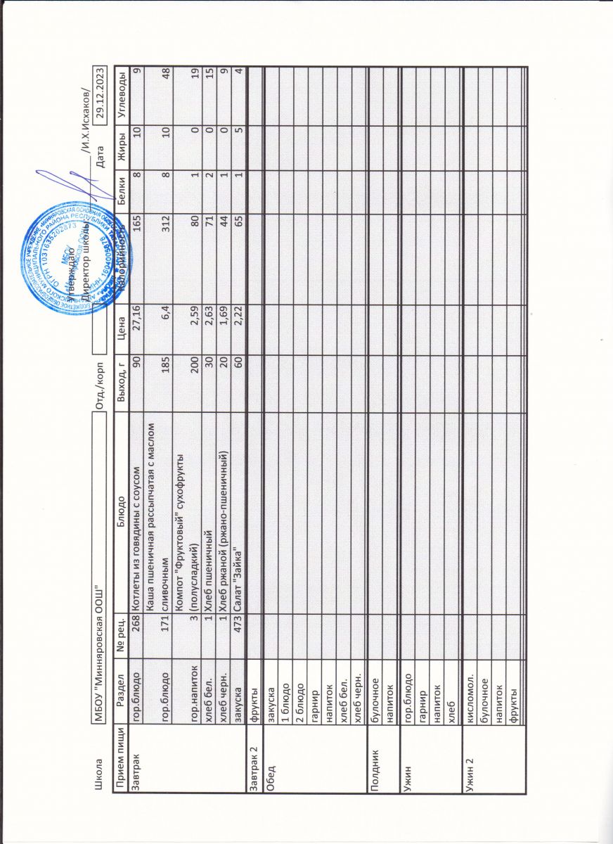 Меню МБОУ "Минняяровская ООШ" на 23.11.2020г.