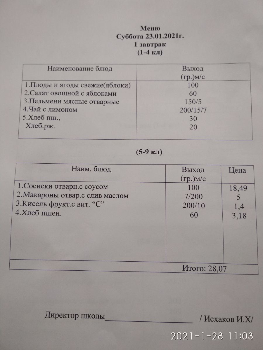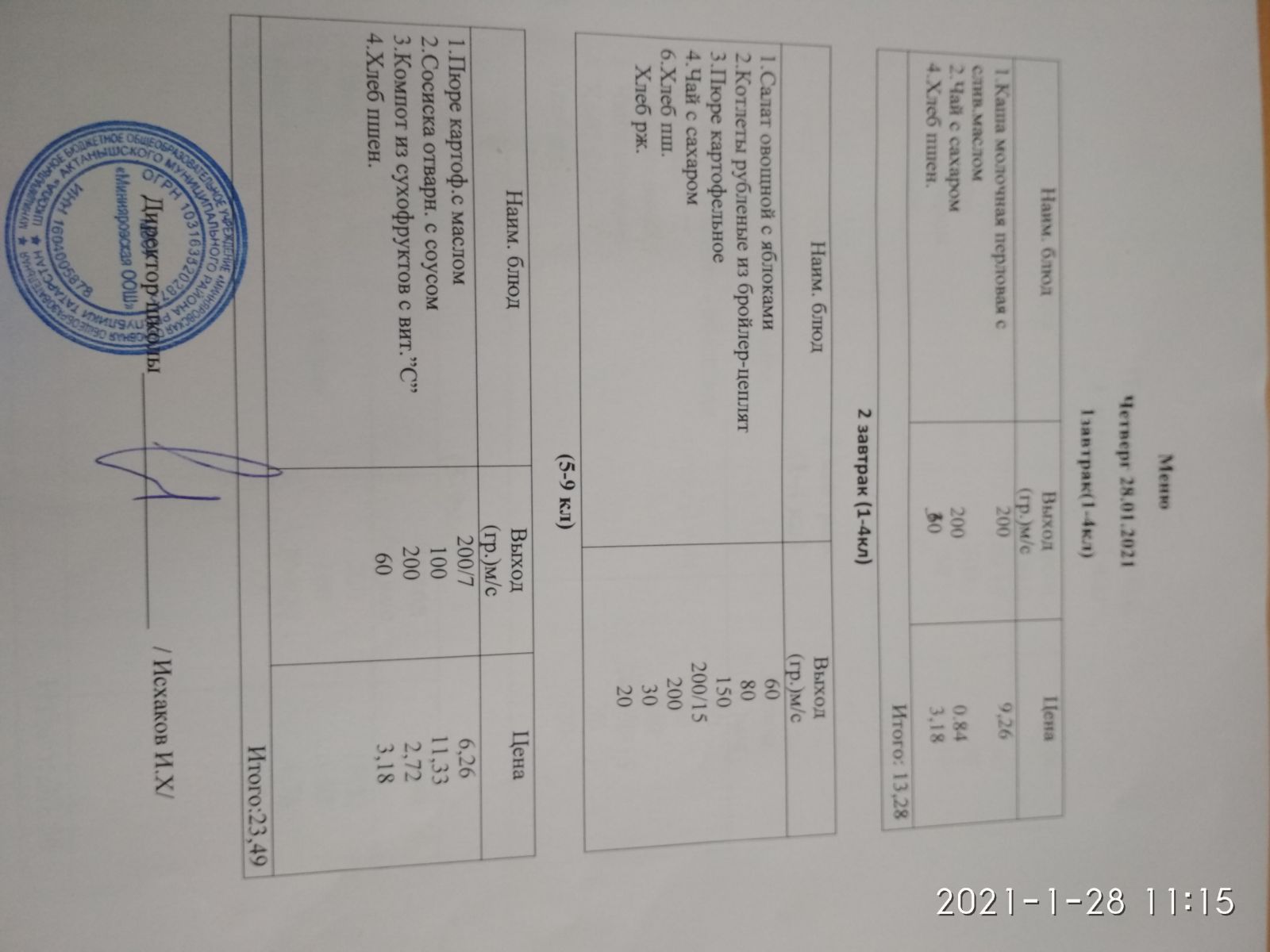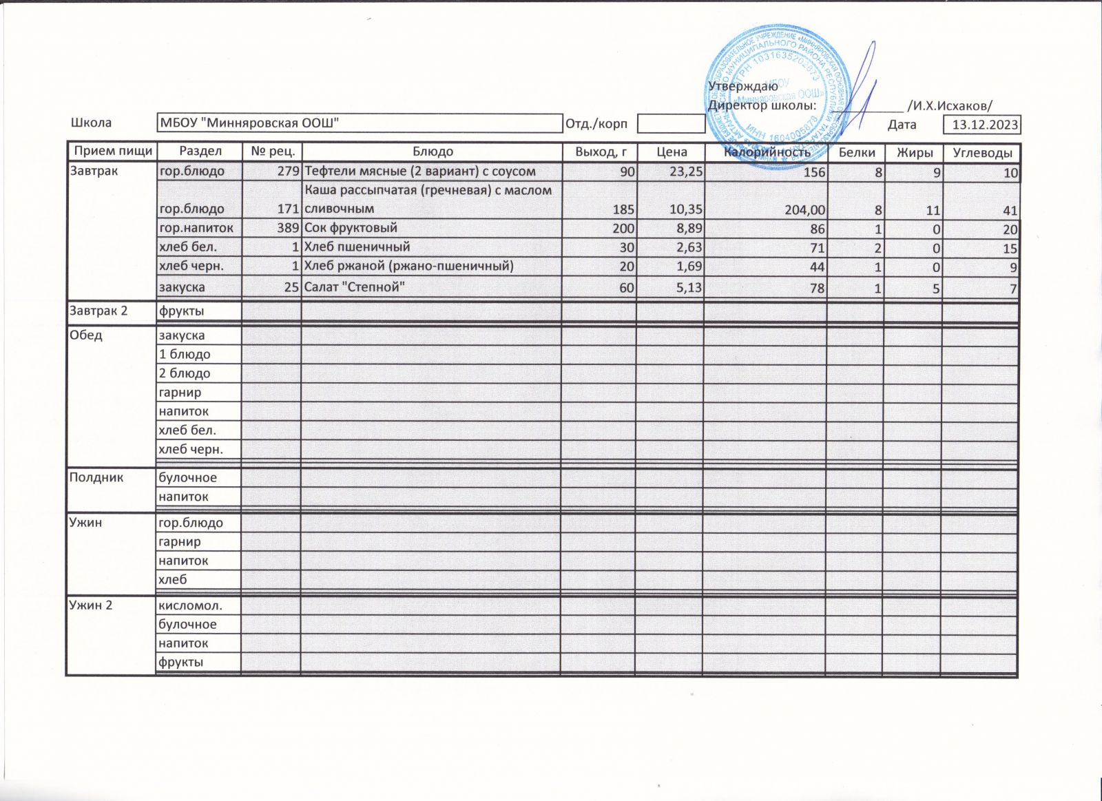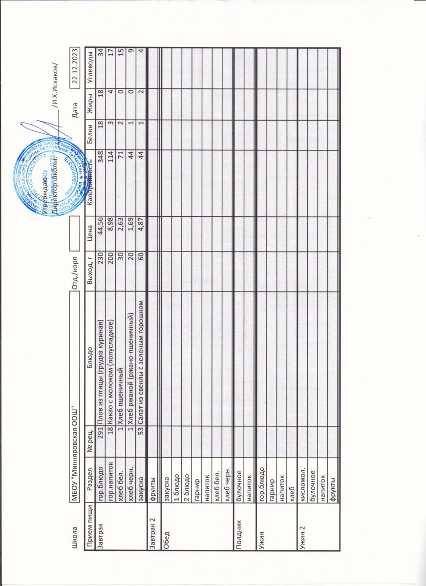 Меню МБОУ "Минняяровская ООШ" на 23.11.2020г.