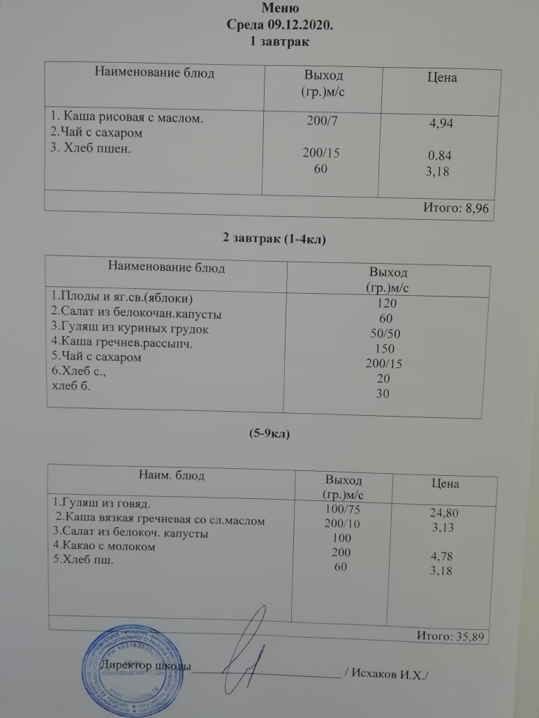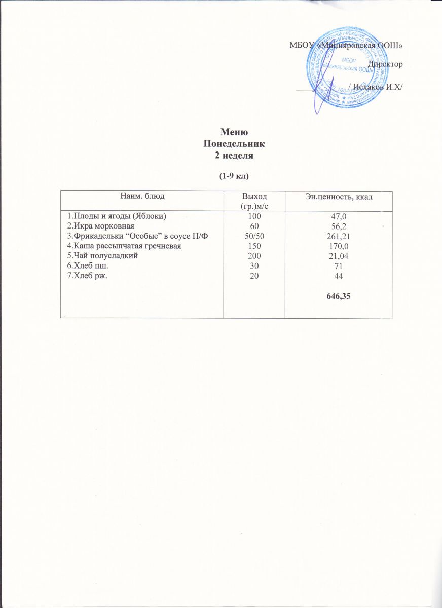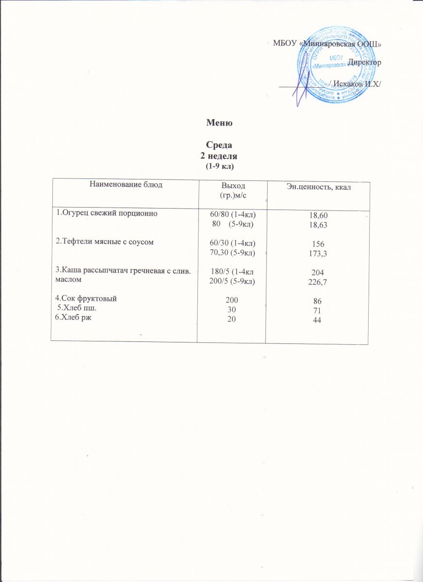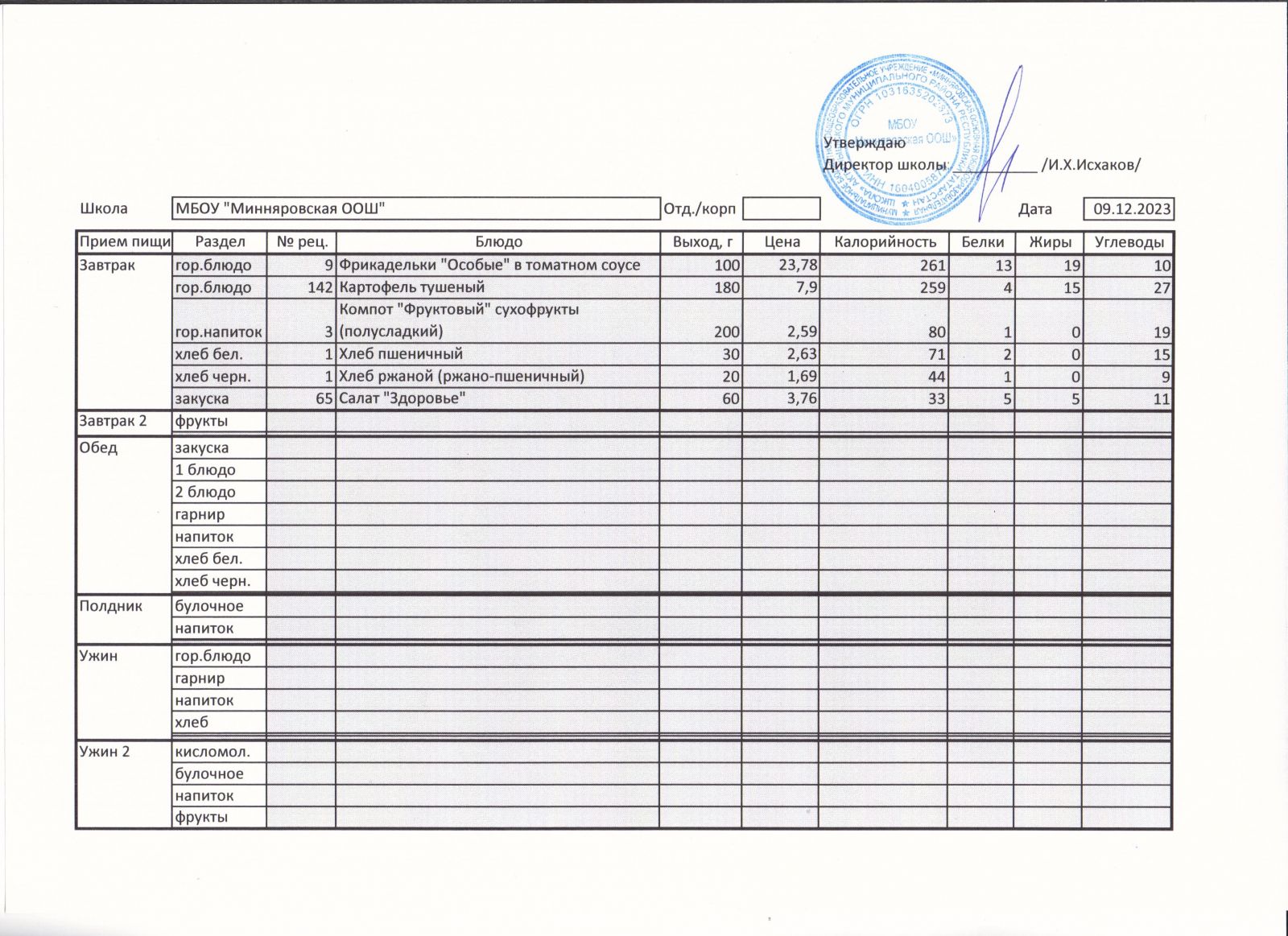 Меню МБОУ "Минняровская ООШ" на 9.12.2020