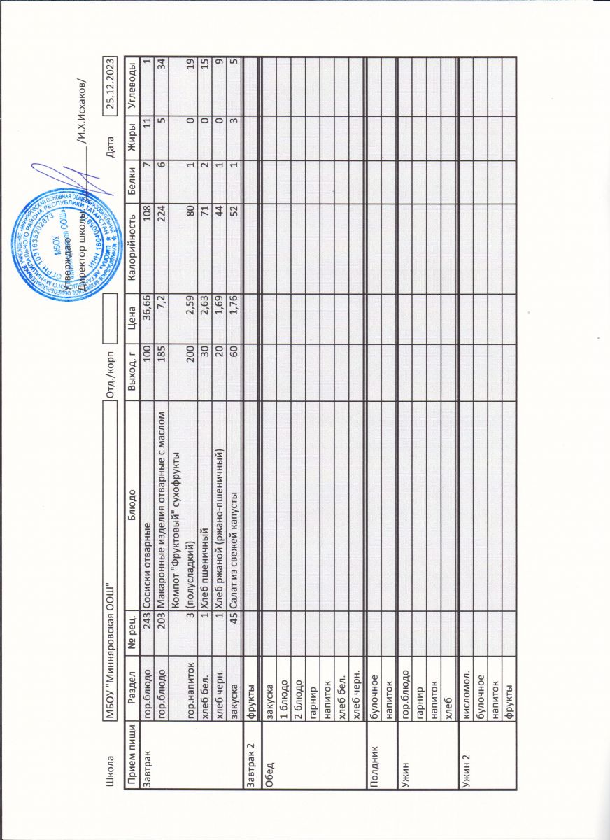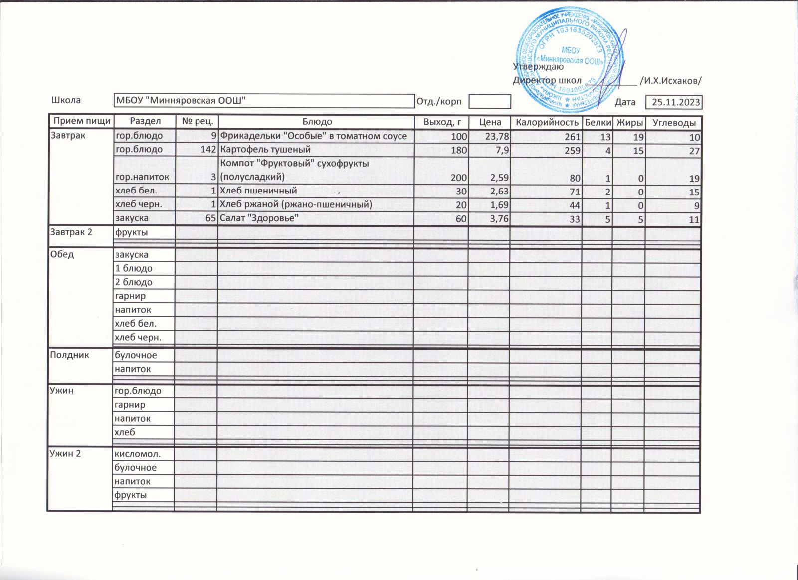 Меню МБОУ "Минняровская ООШ" на 25.11.2002г.