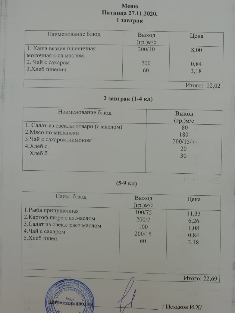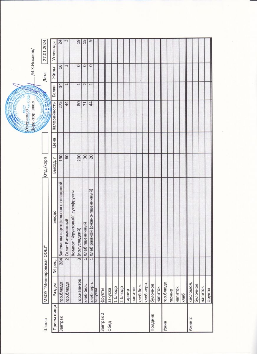 Меню МБОУ "Минняровская ООШ" на 27.11.2020г