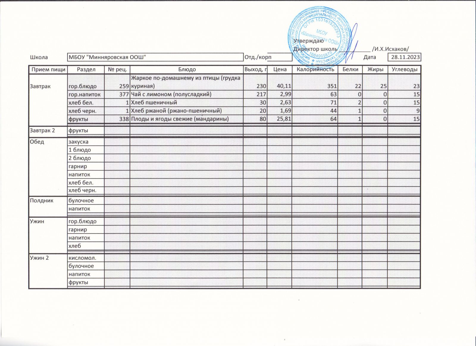 Меню МБОУ " Минняровская ООШ" на 28.11.2020г