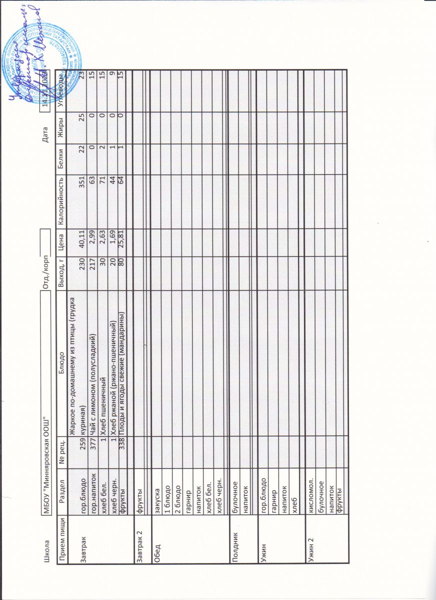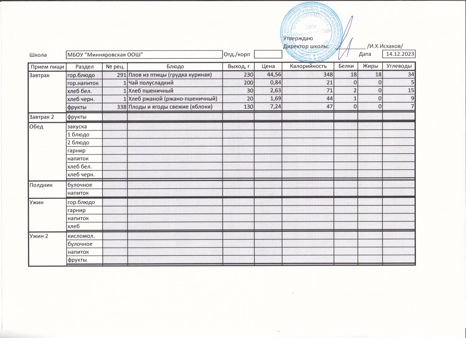 Меню МБОУ "Минняровская ООШ" на 14.12.2020