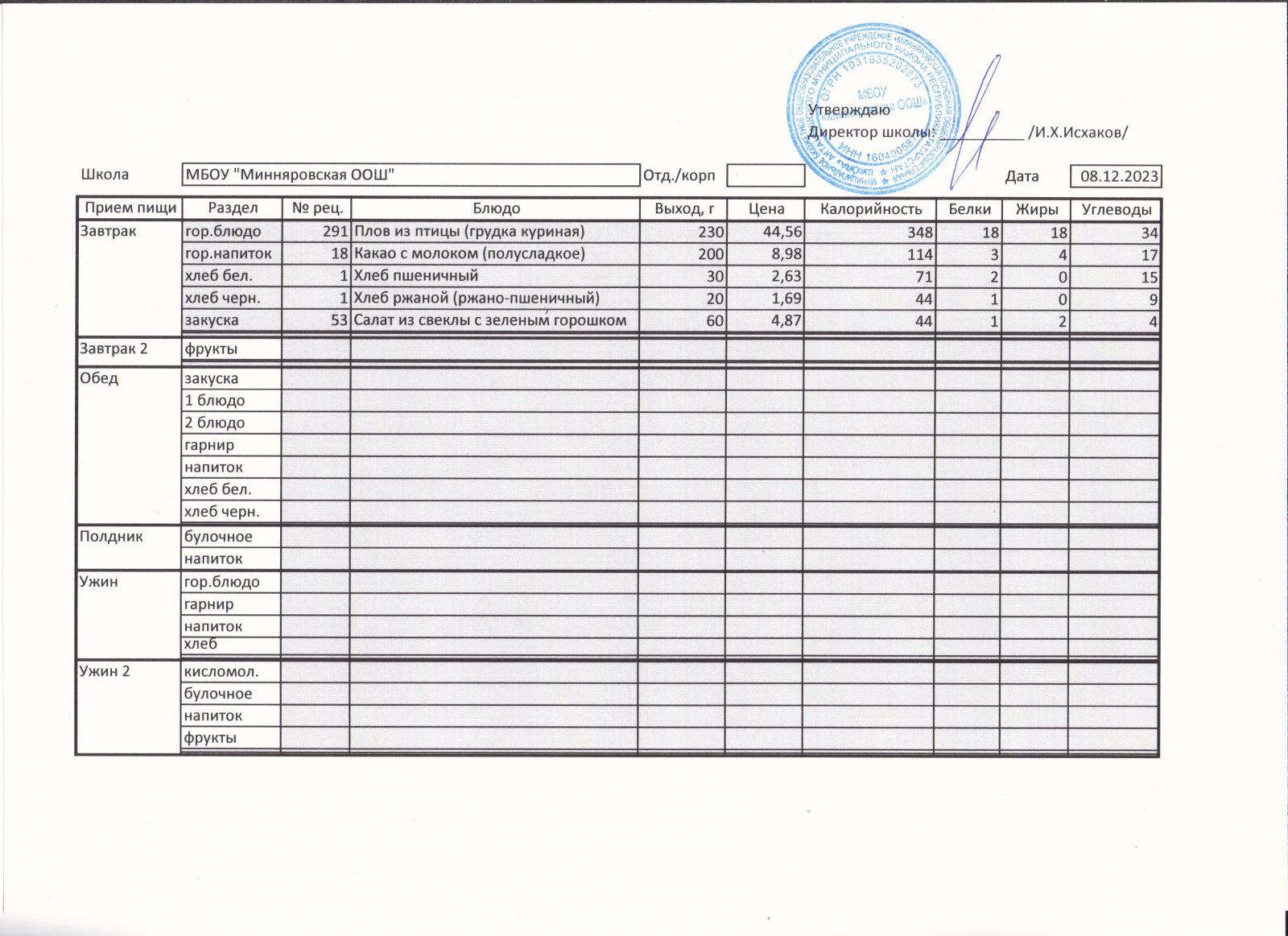 Меню МБОУ "Минняровская ООШ" на 8.12.2020