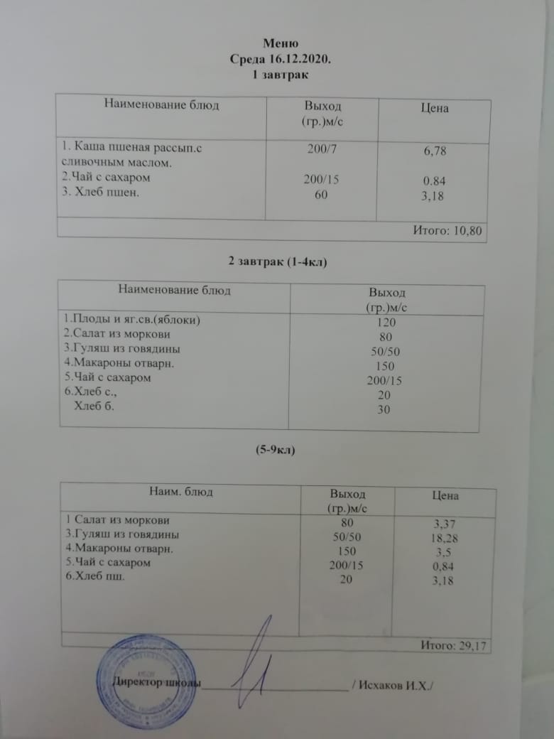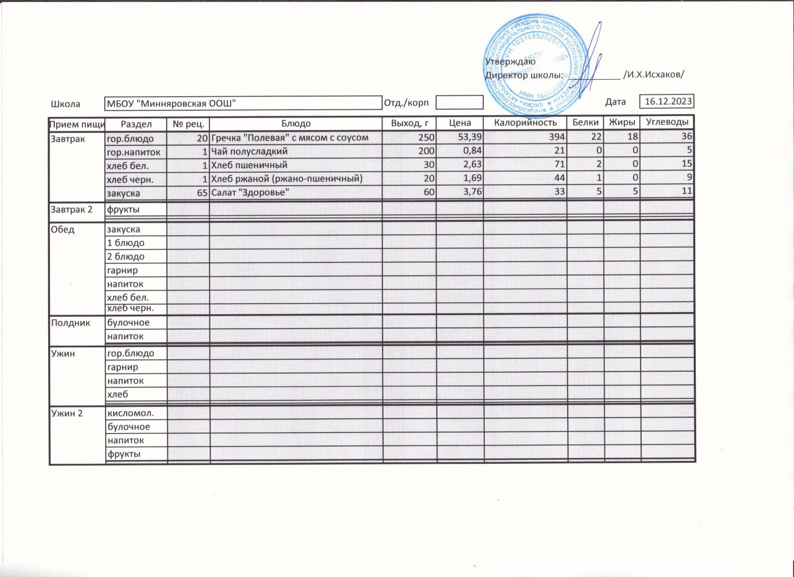 Меню МБОУ "Минняровская ООШ" на 16.12.2020