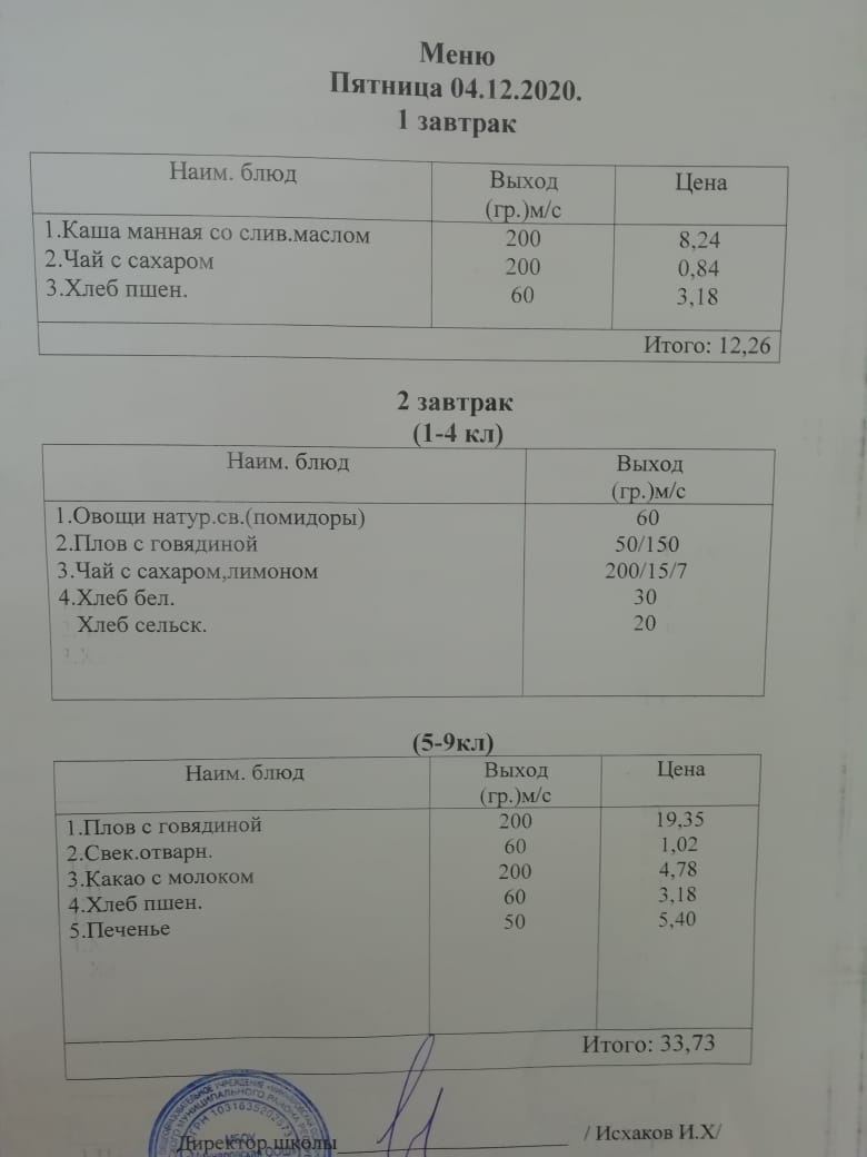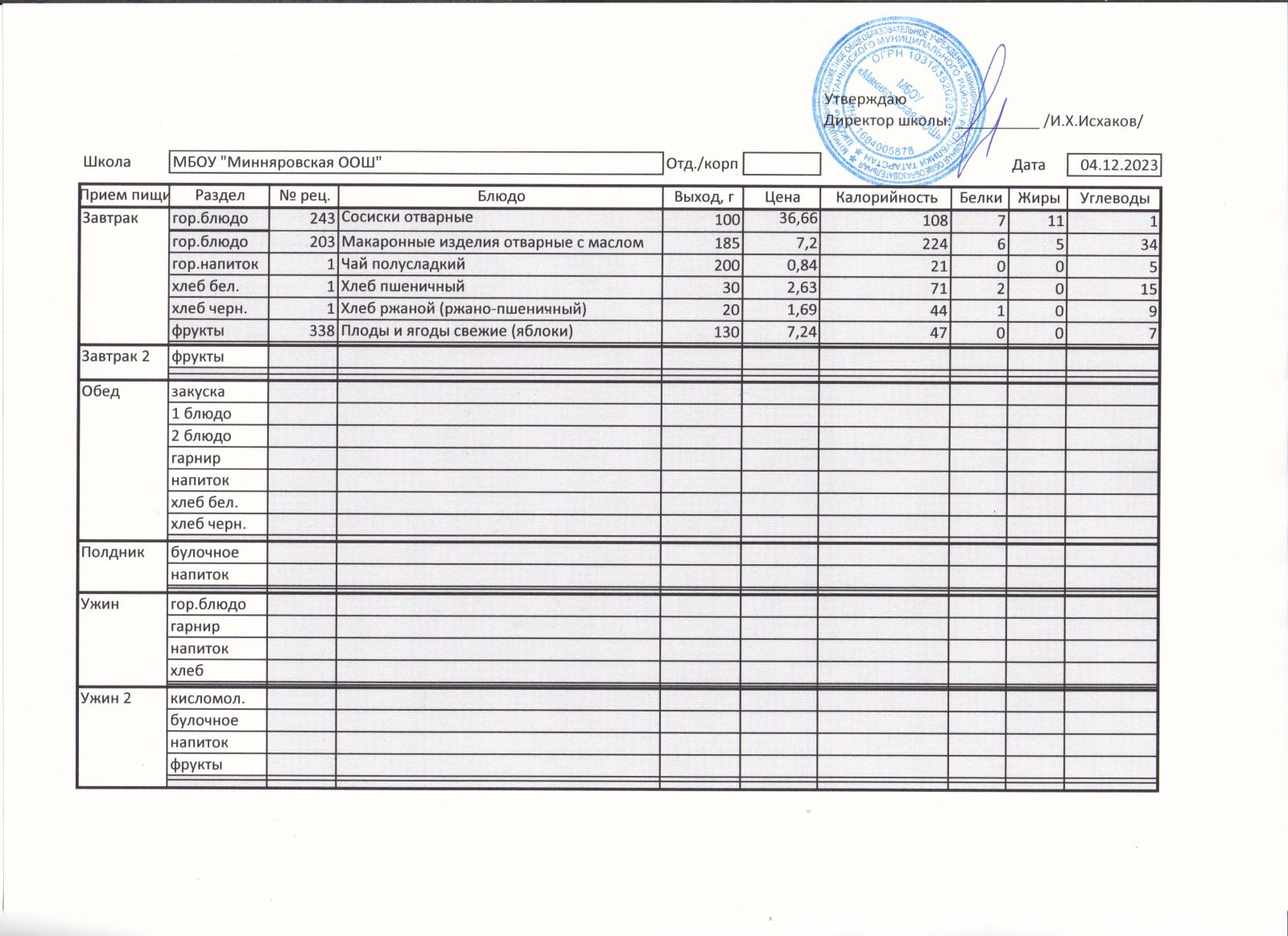 Меню МБОУ "Минняровская ООШ" на 4.12.2020