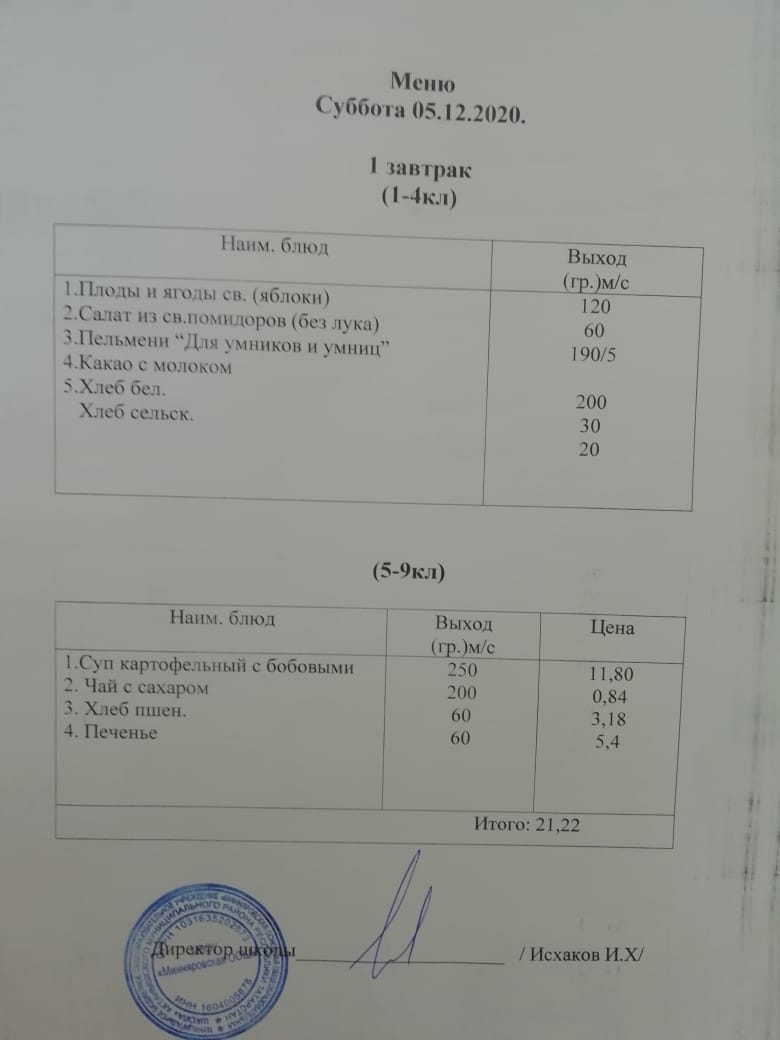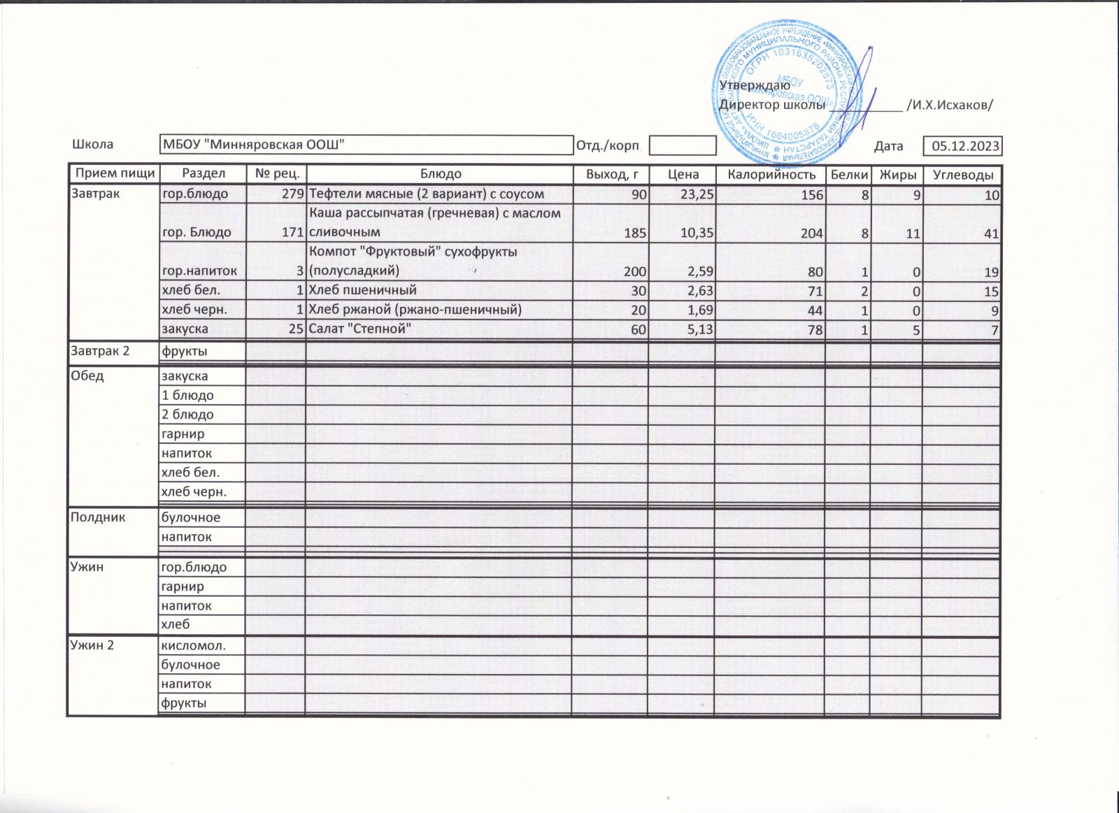 Меню МБОУ "Минняровская ООШ" на 5.12.2020
