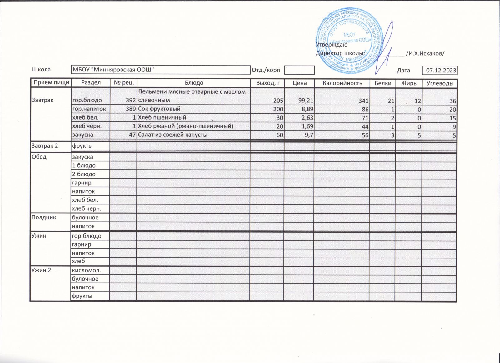Меню МБОУ "Минняровская ООШ" на 7.12.2020