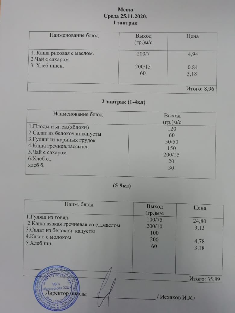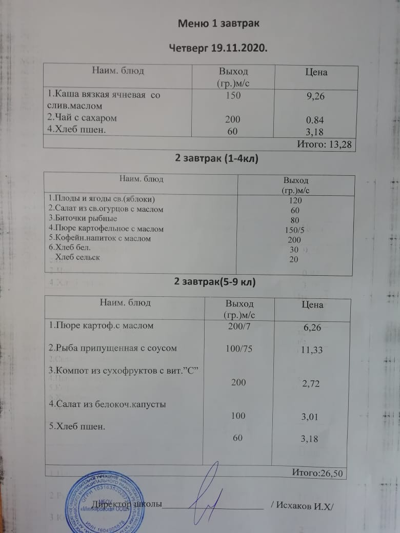 Меню МБОУ Минняровская ООШ на 20.11.2020