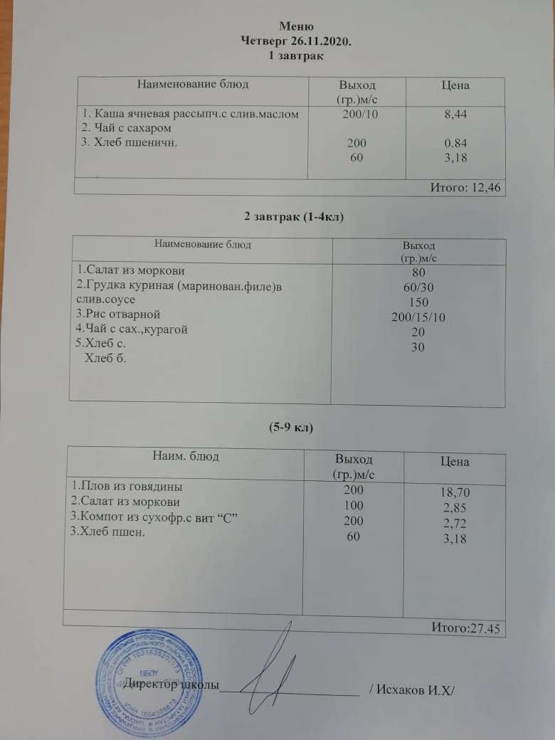 Меню МБОУ "Минняровская ООШ" на 26.11.2020г.