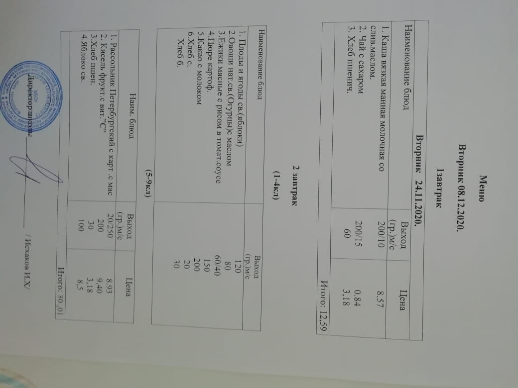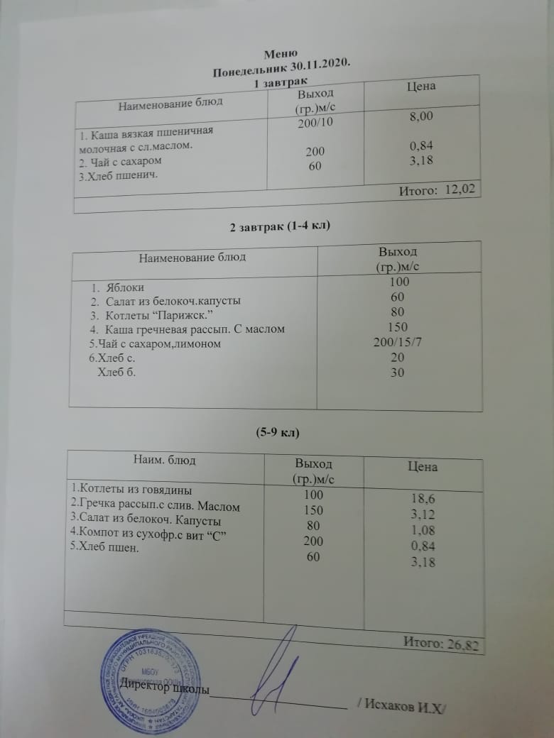 Меню МБОУ "Минняровская ООШ" на 30.11.2020