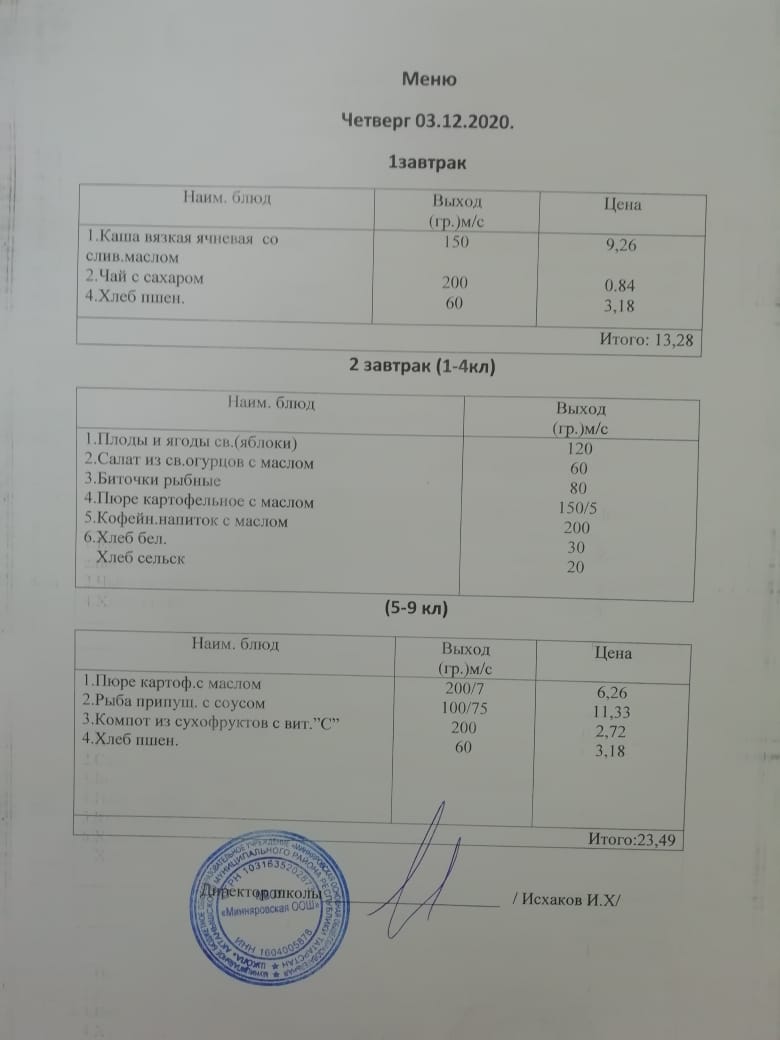 Меню МБОУ "Минняровская ООШ" на 3.12.2020