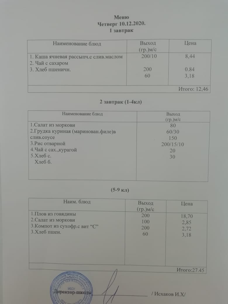 Меню МБОУ "Минняровская ООШ" на 10.12.2020